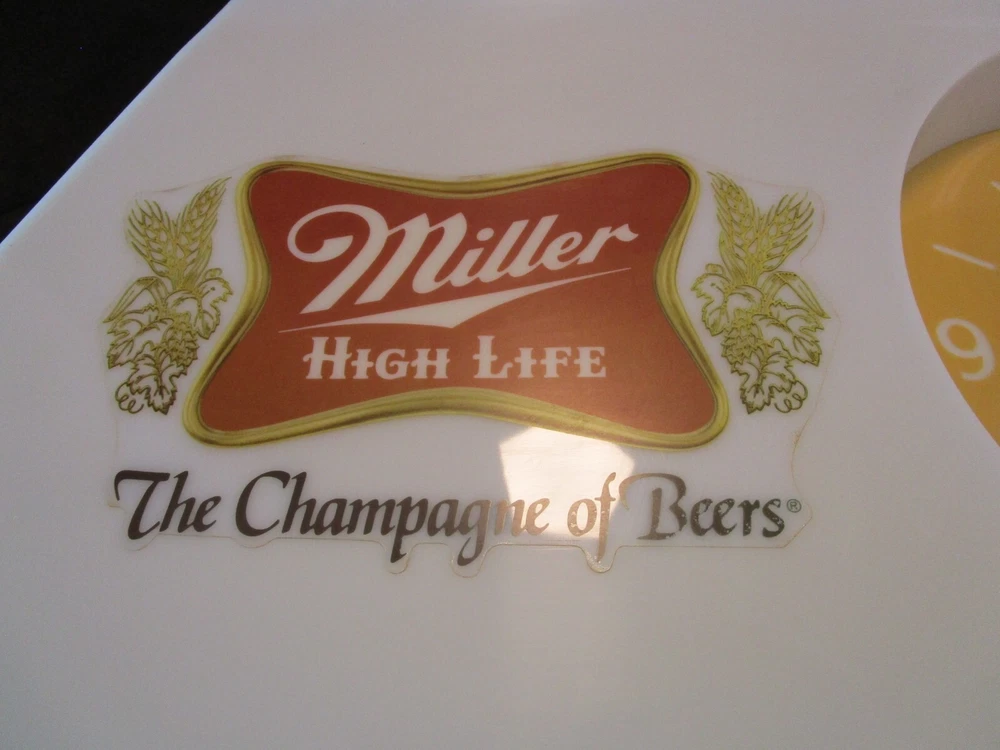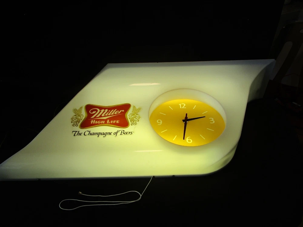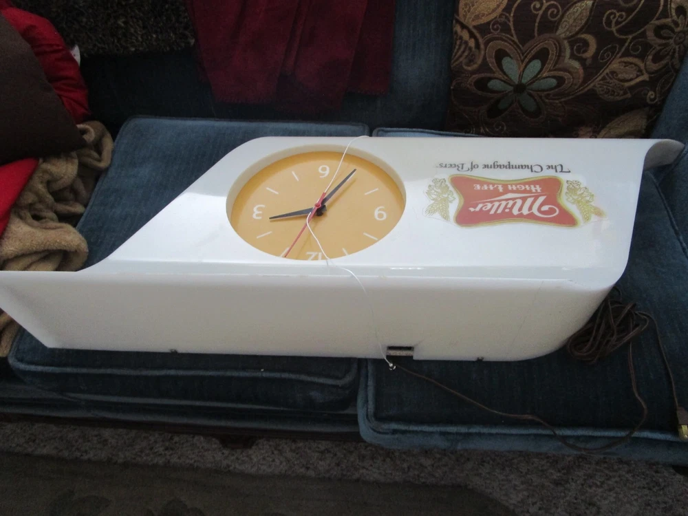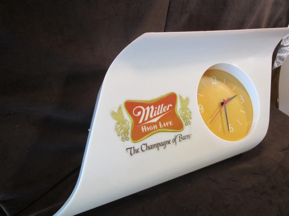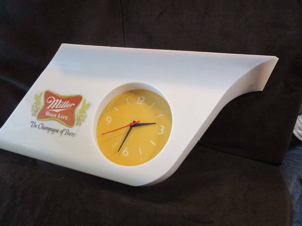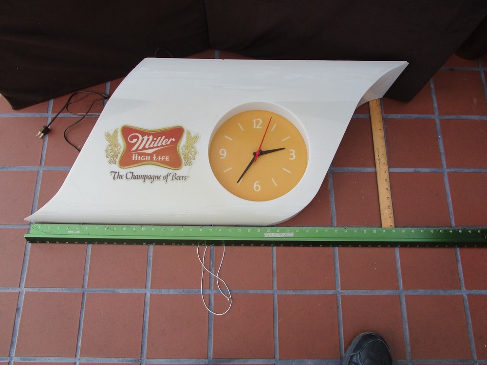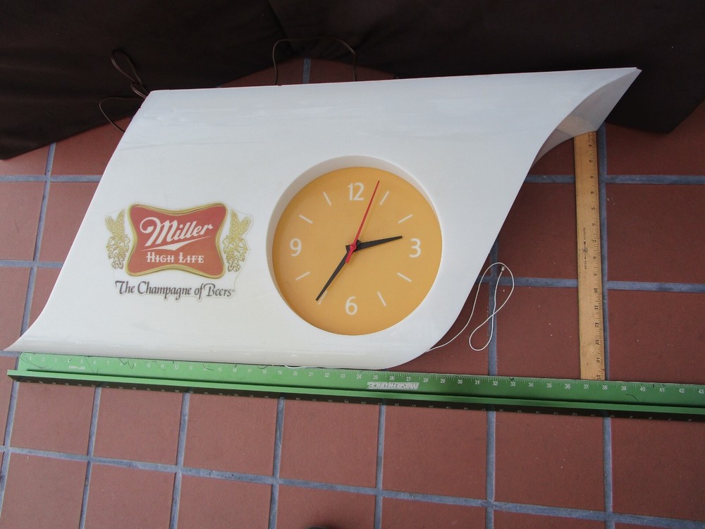 Description: 20/44/21/16 Book # 311 Mid Century Modern SHARK FIN Miller High Life Champagne of Beers Lighted Clock & Sign. Circa 1977 – Milwaukee Wisconsin USA Made by EVERBRITE Electric Signs Inc. in Wisconsin- Working Clock 10” across- with minute hand present and working. It is 38” wide x 15” tall and 7.5” deep Flat area on top is 24” W x 7.25” deep Unpacked weighs 10 pounds Pull cord light switch on the bottom turns the lights ON and OFF, but clock runs as long it is plugged in. Non- polarized 2 prong outlet on top Clock and lights are working, used bulbs included but not guaranteed to survive shipping. Nice vintage condition- Clean, no cracks or breaks, one chip on the upper corner to the right, and some fleabites to edges. Please zoom and view all pictures as they are part of the description. Email me with any questions you may have. I DO MY BEST TO DESCRIBE EVERY LISTING BUT I AM NOT AN EXPERT AND ITEMS ARE SOLD “AS IS”. My idea of great/good may be different than yours, so EXAMINE PHOTOS CAREFULLY since they are binding and a supplement to the word description in case, I should miss something. If I fail to mention something, it does not qualify as “item not as described” if it shows in my pictures. EACH PHOTO IS WORTH A THOUSAND WORDS AND THEY ARE OF THE EXACT ITEM YOU WILL RECEIVE. RETURN POLICY: Returns are acceptable ONLY if the item is defective, or grossly misrepresented. THIS MEANS I DO NOT ACCEPT RETURNS FOR FIT, SIZING, COLOR ISSUES, OR BUYER'S REMORSE. Please note: Buyer pays all return shipping and fees. · FEEDBACK I do not leave a feedback until the end of a transaction. The transaction is considered over once I receive feedback from you confirming that you have received it and expressed satisfaction with it. If you are unsatisfied with your purchase, please contact me before leaving a neutral or negative feedback- so I can fix the issues. Thanks again for shopping at our EBay store and look forward to serve you. Postage is fully tracked Email me with any questions. No reasonable offer refused.