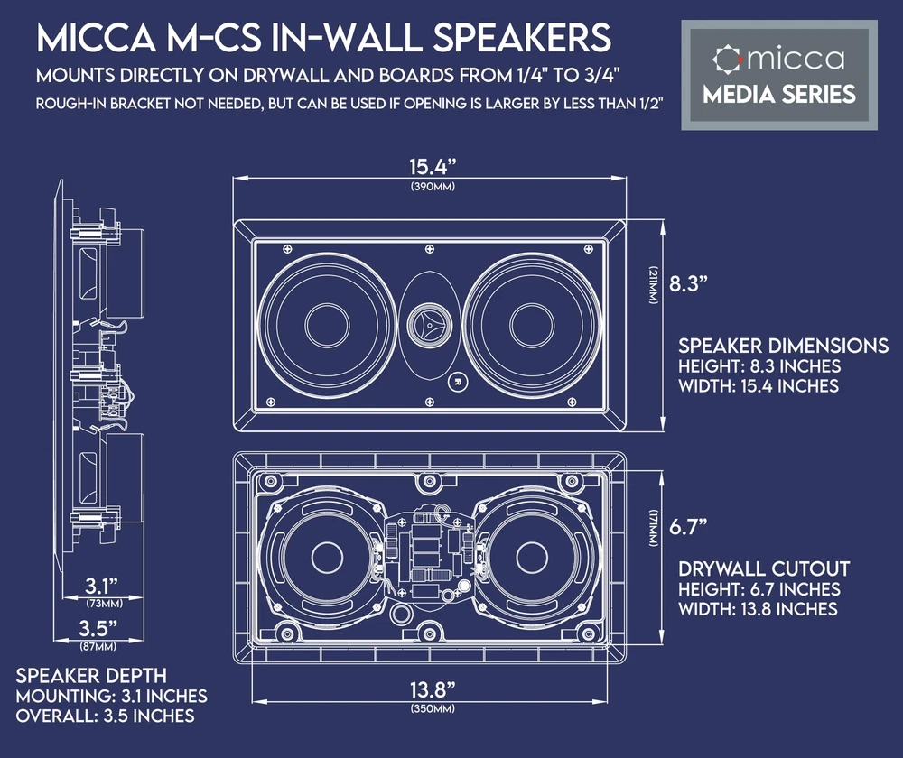 NOTE: This listing is for one speaker, buy as many as needed! The M-Series of in-wall and in-ceiling speakers have been designed for optimal performance in a wide variety of home entertainment applications, from providing relaxed background music to a high-impact 7-channel home theater system. Built with high-quality components and rigorously tested design, M-Series speakers deliver exceptional value and are well reviewed by owners and critics. Dynamic and Balanced The M-CS is a 2-way in-wall speaker with two high excursion 5.25" poly woofers and a 1" soft dome tweeter. This combination provides the utmost flexibility in terms of configuration and suitability to different types of audio tastes. In addition to smooth and natural vocals, the dual 5.25" woofers work together to produce great bass output, delivering impactful performance and ensuring seamless integration if a subwoofer is used. Imaging and Clarity The 1" soft dome tweeter provides abundant detail and clarity, generating solid and focused imaging for all sound sources in a spacious sound stage. Designed for a broadened listening sweet spot, the tweeter employs a diffuser to assist with the off-axis response as well as a pivoting mechanism to achieve proper aiming. Perfect integration between the tweeter and woofer is achieved through a 12dB crossover. Once installed and set up, the M-CS projects a realistic sound stage with excellent resolution. Specifications - Woofer: Dual Shielded 5.25” Poly-Mica - Tweeter: 1” Pivoting Silk Dome - Crossover: 12dB/Octave - Frequency Response: 60Hz-20kHz - Impedance: 8 Ohms - Sensitivity: 90dB 1W/1M - Power Handling: 120 Watts (Each) - Outer Dimension: 15.4" (W) x 8.3" (H) - Cutout Dimension: 13.8" (W) x 6.7" (H) - Mounting Depth: 3.1" UNCOMPROMISING AUDIO QUALITY - Media Series in-wall speakers are designed for optimal performance in a wide variety of home audio applications, from relaxing background music to high-impact home theater systems. Their smooth and natural sound signature with robust bass output deliver an engaging listening experience. EASY TO INSTALL - The built-in mounting tabs grab securely onto drywall or wood panels with no need for additional brackets or boxes. With durable construction and materials, in-wall speakers are great for family rooms, living rooms, bedrooms, kitchens, bathrooms, and covered outdoor porches, providing years of lasting enjoyment. MODERN AND ELEGANT - Using a rimed grill design, the Media Series in-wall speakers protrude minimally from the wall and blend unobtrusively into any decor. When painted to match the wall color, they become virtually invisible, giving you great sound without taking up valuable space. ENGINEERED FOR GREAT SOUND - The M-CS utilizes dual high excursion 5.25-inch poly woofers and a pivoting 1-inch silk dome tweeter that can be aimed to project a spacious sound stage, integrated through a 12dB crossover network. The M-CS can be installed horizontally as a center channel speaker, or vertically as front or surround channel speakers. SPECIFICATIONS - Frequency Response: 60Hz-20kHz; Impedance: 8 Ohms; Sensitivity: 90dB 1W/1M; Power Handling: 120 Watts (Each); Outer Dimension: 15.4” (W) x 8.3” (H); Cutout Dimension: 13.8” (W) x 6.7” (H); Mounting Depth: 3.1”