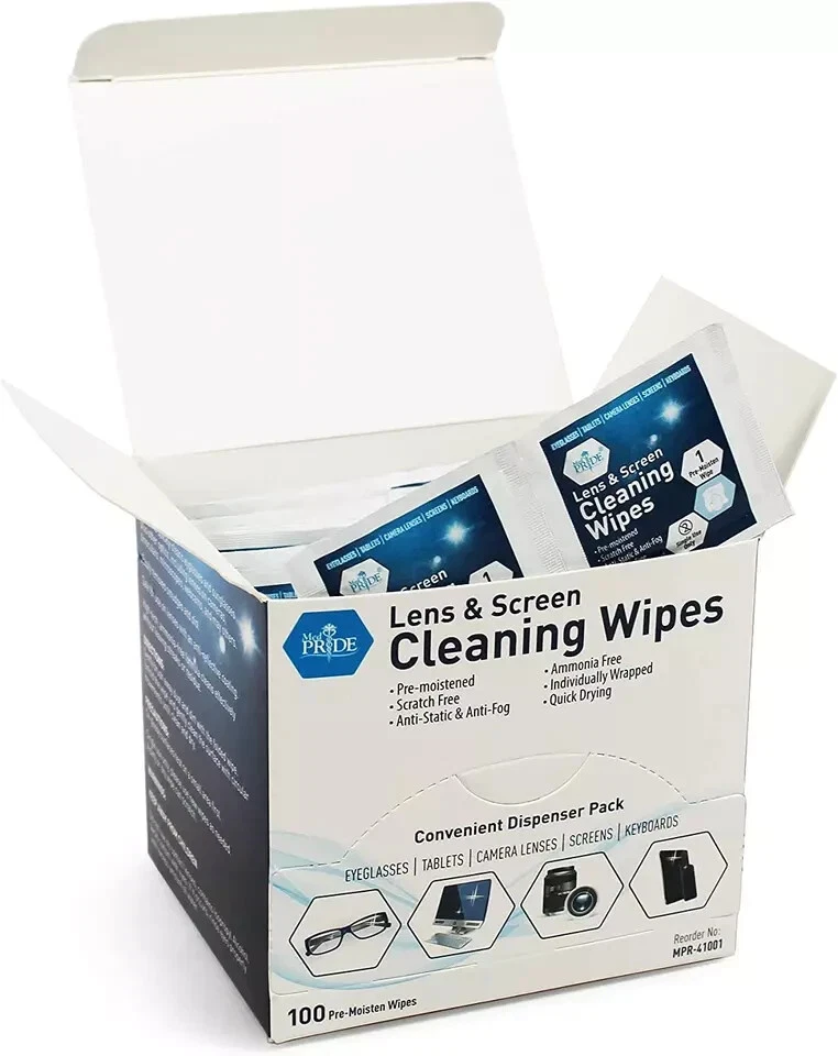 MED PRIDE Premoistened Lens Wipes | Anti-Static, Anti-Fog, Quick-Dry & Scratch-Free| 100 Cleaning Cloths for LED Touch Screen, Iphones, Ipads, Computer Monitors, Eyeglasses, Camera Lenses, Laptop Description Package Dimensions 4.61 x 4.41 x 4.06 inches; 9.59 ounces Package Quantity 100 Product Description PRE-MOISTENED LENS WIPES BY MEDPRIDE Medpride is proud to announce its next addition to our high-end line of disposable products, the Medpride premoistened Lens Wipes. Our wipes are soft, wet cleaning cloths that are ideal for really sensitive surfaces that are easily scratched when cleaned with regular paper towels.