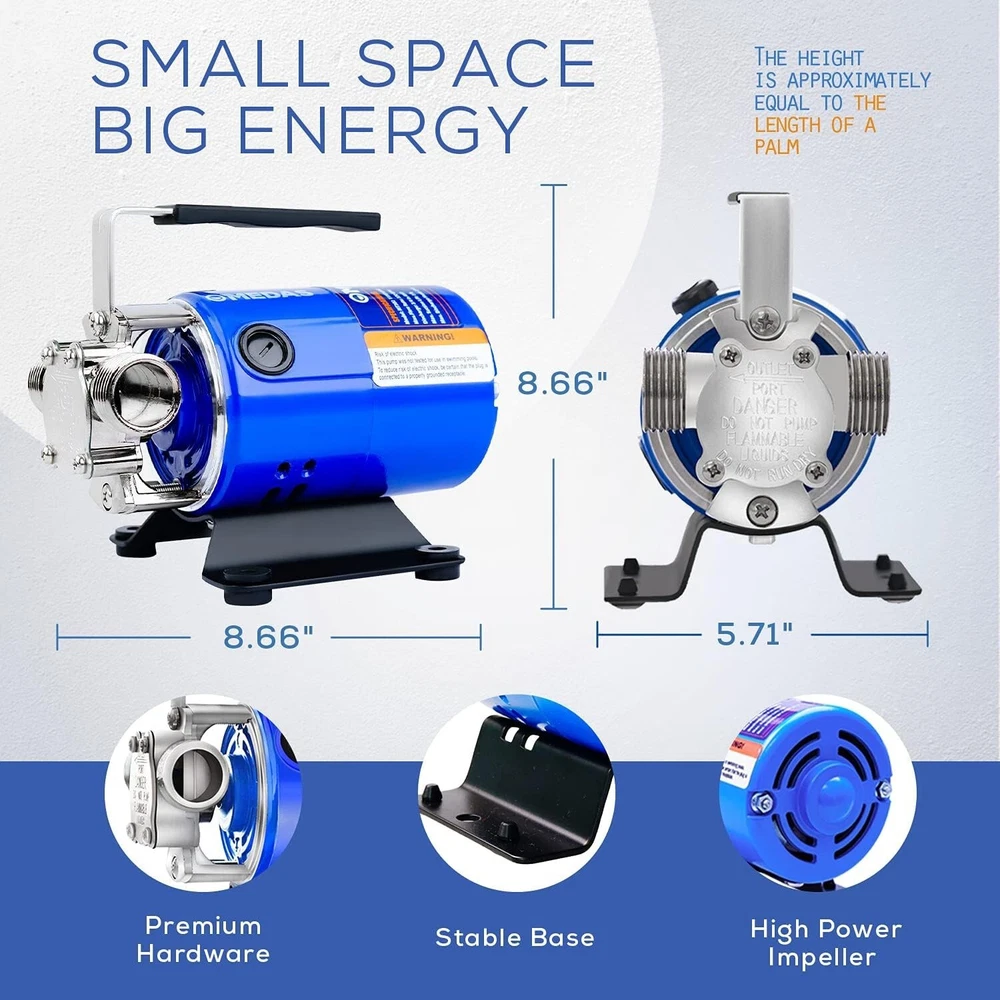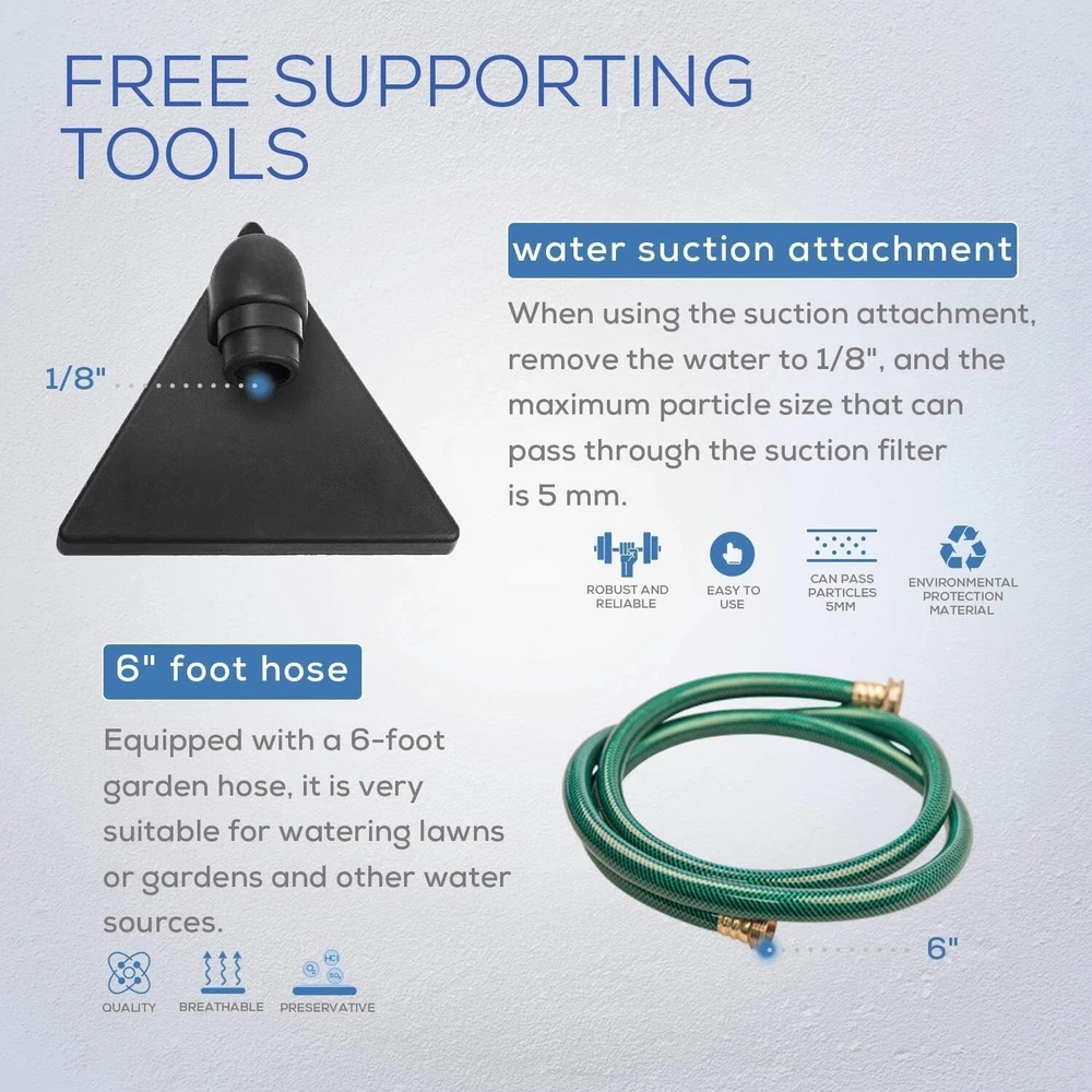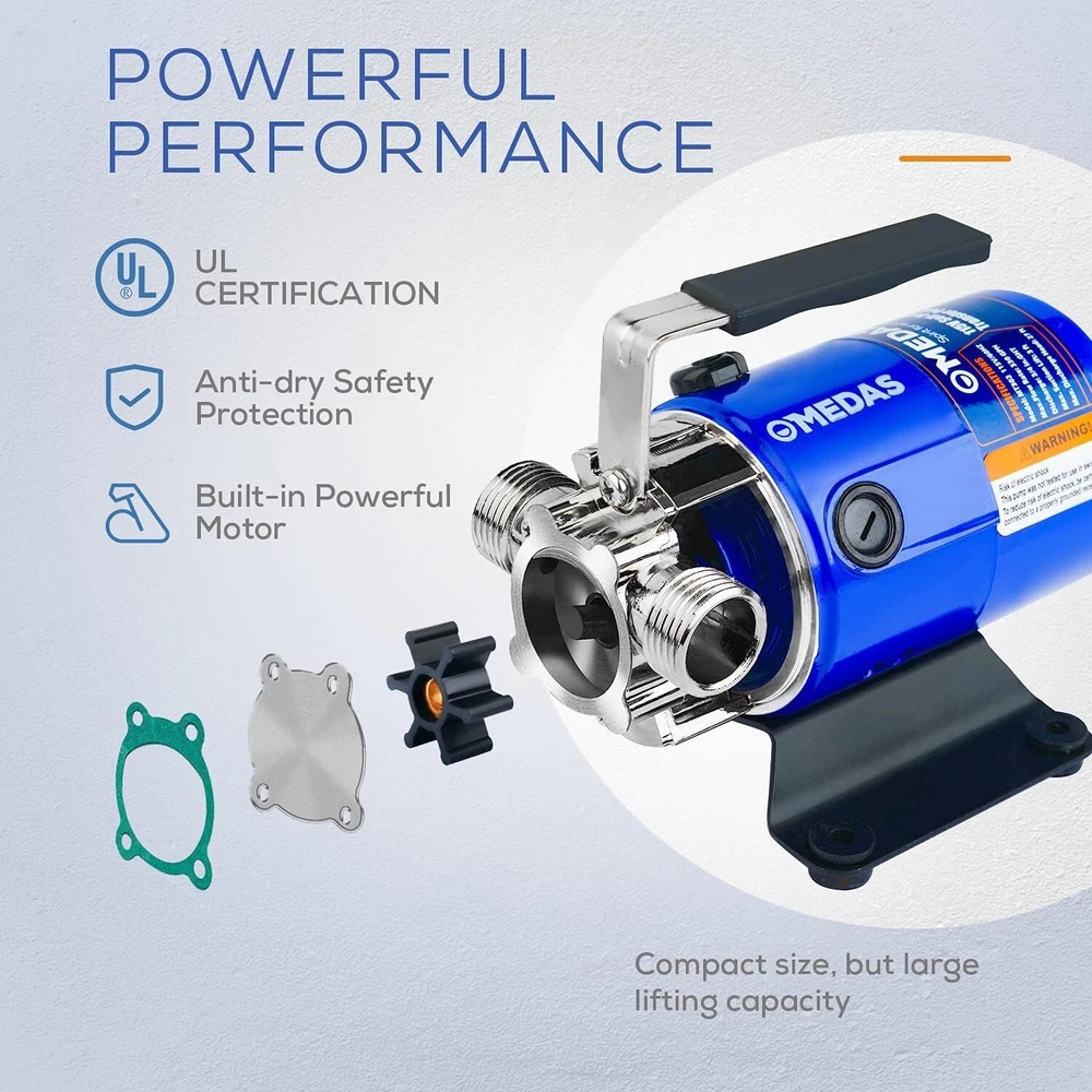VOLTS/FREQUENCY: 115 V/60 HZ; POWER:1/10 HP; MAX FLOW RATE: 330 GPH; MAX HEAD: 44 Feet; MAX SUCTION LIFT: 6 Feet. This PORTABLE PUMP made of durable material, the house material is Powder Coated Carbon Steel, and the impeller material is NBR Rubber, the hose connectors is made of Metal which is higher reliability than plastic threads. This is a LIGHT WEIGHT and PORTABLE self-priming pump with a convenient carry handle. This water pump is easy-to-operating and easy-to-service, connect hoses, plug in and you’re ready to go. PLEASE fill the water in the PUMP HEAD before First-Time use! This TRANSFER PUMP includes 6 feet SUCTION HOSE and WATER SUCTION STRAINER ATTACHMENT as well as an additional IMPELLER REPLACEMENT KIT. If use water suction attachment, this water pump can remove water down to 1/8 inch of surface. MULTIPLE APPLICATIONS: MEDAS water transfer utility pump is the perfect tool for aquariums, outdoor ponds, swimming pools, leaks and flooding in basements, flushing a tankless water-heater, etc; Not just for utilities, it also works well to water your lawn and garden