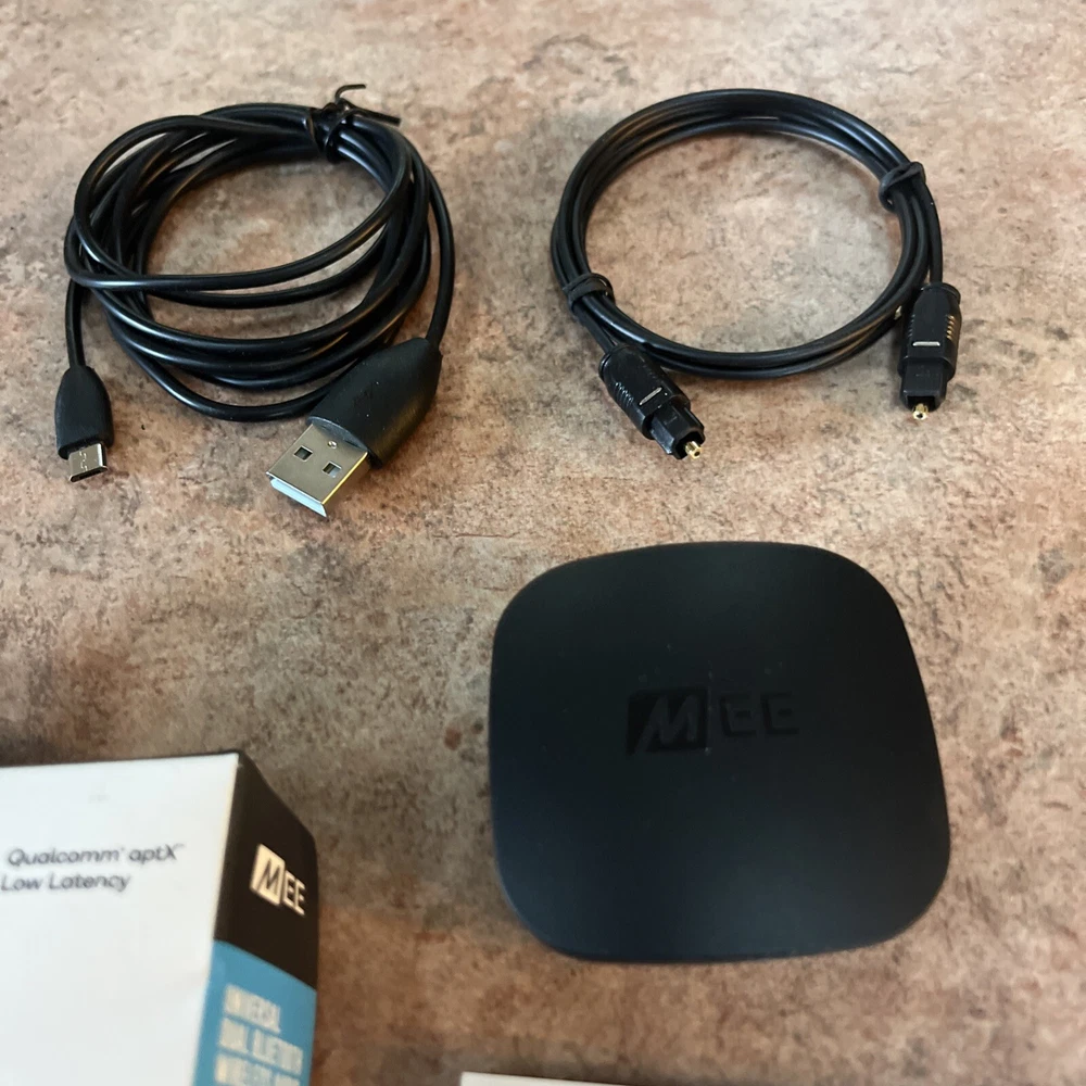 The MEE Connect Universal Bluetooth Wireless Audio Transmitter is a black device with 3.5mm audio input connection. It supports AM/FM bands and has both wired and Bluetooth wireless output connections. It has two audio inputs - digital audio optical TOSLINK and 3.5mm. This Bluetooth audio transmitter weighs 4 oz and is designed for Bluetooth wireless connectivity, with a USB 2.0 power source. It comes with a 1-year manufacturer warranty.