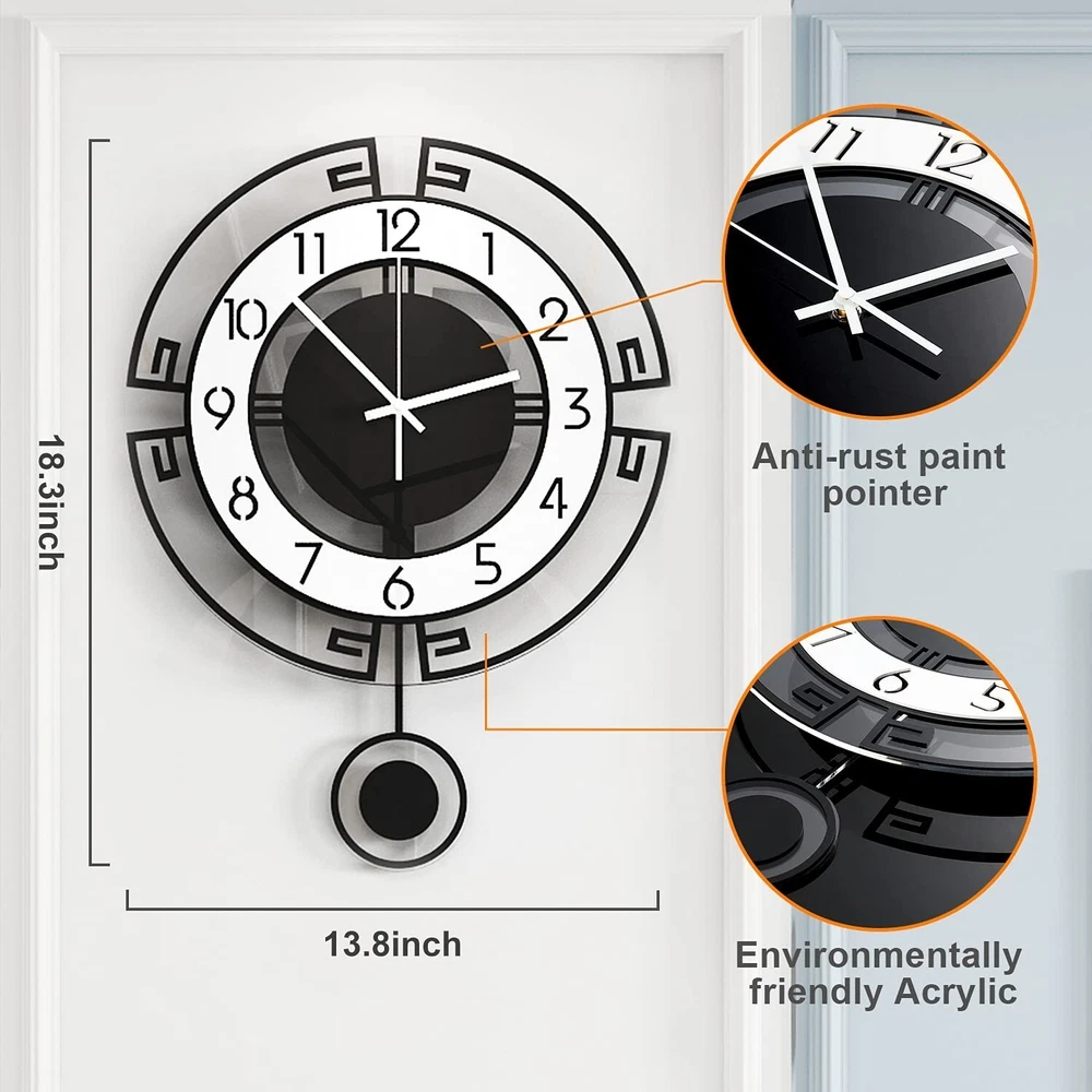 MEISD Wall Clock for Living Room Decor, 18.3 Inch Big Decorative Wall Clocks for Bedroom Kitchen Home Office,Modern Wall Clock Battery Operated, Large Silent Wall Clock Non Ticking, Analog Display Product Details Size: 18.3 Inch Brand: MEISD UPC: 726476364254 EAN: 0726476364254 MPN: Does not apply Brand: MEISD Color: Black/White Display Type: Analog Style: Modern Special Feature: Silent Clock Product Dimensions: 13.8"W x 18.3"H Power Source: Battery Powered Age Range (Description): Adult Room Type: Kitchen Shape: House Brand: MEISD Color: Black/White Display Type: Analog Style: Modern Special Feature: Silent Clock Product Dimensions: 13.8"W x 18.3"H Power Source: Battery Powered Age Range (Description): Adult Room Type: Kitchen Shape: House Indoor/Outdoor Usage: Indoor Material: Acrylic Theme: Modern Frame Material: Metal Are Batteries Included: No Mounting Type: Wall Mount Item Weight: 2.04 Pounds Alarm Clock: Yes Watch Movement: Quartz Number of Items: 1 Operation Mode: Electrical Dial Color: White Clock Form: Pendulum Size: 18.3 Inch Manufacturer: MEISD UPC: 726476364254 Item Weight: 2.04 pounds Country of Origin: China Batteries required: No Great for Decor: MEISD wall clocks for living room decor is 13.8*18.3 inch. This modern creative Design will dress up any occasion's decor perfectly, like living room, kitchen, bedroom, home, office, dining room and so on. Simple to Use & Battery Operated: Detailed user manual guide you how to hang up this decorative pendulum wall clock easily. This modern wall clocks battery operated is Powered by 2 AA batteries (not included). one for quartz movement,another for pendulum. Accurate and Quiet: The silent non ticking wall clock's precise quartz sweep movement ensures accurate time and no any loud annoying ticking sounds, helping you enjoy peace as time goes by. Unique features: This wall clock for kitchen is made of superior quality double layer acrylic with Hollowed out numeral design , sturdy and elegant. Analog time display ensures it is easy to read, keeping track with time closely. Perfect for Giving Gift: Our wall clocks battery operated decorative is a perfect choice for your family and friends as Mother's day gift, father's day gift, Christmas gift, birthday gift, housewarming's gift, anniversary gift and wedding gift.