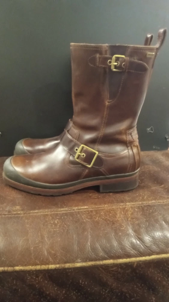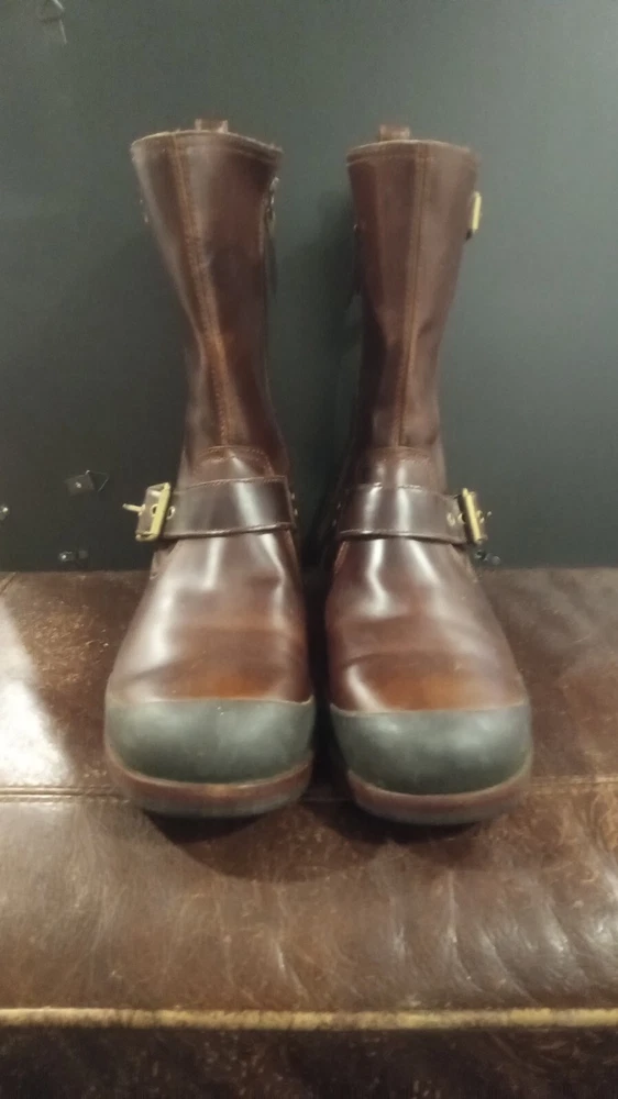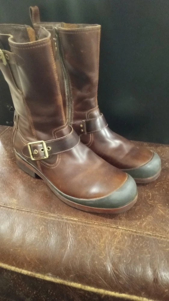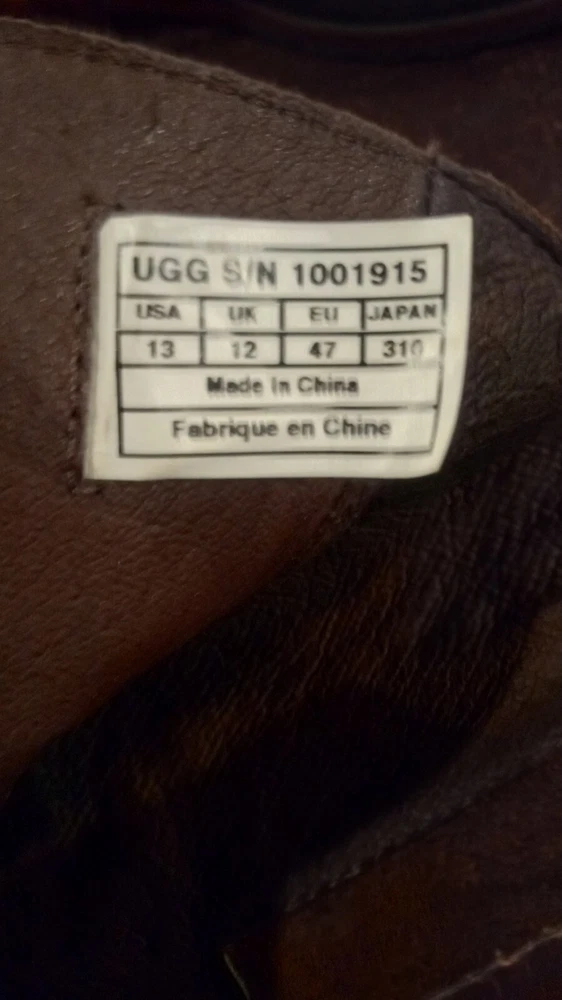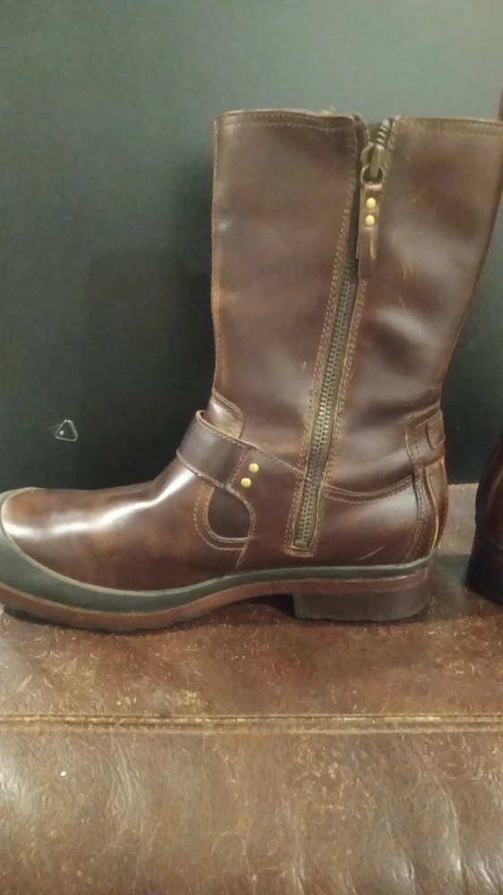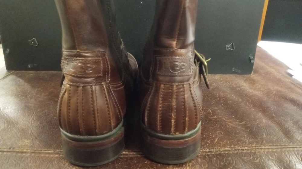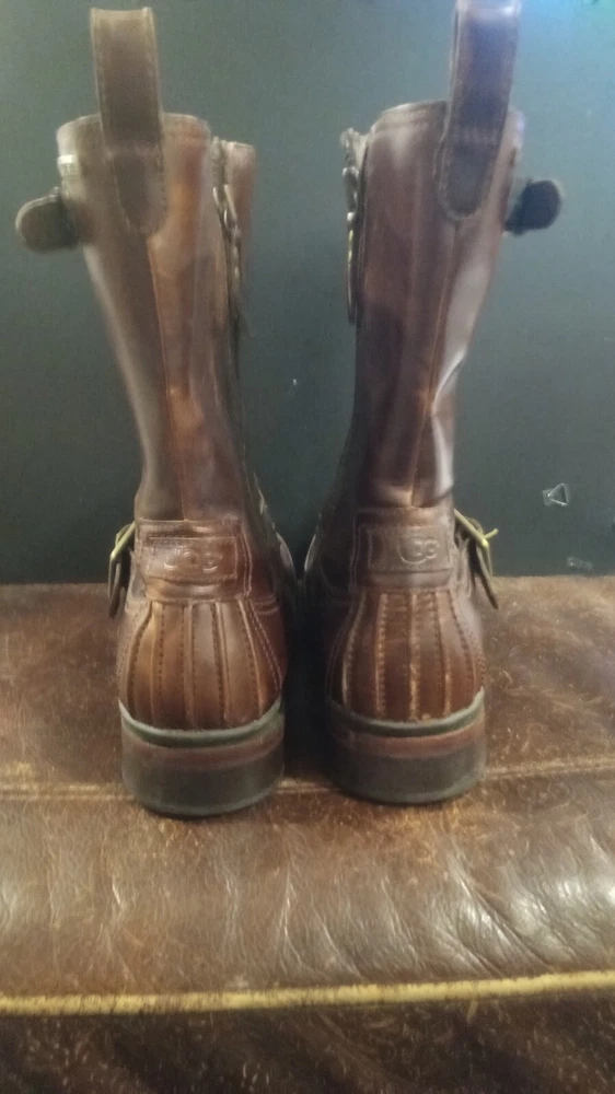 Elevate your style statement with these men's UGG Classic biker riding boots. Crafted with waterproof leather and a zipper closure, these boots are perfect for any occasion - from casual outings to activewear to travel. The round toe shape and adjustable strap with buckle accents ensure a comfortable fit, while the leather lining and insole provide added comfort. These vintage-inspired boots feature a solid pattern and a mid-calf shaft style, making them a versatile addition to your wardrobe. The boots come in a classic brown color and are available in US shoe size 13 and UK shoe size 12. BOOTS ARE 12" FROM BOTTOM OF HEEL TO TOP, FULL ZIPPER, ADJUSTABLE BUCKLED. SOME VERY LIGHT SCUFFING ON ZIPPER SIDES. BEAUTIFUL BOOTS !!!!