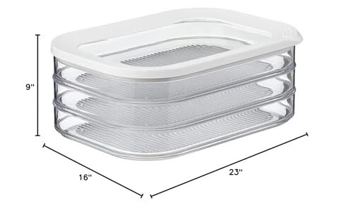 The cold meat storage container Modula 550/3 is suitable for storing different meat products in one box. The kitchen storage container consists of 3 different compartments that are stackable. So, you can store meat slices of sausage, chicken, bacon and salami separately in the fridge organiser. The container for food features a sealing ring which ensures perfect seal, making this kitchen organizer suitable for storing various meat products. The rectangular Modula meat boxes with rounded corners have a capacity of 1650 ml. In addition, the ham holders & bacon containers from are transparent and have a clear lid. This gives instant visibility of contents, even in the fridge. It is good to know that the Modula containers of are available in different sizes and colors. Also, like all storage boxes, the Modula meat cuts container is food-safe, 100% BPA-free, stackable and dishwasher-safe. No matter how demanding you are: Modula storage boxes are up to it! VERSATILE FOOD STORAGE: The Modula is your ideal solution for storing a wide range of meats, including salami, turkey, chicken, and various cheese cuts. Keep your kitchen organized effortlessly with this set of 3 storage boxes. AIRTIGHT: Seal in freshness with confidence. Our airtight lid ensures your meats and cheeses are stored properly, for you and your family to enjoy. EFFORTLESS CLEANUP: Enjoy the convenience of easy cleaning as these containers are dishwasher-safe, saving you time and effort. STYLISH AND FUNCTIONAL: We designed these containers to craft a frame-like appearance for the ingredients. When viewed from the top, each container elegantly frames the contents, achieving an artistic aesthetic while also allowing for easy identification of contents. SUSTAINABLE & SAFE CHOICE: Made in Holland, these BPA-free containers are the smart choice. Durable and long-lasting, they're an investment in sustainable living, reducing the need for frequent replacements.