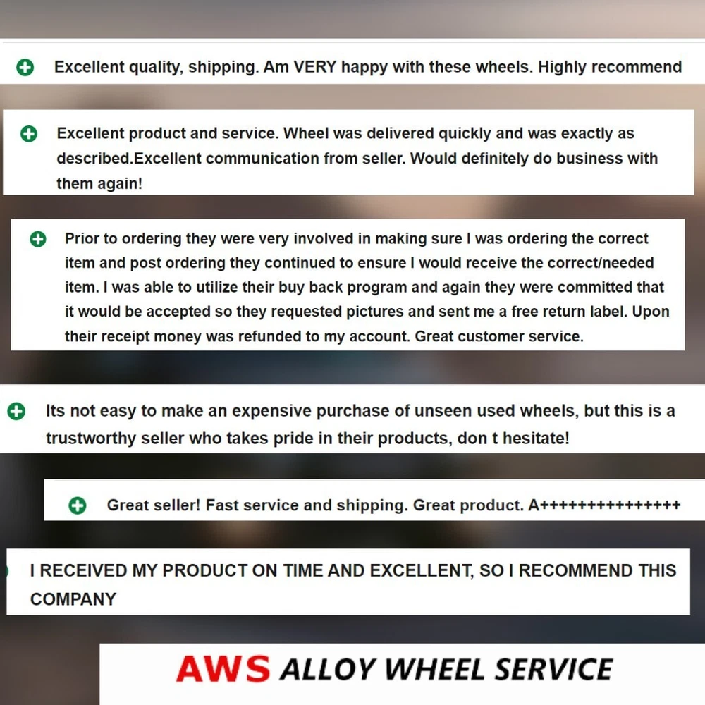 Item Description MERCEDES BENZ S-CL-CLASS S63 CL63 AMG 2008 2009 2010 2011 20 INCH ALLOY RIM WHEEL FACTORY OEM 85029 A2214013402 Manufacturer Part Number: A2214013402 ; A221.401.34.02 ; 2214013402; B66031198 Hollander Number: 85029 Condition: Remanufactured (aka reconditioned) to Original Factory Condition Finish: SILVER Size: 20" x 9.5" Bolts: 5 x 112mm Offset: 43mm Position: REAR NOTE : The buyer is responsible for fitment; *Center Cap(s), Valve Stem(s), Valve Stem Sensor(s), TMPS, Tire(s), Lug Nut(s) as well as Lug Nut Covers are NOT Included. In case if you are looking for a set of 4 wheels for your car please let us know. Vehicle Fitment 2008 MERCEDES S63 CL63 216,221 TYPE 20" FACTORY OEM WHEEL RIM, 2009 MERCEDES S63 CL63 216,221 TYPE 20" FACTORY OEM WHEEL RIM, 2010 MERCEDES S63 CL63 216,221 TYPE 20" FACTORY OEM WHEEL RIM, 2011 MERCEDES S63 CL63 216,221 TYPE 20" FACTORY OEM WHEEL RIM, 5 SPOKE FACTORY ORIGINAL WHEEL RIM Quality Management Product quality is our top concern, so i1parts solely with the highest quality remanufacturers, therefore each wheel undergoes a rigorous process of remanufacturing and various inspections based on internationally recognized standards to make sure its structure is 100% sound, straight and true, using state of the art technology and methods by the highest quality remanufacturers, many of which are ISO 9001 and SAE J2530 certified, so our customers can find replacement wheels that truly are just like new. All of our remanufactures use computerized systems to match the factory color. To further improve the satisfaction of our customers we then inspect every wheel prior to listing making sure the color is as close to factory as possible. Payment Price is important factor to our customers, usually our prices are certainly competitive, but sometimes our quality control model does not always permit us to have the lowest prices. Therefore we have created a Damaged Wheel Buy Back (Recycling) program to decrease the overall cost for our customers while also offering an environmentally safe way of disposing of their old wheels. Only OEM rims are qualified for Damaged Wheel Buy Back (Recycling) program. Items will not ship until payment is received. We are required to collect sales tax to all orders. This will be added to your order upon checkout. Please contact us for more information. Shipping Information All wheels or products are shipped within the contiguous 48 states using UPS Ground services. Upon confirming your payment your item will be processed and shipped, all orders are shipped with signature required shipping service. If rush shipping is needed, please contact us for a expedited shipping quote. We can add Next Day, 2nd Day, etc. to accommodate your needs. All items are shipped in reinforced cardboard boxes and packaged to ensure protection. Shipments to buyers in Alaska, Hawaii, Guam, Puerto Rico, the U.S. Virgin Islands or outside the United States - Please contact us for a shipping quote. Outside the U.S., buyers may be subject to local taxes, and brokerage fees. Please be aware of this before bidding or purchasing. These fees are the responsibility of the buyer. Return Policy Returns are accepted within 30 (thirty) days of receipt and the returned items must not be installed, used, mounted or altered in anyway. Customers may return the purchased items for any reason that makes customer unsatisfied. Please be NOTED that there is a 25% restocking fee and the customer is responsible for return shipping unless the item is found to be damaged or defective. All items must be returned in the same condition in which they were received. Feedback We are committed to your satisfaction. We will automatically leave positive feedback for buyers within 24 hours of receiving payment. Feedback is an important asset for buyers and sellers alike, so if you are satisfied by your experience with our services we would greatly appreciate it if you could take a moment to leave us positive feedback with 5 star ratings. If you are not completely satisfied please contact us to give us the opportunity to improve your experience. Please know that your positive feedback and 5 star rating is are appreciated and vital to the growth of our company. Thank you!!!
