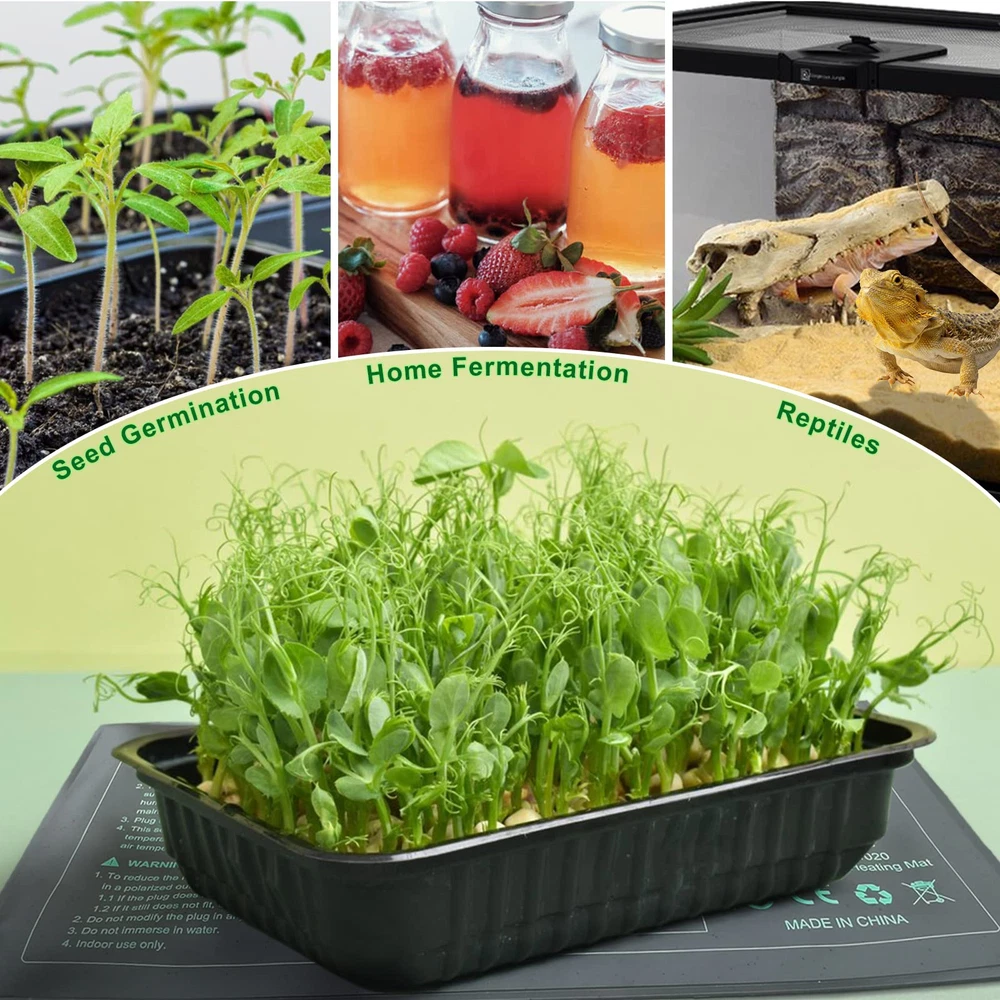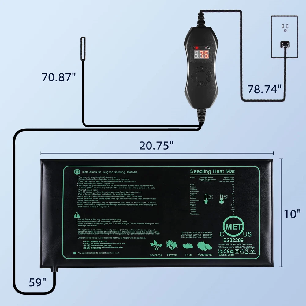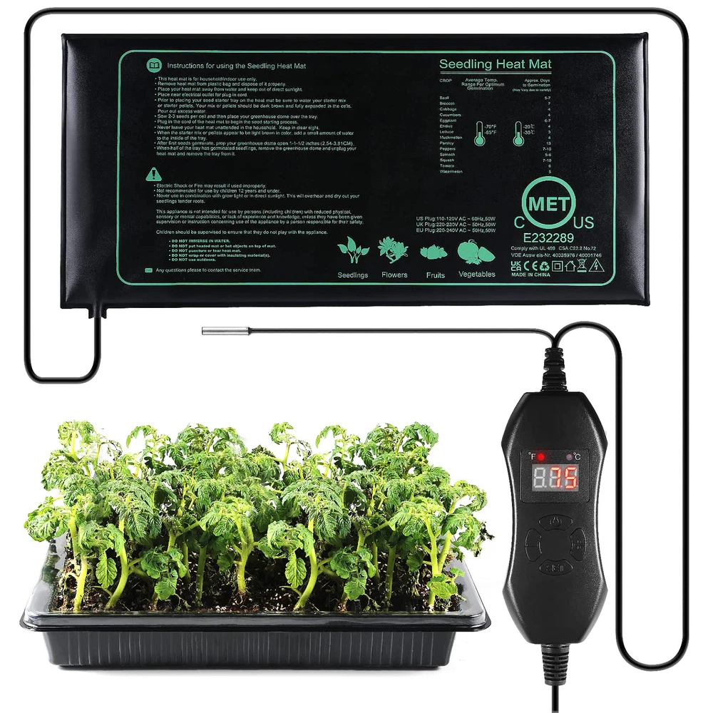 MET Seedling Heat Mat with Digital Thermostat Controller use for Seed Germination (10" x 20.75") Thermostat Controller Displays Real-time Temperature Via LED Thermostat - warms root area 10 to 20 degrees over ambient temperatures. The controller maintains a stable accurate temperature with the sensor probe . Waterproof construction designed for indoor plantings. Easy to clean Heat accelerator helps increase germination and propagation Automatic controller allow you to set temperature for better results. Portable, soft and durable ... built to last. Size 10 x 20.75 One Year warranty Free Shipping Free Returns Satisfaction Guaranteed