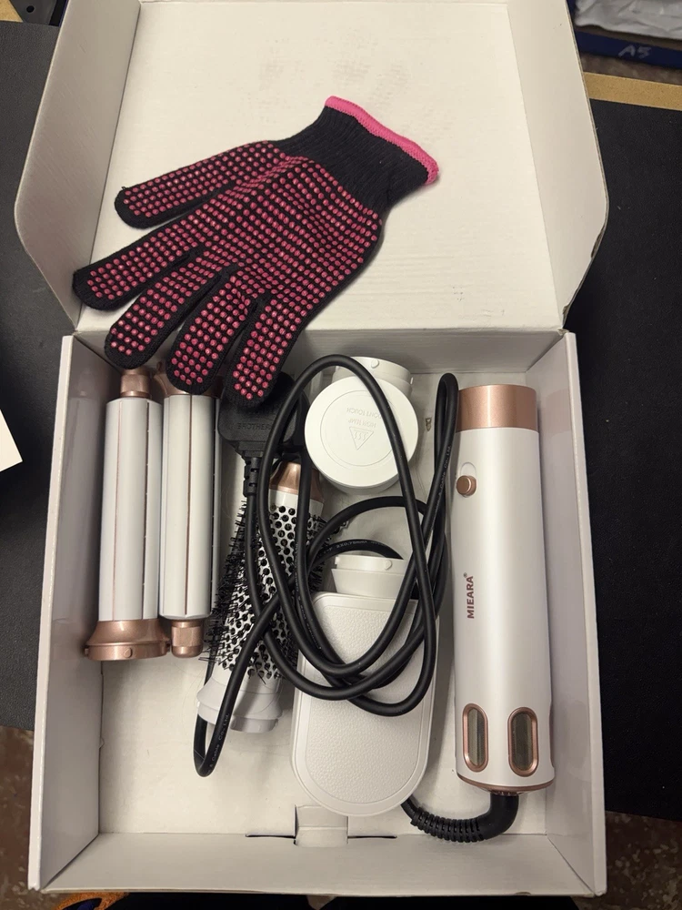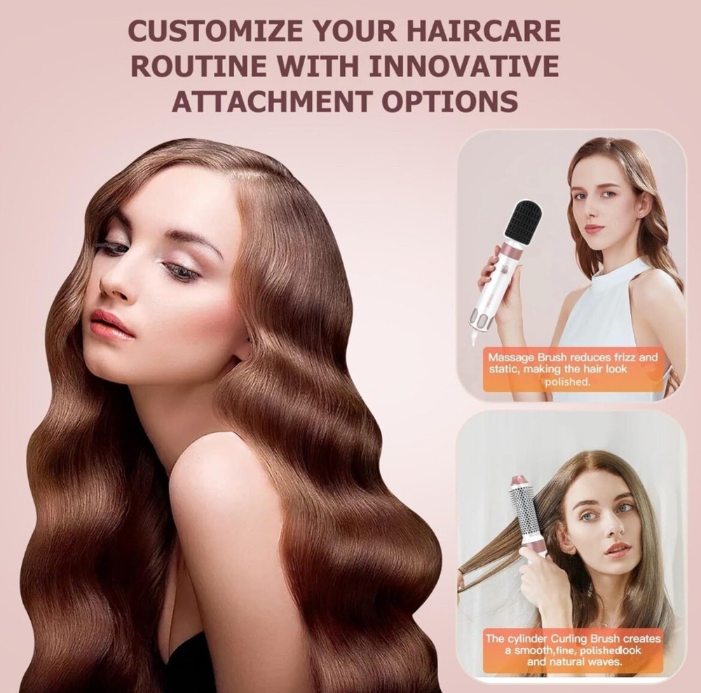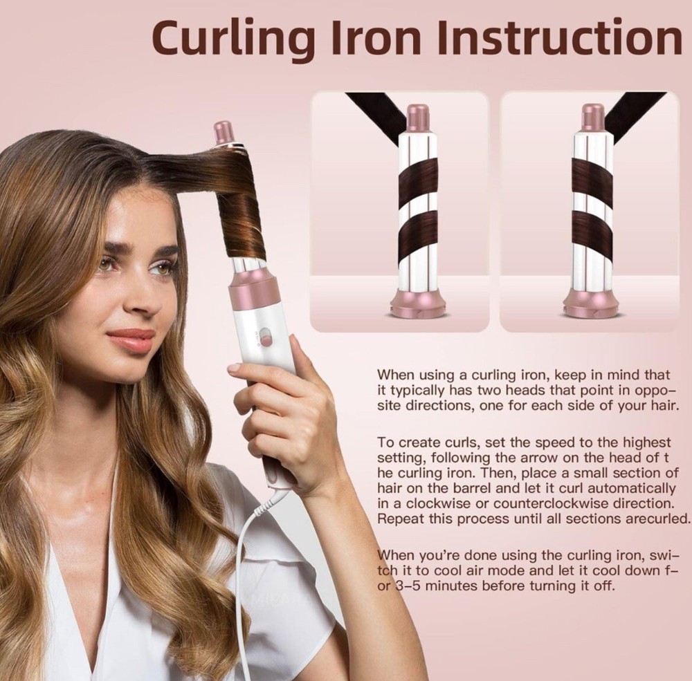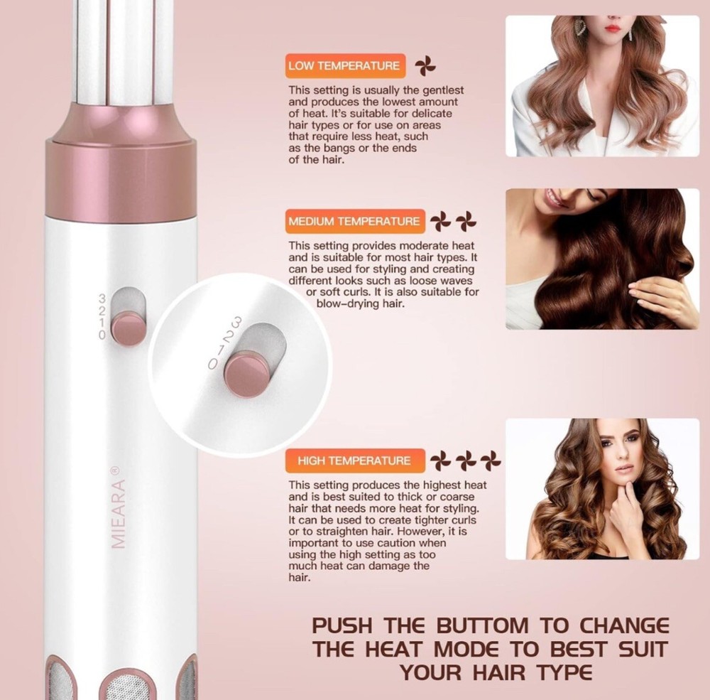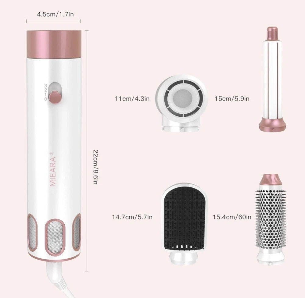 2023 MIEARA 5 in 1 Hair Styler, Hair Dryer Brush, Negative Ionic High-Speed Hot Air Brush for Volumizing, Drying and Rotating, Hairdryer Brush for All Hair Types (A - White & Rose Pink) 【 Unique Hair Care Design】- MIEARA's new 5-in-1 Hot Air Styler boasts high air speed and low noise levels to protect your hair from extreme heat damage, as well as 5 interchangeable attachments to meet all your styling needs. This package includes 1x hair dryer, 2x curling Irons, 1x massage brush, and 1x cylindrical curling brush 【Ionic Negative Hair Dryer】- MIEARA's hot air brush with negative ions will give your fine hair without frizz, and the Ionic technology will lock in moisture and bring out the natural shine of your hair. In addition, intelligent constant temperature can reduce the scalp’s sense of heating and protect your hair from heat damage. 【3 Temperature Settings】 - There are three ways to adjust the temperature for styling, but the air speed remains the same. Button 1: Low Temperature (61-63°C). Button 2: Medium Temperature (96-98°C). Button 3: High Temperature (136-140°C). NOTE: If you plan on using the curling irons for styling, please set the temperature to the MAXIMUM for better results. 【An ideal gift for everyone】- With MIEARA's 5-in-1 Hot Air Brush, you can make a unique gift for your friends, family, and loved ones on birthdays, Weddings, Mother's Days, Valentine's Days, Christmas, Halloween, and Thanksgiving. Additionally, you may also give it to yourself as a gift for travel and home use. 【Warning】 - 1. In order to avoid damage or burning, please do not place the air styler on carpets, floor, etc. 2. If the device is used by children under 15 years old, it needs to be used with the assistance of parents. 3. It is important to be aware that the longer the device is used, the hotter it will become. We therefore recommend wearing an insulated glove and avoiding direct hand or skin contact.