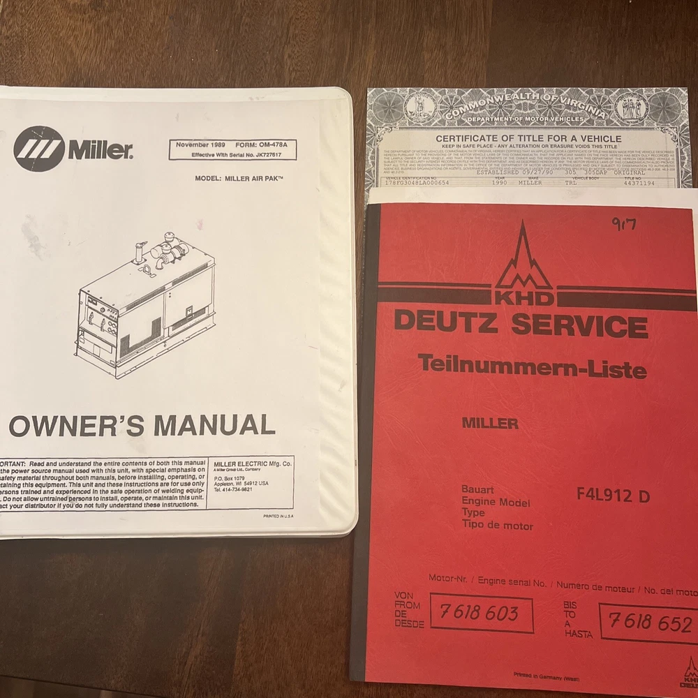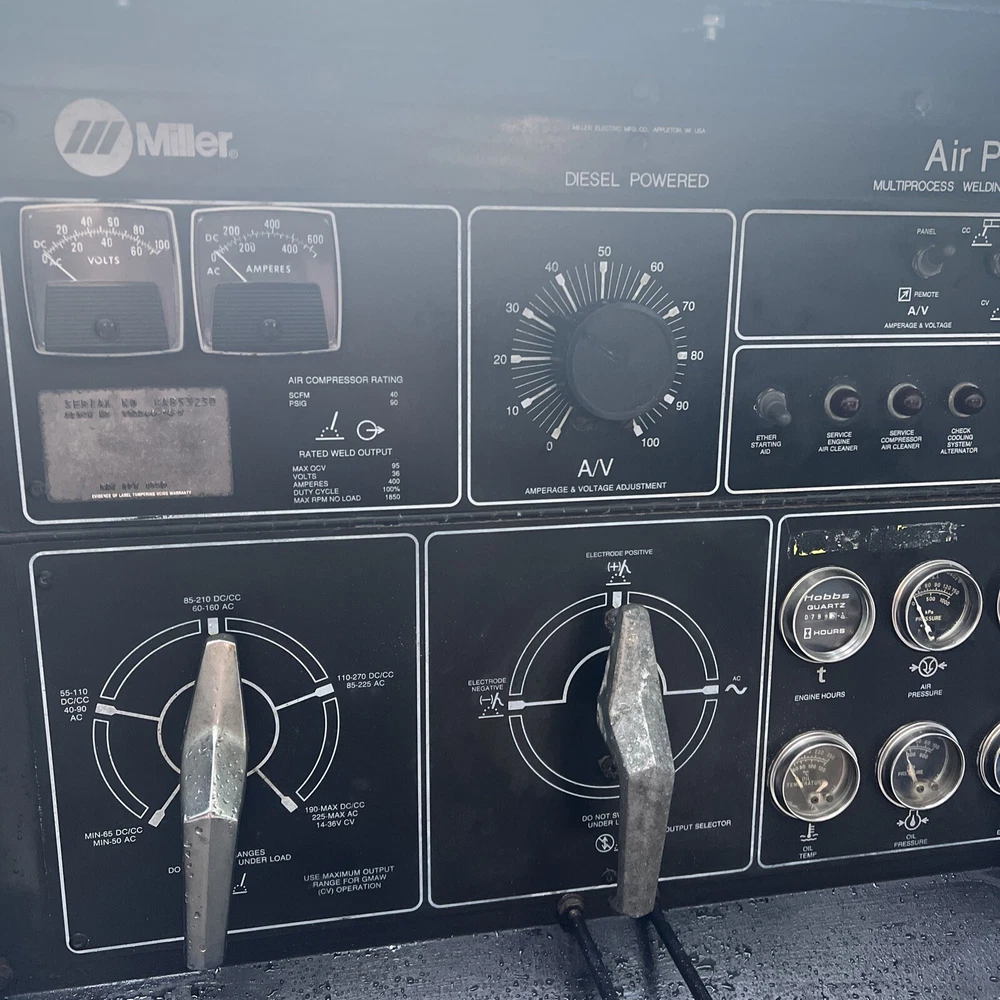 !!!!!!!PLEASE READ FULL DESCRIPTION!!!!!!!! This miller welder and trailer is in great condition. It is an older welding machine and trailer (1990) that has been completely refurbished and gone through in detail. Everything works and it runs flawlessly. I honestly have never used a smoother welding machine in my 25 years in the business. ABOUT THE WELDING MACHINE: it is a diesel powered welder/ air compressor/ generator, that is a multi process machine. It is an AC/DC machine that is constant current and constant voltage. It has both wire feed and remote settings. This machine will weld 400 AMPs at 100% duty cycle. ABOUT THE GENERATOR: this machine is equipped with an on-board 3KVA/KW 60HZ generator that is capable of providing power single 10kw, and 3 phase power 15kw even while the welder is being used! It is equipped with 120 and 240 volt duplex receptacles. ABOUT THE AIR COMPRESSOR: this machine is equipped with an on-board air compressor. It is capable of producing an effective working pressure of 40 SCFM 90 PSIG at 100% duty cycle! It is also equipped with an on-board 21 gallon capacity air tank. ABOUT THE TRAILER: This trailer has been well maintained and has been slightly modified to carry 3 K sized gas cylinders and a 25lb Co2 fire extinguisher. This trailer has a heavy duty tow pintle style hitch with emergency hydronic breaks. It is also is equipped with new, upgraded LED tail lights. It is equipped with 2 large tool boxes to store any tools, stingers, and hoses you may need. Is has a brand new set of 4 tires with a full sized spare. Brakes and wheel bearings have all been serviced and lubed, with plenty of life left. INCLUDES: a 10’ heavy duty ground clamp, 25’ stinger, 25’ air hose, remote cable to hook up a wire feeder, clean title, and owners manual. SHIPPING/ PICKUP: LOCAL PICKUP IS PREFERRED, but will ship at buyers expense.