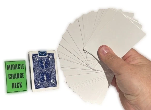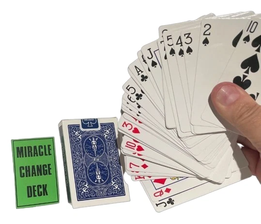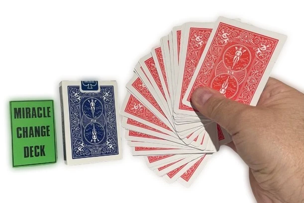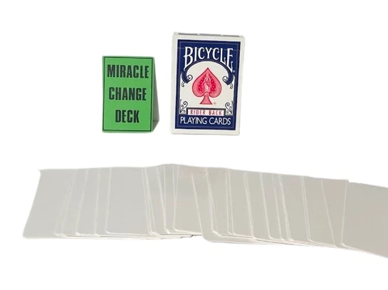 NEW Miracle Change Deck BEST PRICE ON EBAY OR ANYWHERE ELSE! Performer spreads a deck of cards on a table showing them well shuffled. He turns the cards over and spreads them again, showing all the cards are RED backs. He then turns the deck over again and waves his hands over the face of the cards. They instantly vanish and the entire deck is now blank. He now picks up the deck, waves his hands over it and the backs have all turned BLUE. Totally mechanical in working, You will require a little handling practice. The deck is supplied with a link to a video tutorial. There are no written instructions. Please note : When you open the pack for the first time, the cards all seem like a "brick" because the deck is compressed in an original Bicycle Deck Box, which is a wee bit smaller than required. (The very special decks are placed in an original Bicycle Box to look like the real thing). J ust flexing the deck and giving it a couple of riffles at the short edges makes the deck work perfectly as required. Color of Bicycle Box may vary. Enjoy this video demonstration: https://youtu.be/_cefpiKGFHw WOW FREE SHIPPING! Robb. E - 1 Please check out The Visual Comedy Shop for more great comedy and magic related items. Geist Visual Comedian DVD Geist Napkin to Bunny Gag Flash Paper Pads Spring Animals Fire Magic Magic Accessories Comedy Sword Swallow Geist Pie Throwing Gag! D'Lites Silks, Streamers & Coils PK Rings Flower Magic Stage/Box Tricks Jokes, Gags & Pranks All at the best prices here on EBAY or anywhere else!