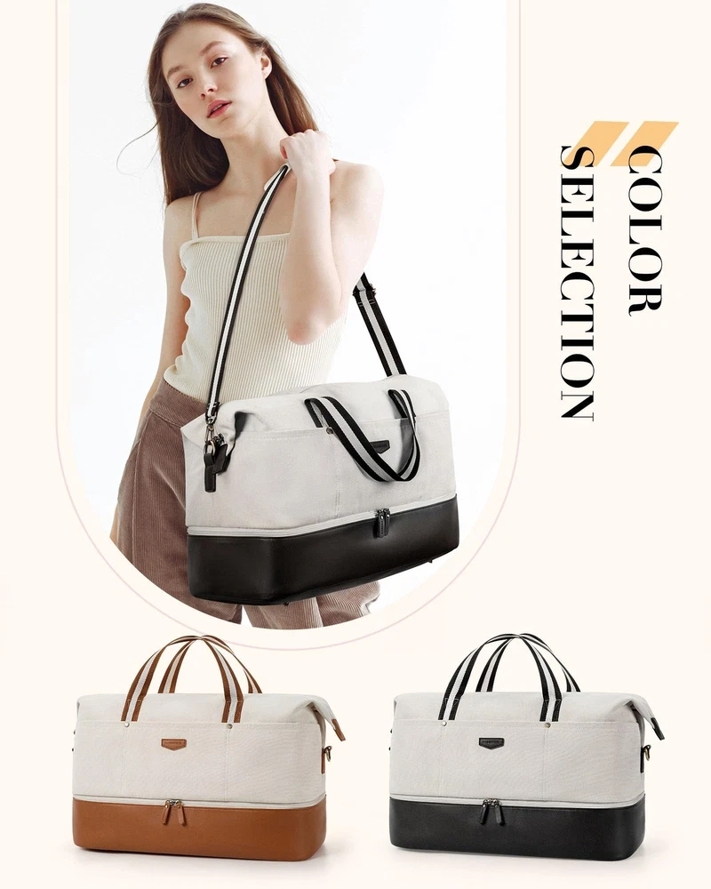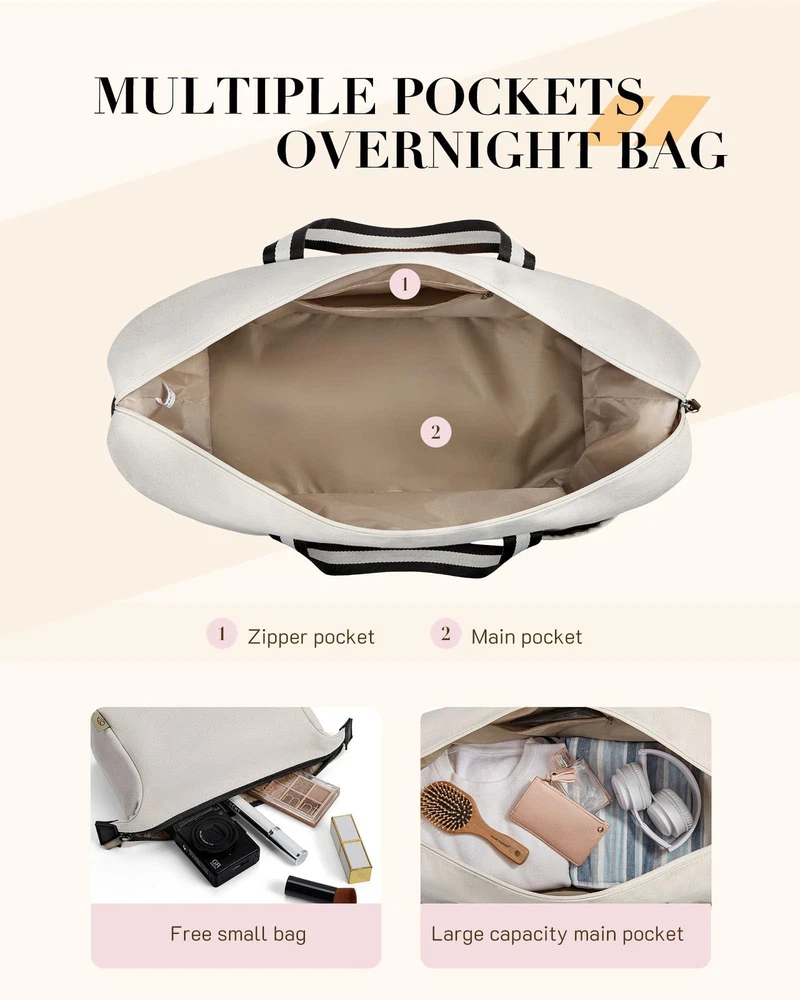 MISSNINE Weekender Bag for Women, Canvas Travel Duffle Bag Large Overnight bag Carry On Bag for Travel Gym Work with Leather Shoe Compartment, 2 Pcs Set Product Details Product Dimensions: 21 x 9.6 x 14 inches Item Weight: 2.97 pounds Manufacturer: Missnine Country of Origin: China Number of Compartments: 6 Different Compartments/PocketsThe weekender bag featuring multiple pockets and compartments for stuff organization. Large main compart fits 3-4 days worth of travel essentials; 3 front pockets to hold your smart phone, IDs or passport, come with a cute small bag for toiletries or other smaller items.Back side sleeve allows you to fit it in trolley case to free your hands.