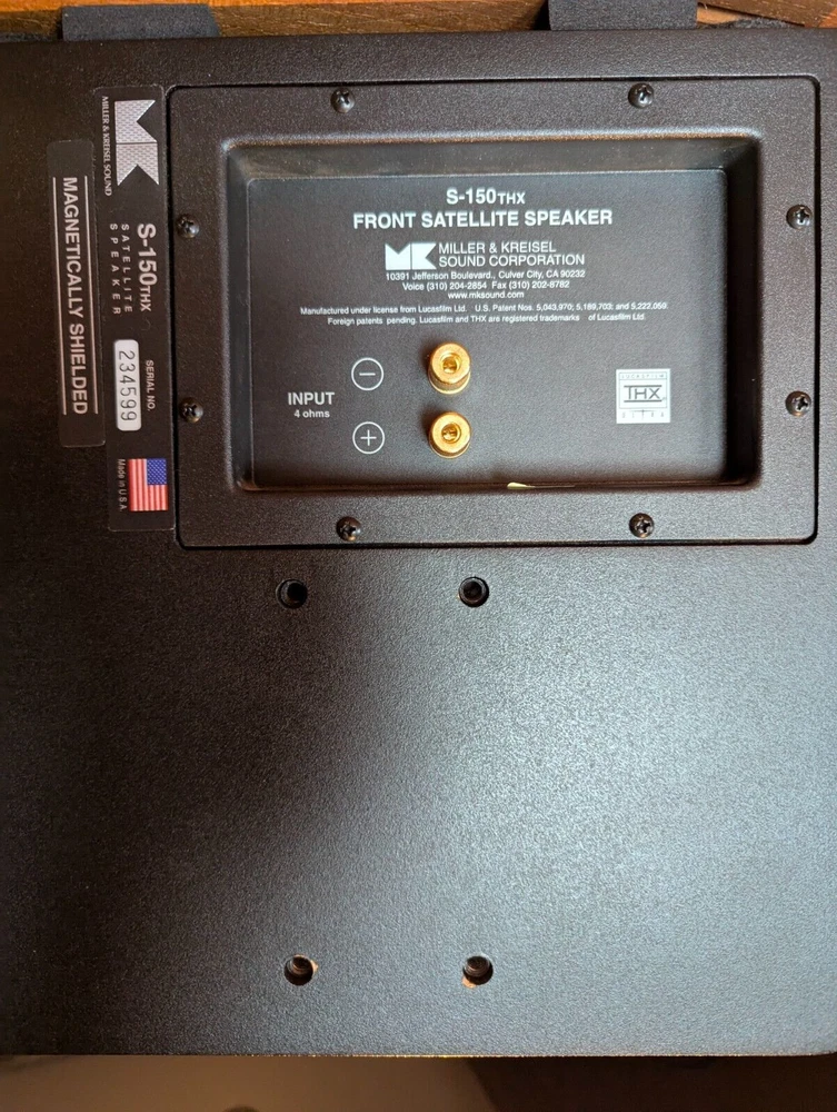 Purchased new in 2001. American Made. Paint is excellent. No chips. Well Cared for. Legendary THX Ultra Certified center channel speaker from the M&K S150 THX lineup. The Miller & Kreisel system has proved to sound natural, dynamic, and detailed in my home theater. It's certainly one of the best I've ever heard. Has built in angle to allow easy placement below or above your listening position for more easier positioning. Includes Two 5¼" midrange drivers, and three 1.1" tweeters with th e goal to make a vertically directional loudspeaker, so that it doesn't cause ceiling and floor reflections. H uge 400W power capacity and THX Ultra specs fills most rooms with sound to reference level. Search and read the original Stereophile Magazine review You can match these speakers with the L and R S150THX speaker, available in toe in angled face, or straight face. " The Angled Center Channel (AC) version of the 150 changes the angle of the face-plate: it rakes back from the top toward the bottom, while the tweeter and midrange arrays remain vertically aligned. This makes the AC-150 easy to focus on the listening position from the top of a large monitor. But turn the speaker upside down, and it becomes simple to focus it upward when the AC-150 is mounted below a screen. The top of the speaker also incorporates a five-degree rake-back to further reduce parallel-wall-induced reinforcement nodes. It's magnetically shielded to simplify top-of-monitor placement. S-150ACTHX center-channel speaker Impedance: 4 ohms Recommended power: 50-400W Frequency response: 82Hz-20kHz, ±2dB Dimensions: 12.5" x 10.5" x 12.25" (HxWxD) Weight: 23 lbs. " S-150ACTHX