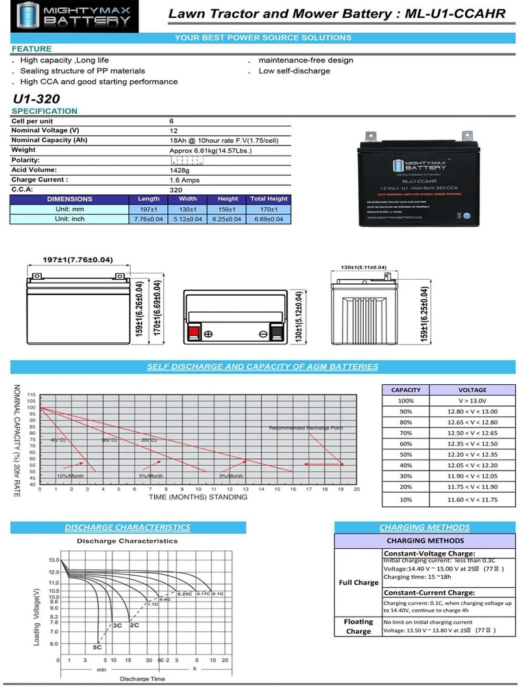 Menu Other Items Feedbacks About Us Contact Us Add To Favorites ML-U1-CCAHR 12V 320CCA Battery for Toro Timecutter Z5000 Lawn Mower ML-U1 is a 12V 320 Cold Cranking Amps (CCA) Sealed Lead Acid (SLA) Battery. Dimensions: 7.75 inches x 5.11 inches x 6.25 inches. Polarity: Positive on Left, Negative on Right. Listing is for the Battery and Screws only. No wire harness or mounting accessories included. SLA / AGM spill proof battery has a characteristic of high discharge rate, wide operating temperatures, long service life and deep discharge recover. Rechargeable battery that can be mounted in any position, resists shocks and vibration. Long lasting high performance in high and low temperatures. Full One Year Product Description Item Specification Item model number ML-U1-CCAHR974 Product Dimensions 5.11"D x 7.75"W x 6.25"H Country of Origin Thailand Vehicle Service Type Lawn Mower Voltage 12 Volts Battery Cell Composition Lead Acid Item Weight 14.1 Pounds Terminal Nut & Bolt Batteries 1 12V batteries required. (included) Dimensions Shipping Returns Additional Info Product Dimensions: 7.75 "h x 5.11 "h x 6.25 "h. Fast shipping is very important for us. Our standard shipping service is FREE. Your order will be shipped within 1-3 business days upon full payment received. Most items are delivered within 3-5 business days, however, please allow 3-10 business days. We are shipping only to USA. We only ship to the confirmed Paypal address. We reserve the right to cancel any order for any reason at any time. We are not responsible for undeliverable addresses. We offer a 30 day return policy from checkout winning date. Your satisfaction is guaranteed! If for any reason you are unhappy with your item, just return it within 30 days for a full refund, minus shipping cost. Please contact us prior to initiating a return so that we can issue you a refund authorization. Items defective upon receipt must be packaged in their retail packaging as if new and returned with a detailed description of the problem. Return shipping fees are not refundable. We reserve the right to decline any returns if the above guidelines are not followed. All of our items, unless otherwise stated, will only run on 120 volts. Please check to make sure your country complies with these specifications. If you have a problem or question regarding your transaction please contact us before leaving any type of feedback. We will work with you to resolve any problem you may have.