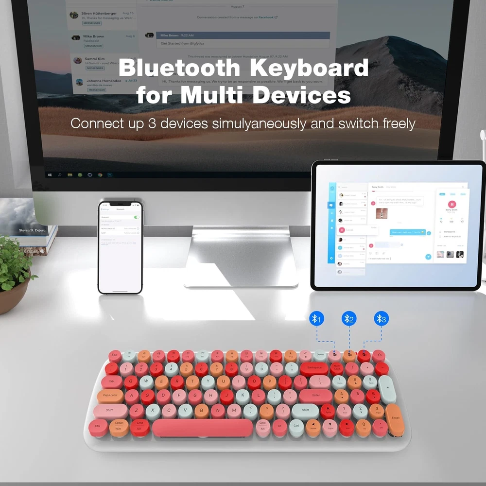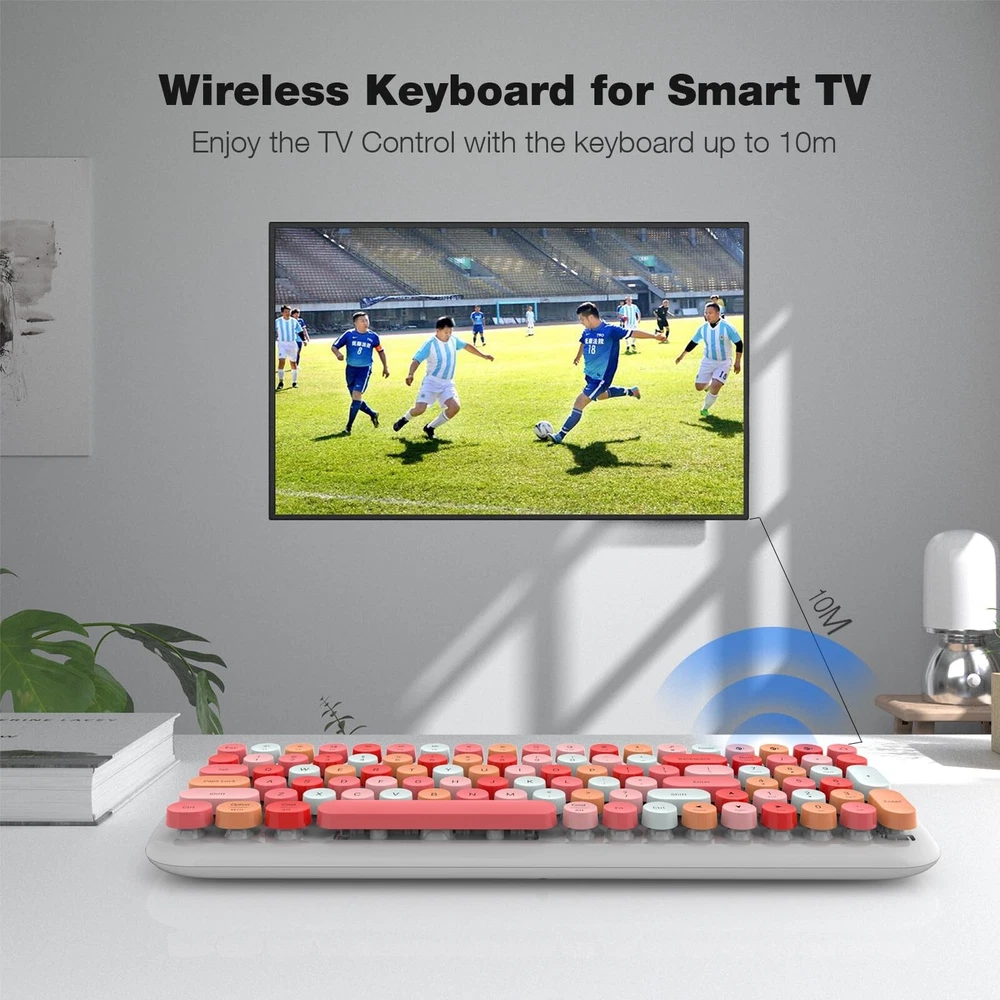MOFII Wireless Bluetooth Keyboard for Laptop & Android, Connect up to 3 Devices Simultaneously, Portable 100-Key Typewriter Retro Round Keycaps Keyboard - Lipstick Colors Product Details Color: Lipstick Colorful Brand: MOFII UPC: 735279538540 EAN: 0735279538540 MPN: Does not apply Brand: MOFII Compatible Devices: iPad, iPhone, iMac, MacBook, Laptop, PC, Tablets, Smartphone, Windows, IOS, Mac OS, Android Connectivity Technology: Bluetooth Keyboard Description: Wireless Recommended Uses For Product: Office Special Feature: Split Keyset Design, Ergonomic, Hotkeys and Media Keys Color: Lipstick Colorful Number of Keys: 100 Keyboard backlighting color support: Single Color Style: Colorful Retro Full Size Typewriter Keyboard Product Dimensions: 13.5 x 5.1 x 1.3 inches Item Weight: 1.22 pounds Is Discontinued By Manufacturer: No Date First Available: November 25, 2020 Manufacturer: Grenf Language: English Country of Origin: China Colorful Retro Round KeycapsThe inspiration of these cute removable round keys come from vintage typewriters offering you visual enjoyment and retro feeling to type Stable Bluetooth 5.1 & MULTI-DEVICE CONNECTION - Inbuilt Bluetooth 5.1 technology. Fast channel switch among 3 devices without any interference or disconnection Auto Power-Saving This keyboard turn into Power-save mode automatically, click any key or button to wake-up within seconds. When the battery is dying,the low battery indication light in the top right corner will remind you to replace the battery Wide Compatibility Perfect choice for iPad, iPhone, iMac, MacBook, Smartphone, Windows, IOS, Mac OS, Android (Please note that there must be bluetooth connectivity function for your device ) Long Connection DistanceAdvanced Bluetooth technology provides a cable-free, clutter-free connection. Long effective operating distance: about 6m (20ft)