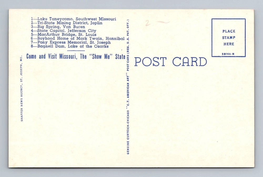 Era: Vintage Unit of Sale: Single Unit Subject: Cities & Towns Type: Printed (Lithograph) Country/Region of Manufacture: Unknown Original/Licensed Reprint: Original Size: Standard (5.5 x 3.5 in) Theme: Cities & Towns Country: USA Material: Paper Region: Missouri Postage Condition: Unposted City: Missouri