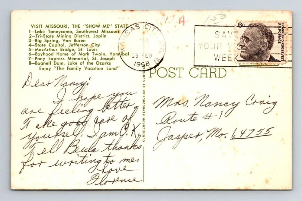 Unit of Sale: Single Unit Theme: Cities & Towns Country: USA City: Missouri Country/Region of Manufacture: United States Postage Condition: Posted Subject: Cities & Towns Era: Chrome Continent: North America Type: Printed (Lithograph) Region: Missouri Original/Licensed Reprint: Original