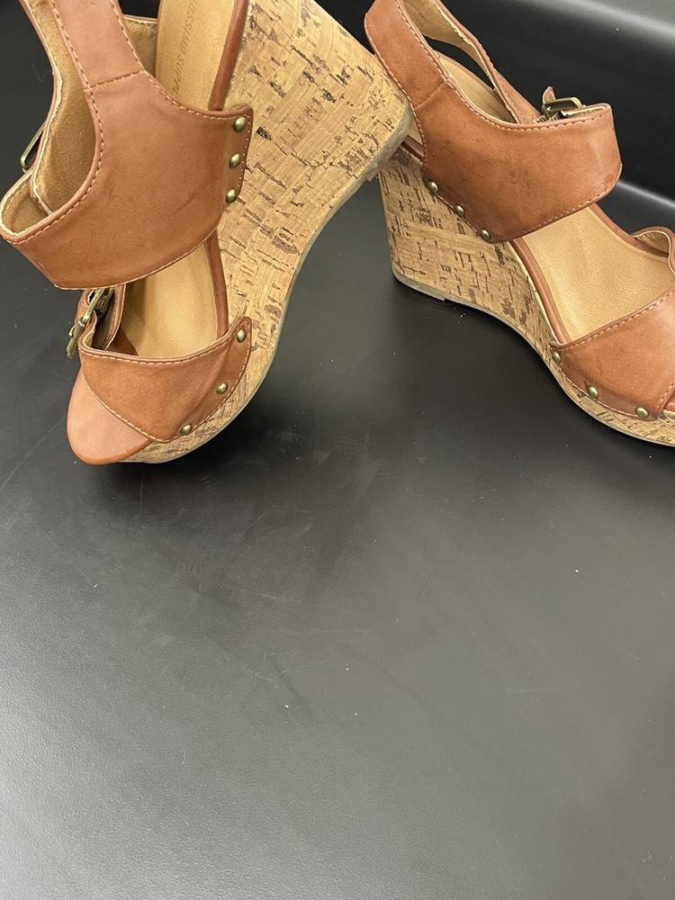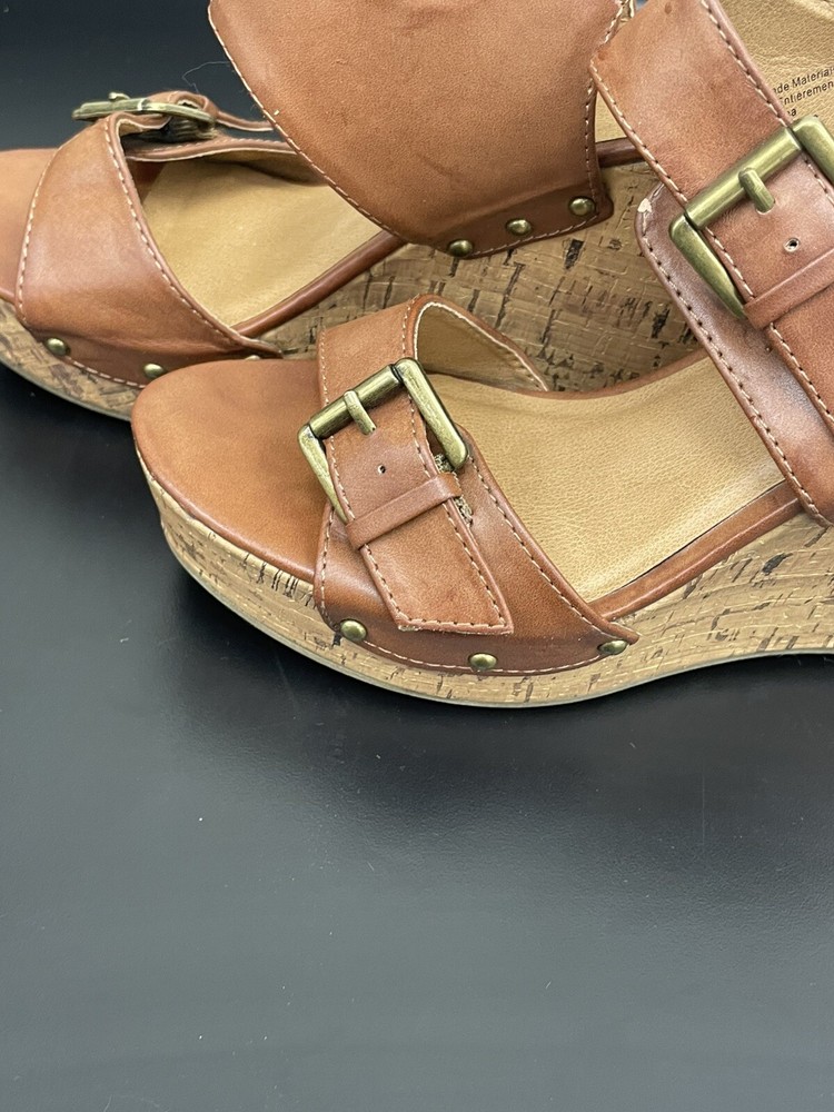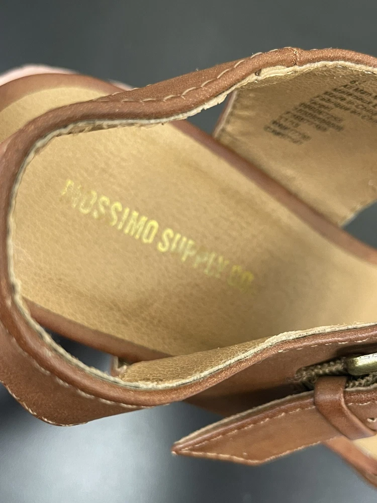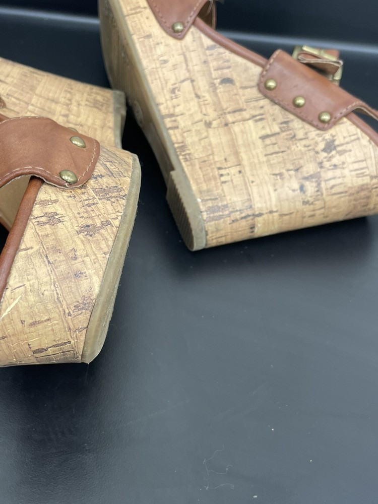 This is a pair of Mossimo Supply Co brown ankle strap sandals with a cork heel and studded accents. The sandals feature a strappy design with a buckle closure and an ultra high wedge heel. They are made of faux leather and are in a size 6.5.