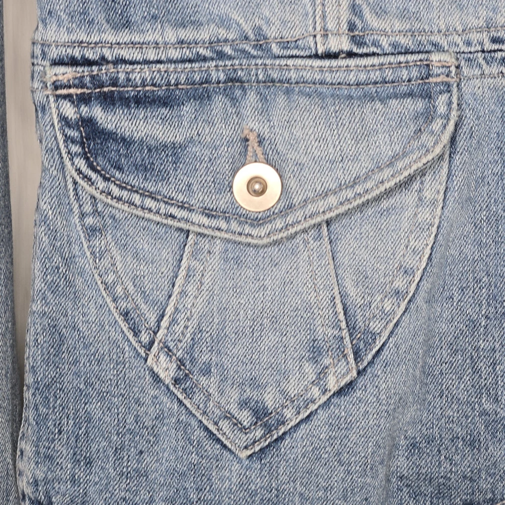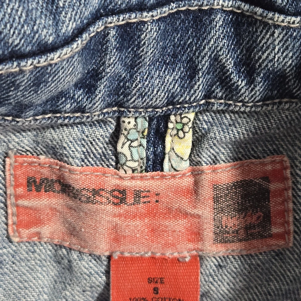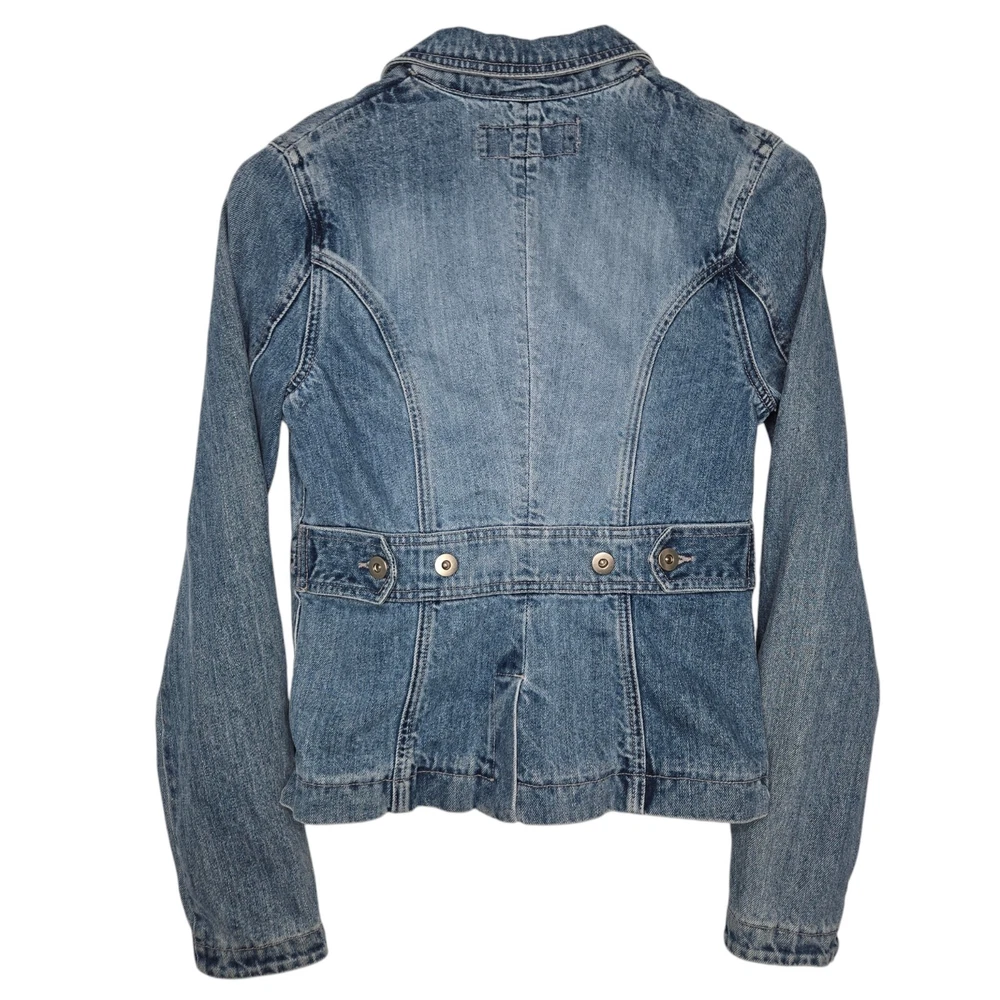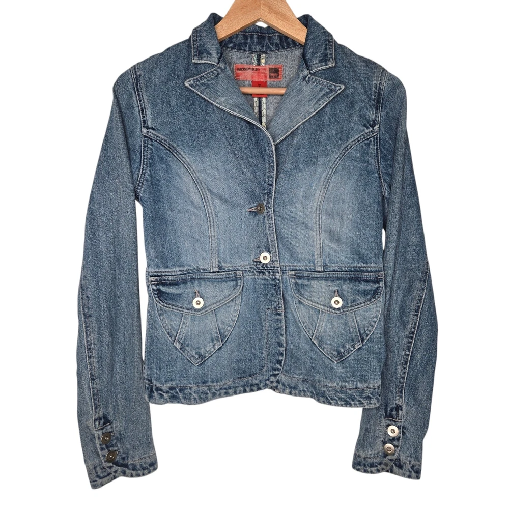 Elevate your wardrobe with this vintage style denim blazer from MOSSISSUE by MOSSIMO. This blazer features a classic, retro-inspired look that is perfect for any occasion, whether it's a casual day out or a business meeting. The blazer is made from high-quality cotton denim and features a button closure, notch flat lapels, and patch flap pockets. The blazer is a size small and has a regular fit, making it perfect for most body types. It is machine washable and can be worn in any season. With its timeless style and solid pattern, this blazer is a must-have addition to any fashion-forward woman's wardrobe. It has silver hardware and a fitted silhouette. This blazer is a one of a kind must have! It's measurements are 17" front chest and 24" length. It is made of 100% cotton.