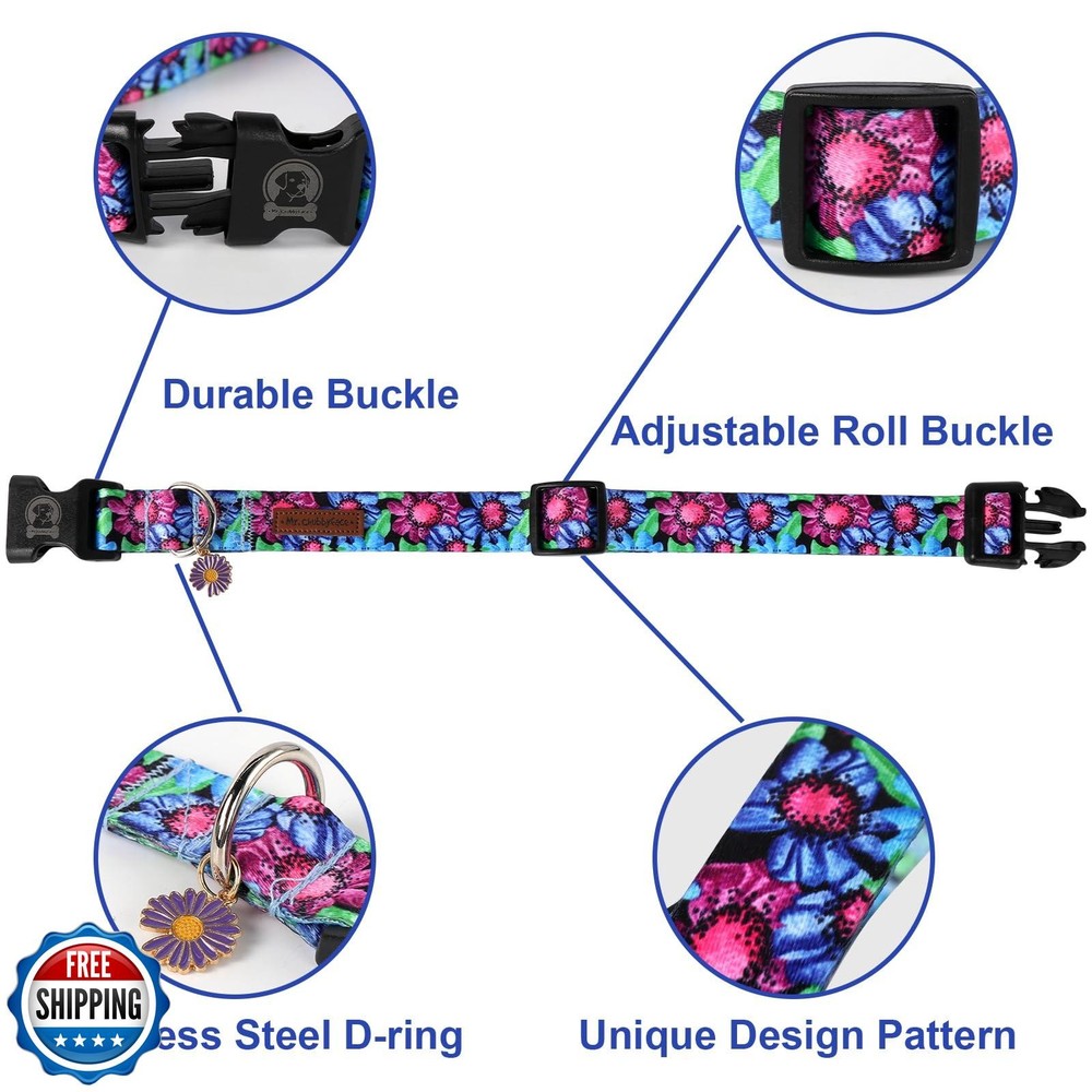 MR. CHUBBYFACE Spring Summer Dog Collar Purple Blue Floral Soft Adjustable Pet Boy Girl Collar for Small Medium Large Dogs Features Excellent Material: MR.CHUBBYFACE dog collar is made of high density polyester, which is soft, breathable and no tearing. Metal D-ring is waterproof to add durability and will not be broken. The dog collar for medium dogs is easy to wash by hand. Thoughtful Details: Plastic buckle design is so strong that the dog can't break free easily, the metal D-ring can be connected to the dog leash. The straps are adjustable to provide maximum comfort and reliable fit. Girl dog collars can be adjusted for all kinds of dog shape for xsmall, small, medium and large dogs. Unique Design: MR.CHUBBYFACE specializes in designing various of stylish patterns from small medieum and large dogs. This flamingo dog collar is designed for spring and summer daily wear,the color is bright for girl and boy dogs,it is prominent and very eye-catching. Durable Dog Collar Size:: All pictures are taken with our production samples from a size of Medium (Width 1", Neck Size 13.5"-22"). X-Small Width 5/8", Neck Size 8"-12",Small Width 4/5", Neck Size 10"-16", Large Width 1.2", Neck Size 16"-24". The dog in the final model picture is using a size S collar. Please measure your pets carefully to make a safe and fit purchase. 100% Satisfied Guarantee: The cute pet collar is very easy and convenient to use whether it is indoor or outdoor, hiking or running. If you have any questions, please contact us and we will reply to you within 24h. Shipping Free & Fast Shipping: We offer free shipping to most of the USA with a normal delivery time of 3-7 days. However, due to the current situation, additional delivery time (up to 3 weeks) may be required for some items. Alternative Carriers: We may use alternative carriers (e.g., USPS, FedEx, UPS) to ensure your package arrives safely and on time. Due to the use of multiple carriers, we are unable to provide a tracking number automatically. Handling Time: Orders are processed and shipped within 1-2 business days of receiving cleared payment. Shipping Restrictions: Shipping to Alaska, Hawaii, Puerto Rico, Guam, and other US territories may incur shipping charges or delivery restrictions. Please contact us before ordering, or your order can be refunded/cancelled. State Restrictions: Certain items may not be shipped to California due to state regulations. Contact for Tracking Updates: If you require tracking updates or have any concerns about the delivery of your order, please feel free to contact us, and we will be happy to assist you. Return Policy 30-Day Hassle-Free Returns: If you are not completely satisfied with your purchase, you can return the item for free within 30 days of receiving it for a full refund or exchange. Easy Return Process: Contact us, and we will provide you with a prepaid return shipping label and detailed instructions. No Restocking Fee: There are no restocking fees for returns. However, the buyer is responsible for return shipping costs if the return is not due to a seller"s error. Refund Processing: Refunds will be processed within 1 business day of receiving the returned item in its original condition. Feedback Your feedback is extremely important to us. We strive to provide the best products and customer service possible. If you are satisfied with your purchase, please take a moment to leave us a positive review. If you have any concerns or issues with your order, please contact us before leaving negative feedback. We are committed to resolving any problems and ensuring your satisfaction. Contact Us If you have any questions or concerns, please feel free to reach out to our customer support team. You can contact us through the eBay messaging system. We are available Monday to Friday, 9:00 am to 5:00 pm EST, and we will do our best to respond to your inquiry within 24 hours. Thank you for supporting our small family business!