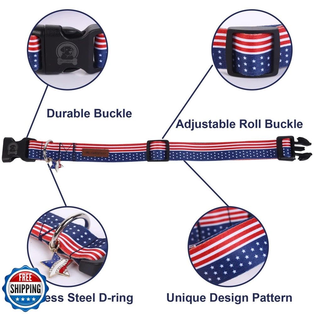 This collar is a total win! The material is super soft yet durable, and the metal D-ring holds up perfectly. My pup loves how comfy it is, and the patriotic design gets tons of compliments. The adjustable buckle makes it easy to fit snugly, and it’s held up great through playtime and washes. Perfect for any proud pup!
