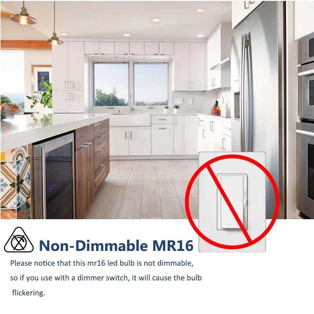 MR16 LED Light Bulbs 12V AC/DC, Non-Dimmable, 5000K Daylight White, Bipin Base, 40 Degree Narrow Flood Beam Angle, GU5.3 LED Spot Light Pack of 6 Features and specifications instant on mr16 led light bulbs 500lm 5000K bright daylight white color shock and vibration proof 50Watt mr16 Halogen bulb Equivalent, led bulbs good colour rendering CRI>80 High lumen efficiency over 100lm/w Average life of 30,000 hours 2 Years . (or is available,us directly through if you have questions or problems.) Applications Widely applied in indoor outdoor lighting like track lighting, can lighting, recessed lighting, landscape lighting. ideal for use in living room, bedroom, kitchen, hotels, restaurants, shops and offices. Caution 1.Turn off the power supply before installing the 12v mr16 led bulb. 2.Do not use in Enclosed fixtures, as this will shorten the lifespan of 12v led mr16 bulb. 3.IP Rating of the mr16 12v led flood is IP20, not waterproof, if you want to use outdoors, please use the mr16 led 12v spot light bulb in a place or a lighting fixture that can prevent the bulb from water. 4.Do not open the led mr16 light bulbs, as this will void the . If any problems happen during the , please us directly on . 5.To make better use of the mr16 gu5.3 led bulb, please keep it away from direct sunlight and wet or high temperature environment. 6.The 50w mr16 led spotlight could not be used as light and it has to be used in voltage AC/DC12V. The mr16 led bulbs are not dimmable, please do not use them with dimmer switches. NON-DIMMABLE- 5w AC/DC 12v 50w mr16 led light bulbs, non-dimmable, please do not use with dimmer switch, as this may cause flicker or noise. ENERGY SAVING- the mr16 led bulb 12v has 500 lumens output, equivalent to the light of a traditional mr16 halogen bulb 50w, saving over 90% on electricity bill, better use as outdoor led landscape light bulbs, track lighting bulbs, recessed lighting bulbs. BRIGHT & VIVID COLOR- Bright daylight white colour (5000K), high color rending(CRI>80), makes the color of mr16 gu5.3 led bulb more vivid, natural and soft. EASY INSTALLATION- standard mr16 gu10 shape gu5.3 bipin base, the 12v led mr16 bulb is easy to install, just plug and play.(The mr16 spot light is not waterproof, please keep it away from water for outdoor usage.) WIDE APPLICATION- contain no mercury or any UV/IR light, No flicker, No noise, outstanding heat dissipation, the mr16 12v led flood is safe for use in living room, bedroom, kitchen, museum, office, shops and stores.
