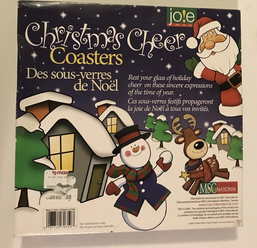 Add festive cheer to your home with this set of four vintage Christmas coasters from MSC International. The square coasters feature a colorful Santa character design and have a 4-inch diameter. Made of resin material, these stackable and washable coasters are perfect for protecting your furniture during holiday parties. The coasters are a great addition to your bar tools and accessories collection, and they make a wonderful gift for friends and family. With their holiday pattern and cheerful theme, these coasters are sure to bring joy to your home this Christmas season.
