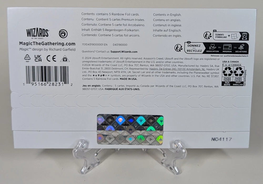 Item : The item pictured is the item you are buying. Factory Sealed. Shipping : Your item will ship the next business day via USPS Ground Advantage. Description: For millennia, heroes have risen from the ranks of the noble Assassin Brotherhood to wage a silent war against the oppressive Templar Order. These masters of stealth and subterfuge have battled across history and the continents to preserve freedom in the face of tyranny. Eivor, Altaïr, Amunet, Basim, and Edward are among the most famous and deadly of those lethal legends. Art by Narendra Bintara Adi, Clint and Diana Cearley, Zezhou Chen, Fajareka Setiawan, and Dan Watson Contents : 1x Rainbow Foil Najeela, the Blade-Blossom as Eivor, Raven Clan Champion 1x Rainbow Foil Kelsien, the Plague as Altaïr, Brotherhood Mentor 1x Rainbow Foil Queen Marchesa as Amunet, Tyrants’ End 1x Rainbow Foil Ramses, Assassin Lord as Basim, Master Assassin 1x Rainbow Foil Admiral Beckett Brass as Edward, Jackdaw Captain