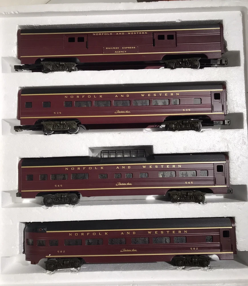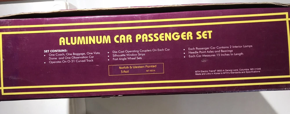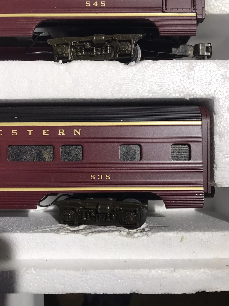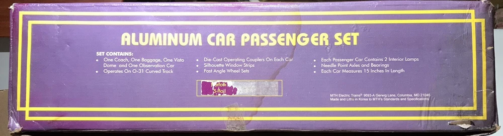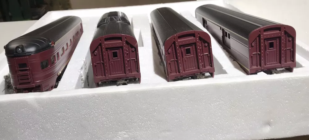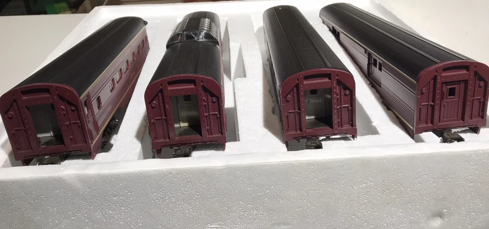 WOW A beautiful set of passenger cars, at an affordable price to add to your collection. This passenger car set is in great condition. Look around you won’t find any for this price in this condition. There are a few small scratches on the tops and sides of the cars very small, but you can see it in the pictures. Other than that. Everything operates and looks great. All the illumination works as you can see in the pictures, there is no illumination in the baggage car it comes that way. The box shows a little bit of wear and tear and some water damage on one end. It is only to the box you can see it in the pictures. There is no damage to the Styrofoam. There are no bags for the trains. There are three diaphrams for the cars as well. * Please look at all pictures as they are part of the description* If you have any questions, please feel free to reach out to me. Thank you. !