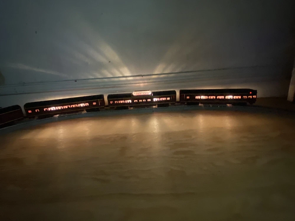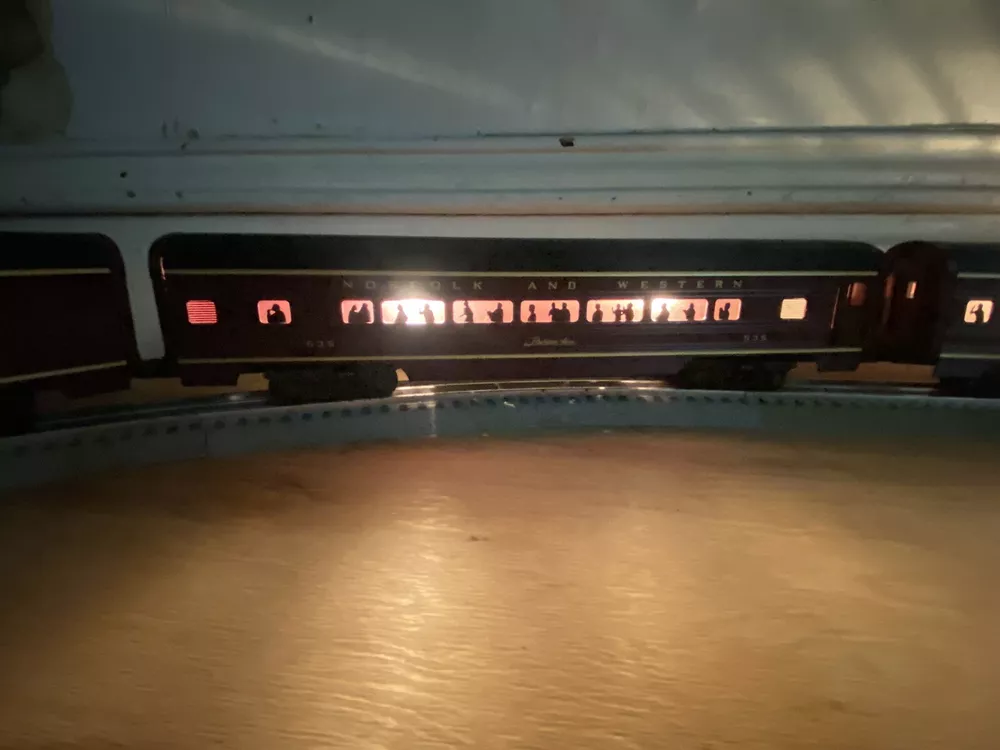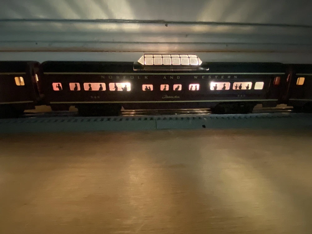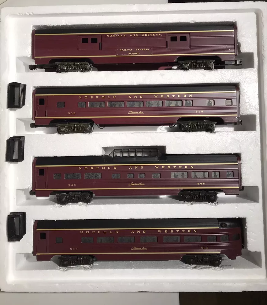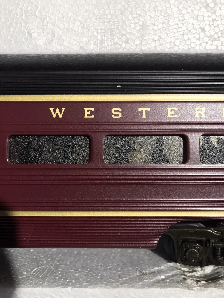 WOW A beautiful set of passenger cars, at an affordable price to add to your collection. This passenger car set is in great condition. Look around you won’t find any for this price in this condition. There are a few small scratches on the tops and sides of the cars very small, but you can see it in the pictures. Other than that. Everything operates and looks great. All the illumination works as you can see in the pictures, there is no illumination in the baggage car it comes that way. The box shows a little bit of wear and tear and some water damage on one end. It is only to the box you can see it in the pictures. There is no damage to the Styrofoam. There are no bags for the trains. There are three diaphrams for the cars as well. * Please look at all pictures as they are part of the description* If you have any questions, please feel free to reach out to me. Thank you. !