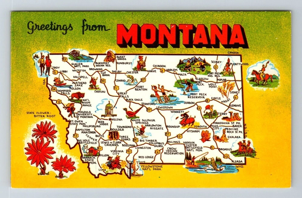 MT-Montana, Scenic Greetings, Map View, Landmarks, Vintage Postcard