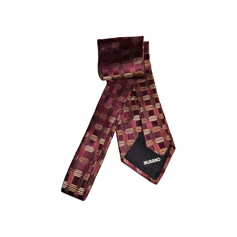 Elevate your style with this MURANO designer tie. Made of 100% silk and crafted in Italy, this tie features a geometric camouflage pattern in maroon. The adjustable tie is 59" in length and 3" in width, with a classic size that fits most. Perfect for any occasion, whether you're dressing up for a formal event or adding some flair to your everyday work attire. The tie is handmade and features a silk fabric type, making it a luxurious addition to your wardrobe. The attachment type is a tie and it is designed for men. Make a statement with this unique and stylish tie.