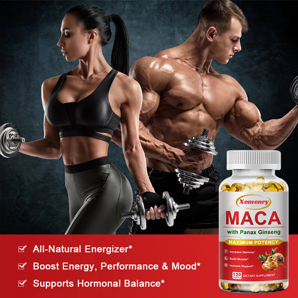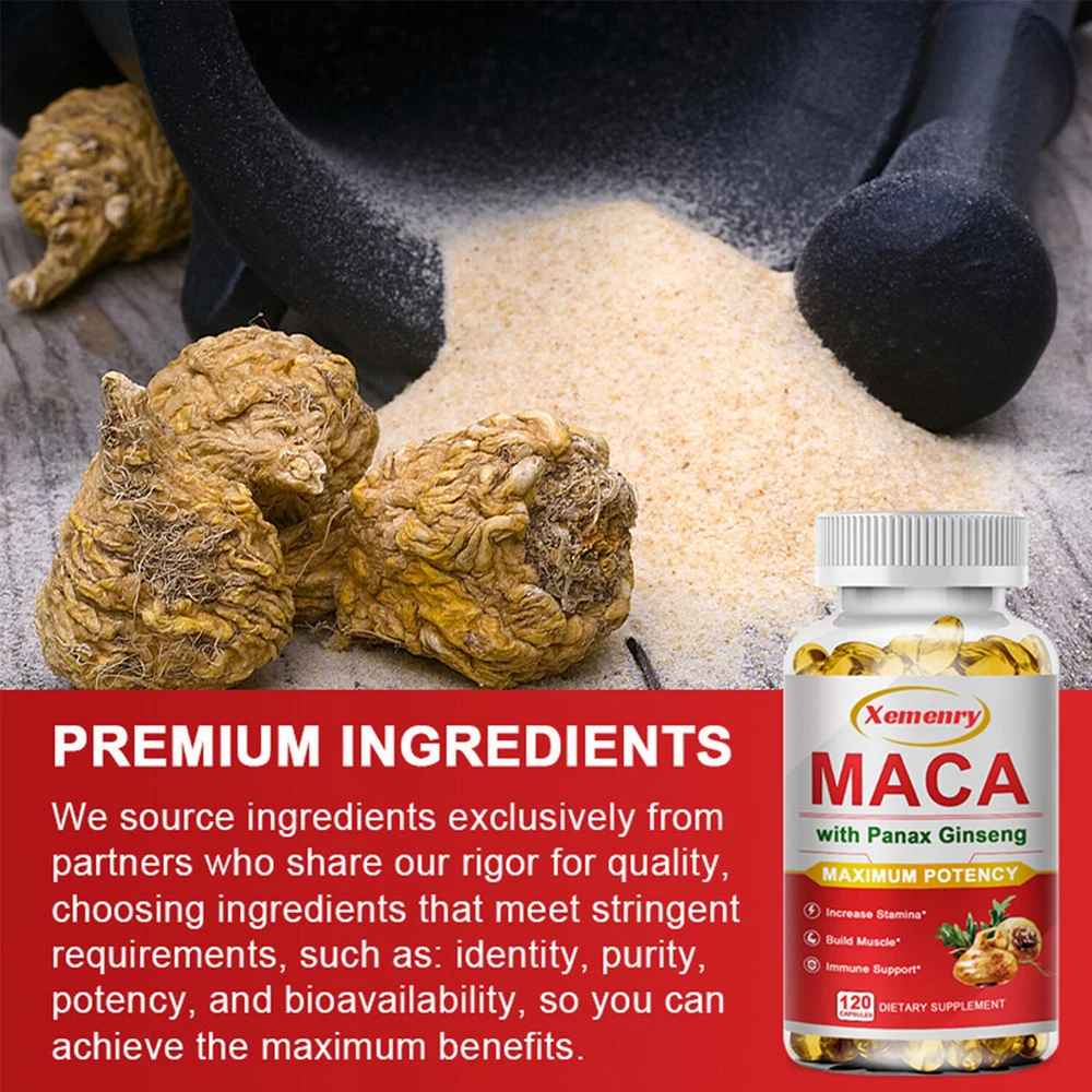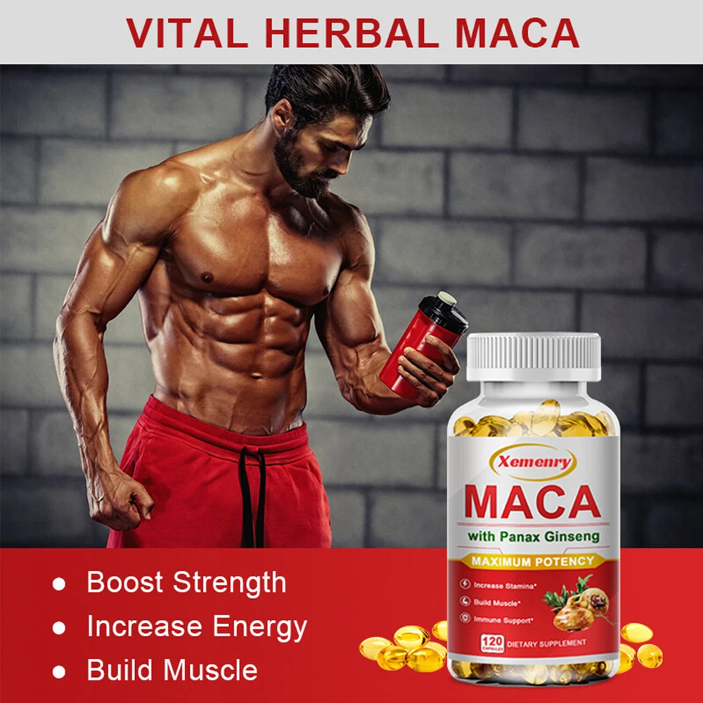 Effects: Testosterone Booster, Energy & Endurance Ingredients: Maca, Ashwagandha, Ginseng, Tribulus Directions: Take 2 capsules once daily after a meal. Shipping: Ships within 48 hours on working days. Shelf life: 2 years Description: Multiple Premium Ingredients - Our capsules are a powerful blend of natural ingredients. Includes ingredients such as Maca, Ashwagandha, Tribulus and Black Pepper. These ingredients work synergistically to aid strength, muscle mass, energy production, and the immune system. Making it ideal for those looking to improve athletic performance or improve overall physical endurance. COMPLETE HEALTH BENEFITS - This powerful formula is packed with benefits designed to support your overall health. From building strength and endurance, to balancing hormones and improving mood, maca root can transform your daily life. Document