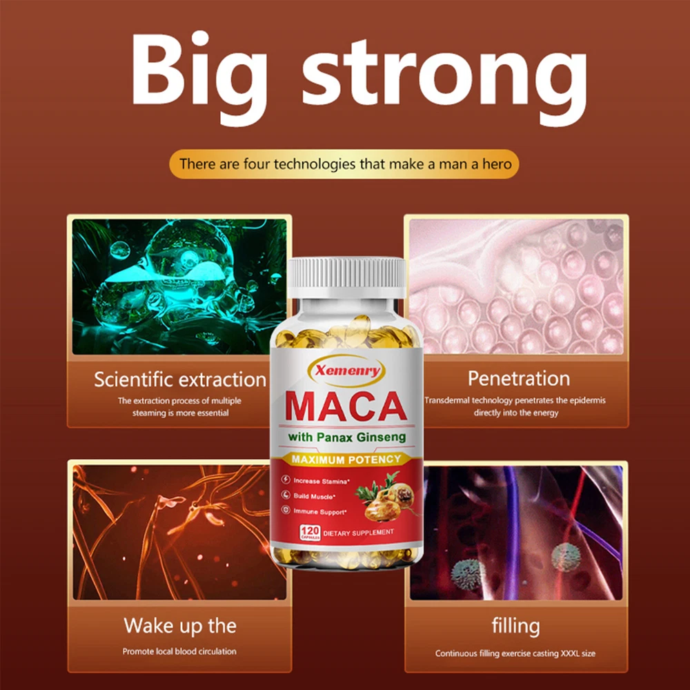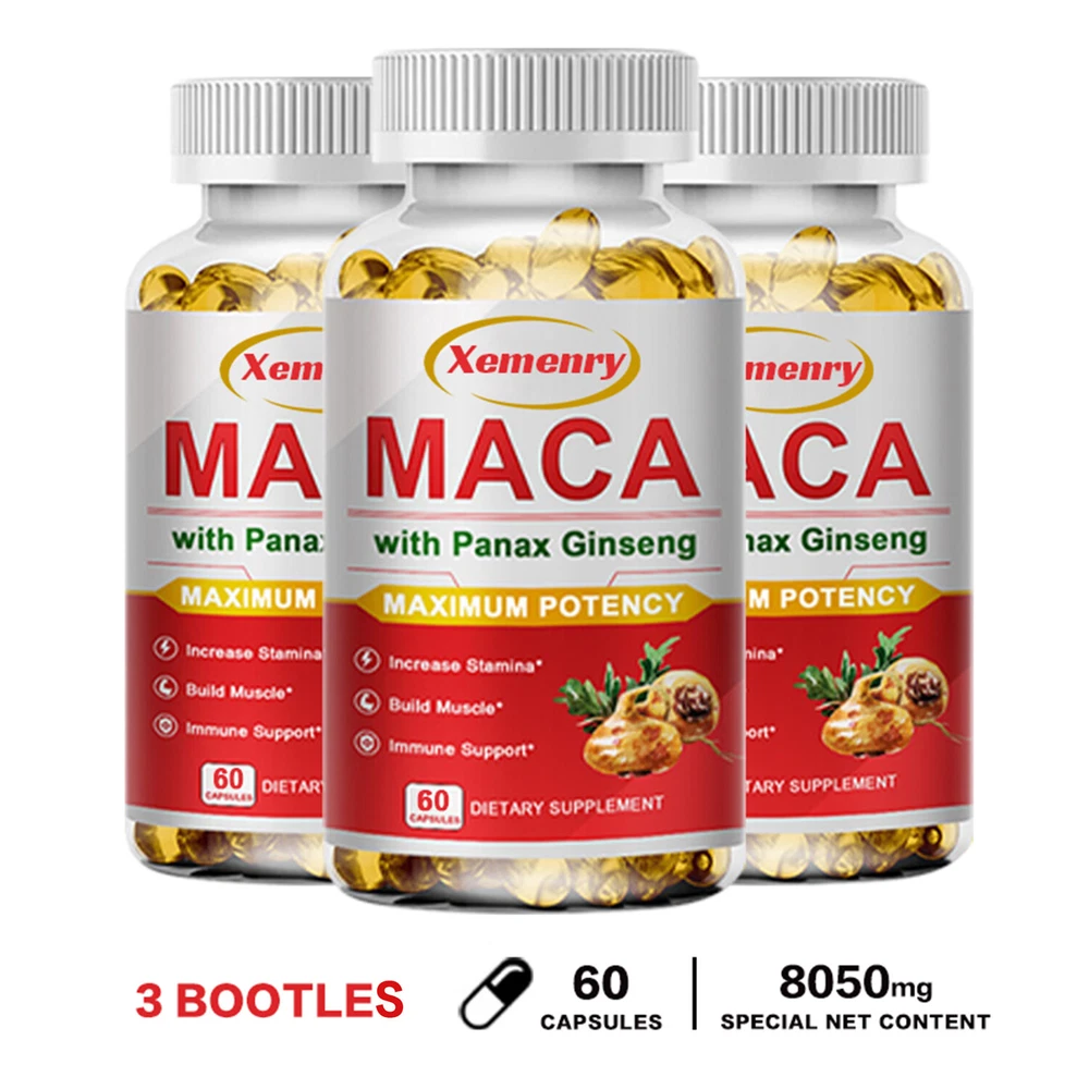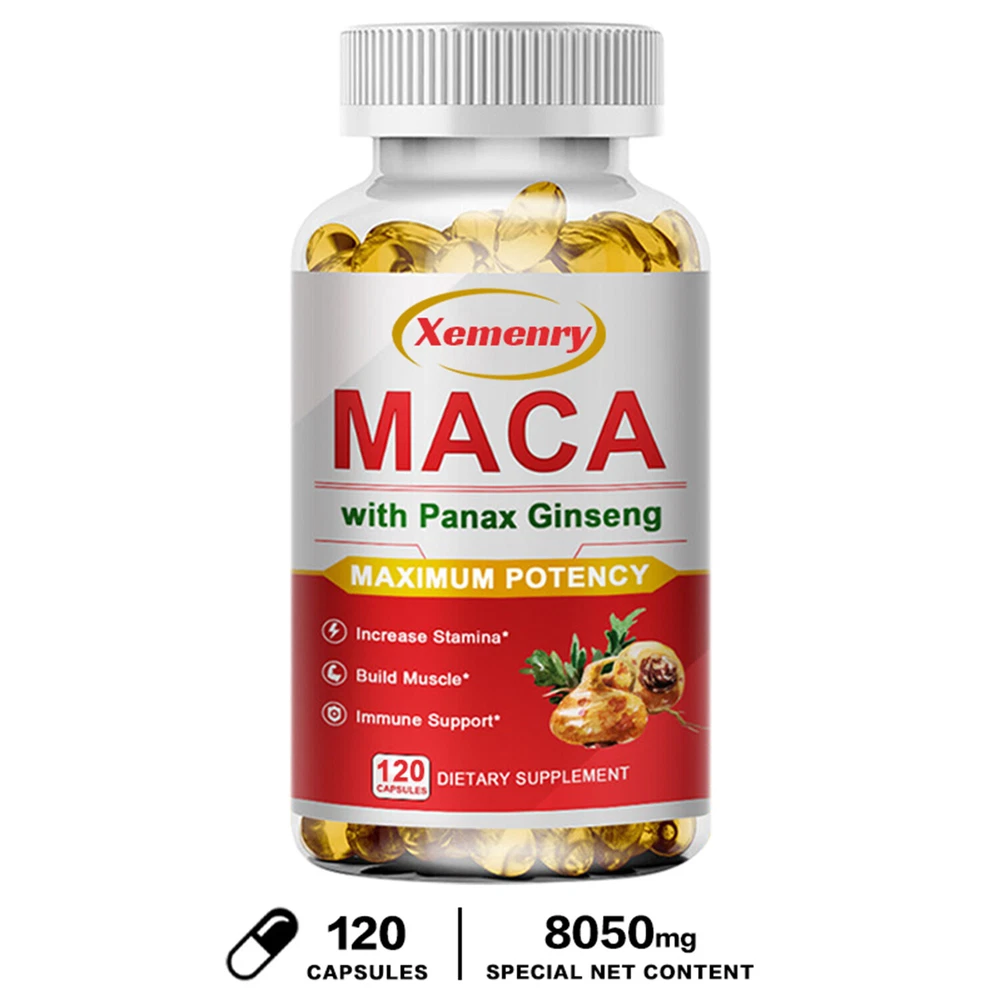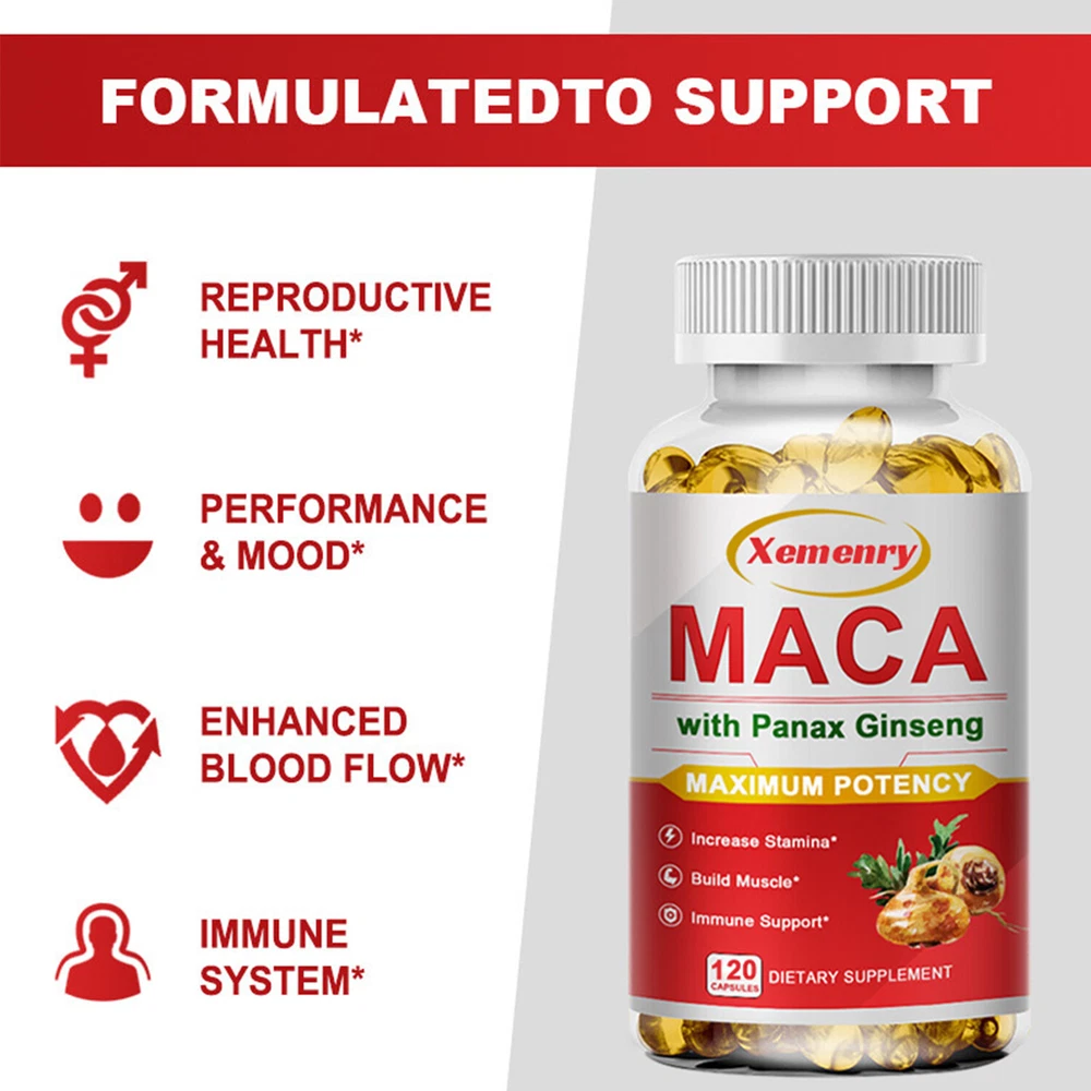 Effects: Testosterone Booster, Energy & Endurance Ingredients: Maca, Ashwagandha, Ginseng, Tribulus Directions: Take 2 capsules once daily after a meal. Shipping: Ships within 48 hours on working days. Shelf life: 2 years Description: Multiple Premium Ingredients - Our capsules are a powerful blend of natural ingredients. Includes ingredients such as Maca, Ashwagandha, Tribulus and Black Pepper. These ingredients work synergistically to aid strength, muscle mass, energy production, and the immune system. Making it ideal for those looking to improve athletic performance or improve overall physical endurance. COMPLETE HEALTH BENEFITS - This powerful formula is packed with benefits designed to support your overall health. From building strength and endurance, to balancing hormones and improving mood, maca root can transform your daily life. Document