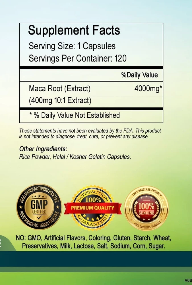 Maca Root 4000mg Serving 120 Premium Capsules Non-GMO, Gluten Free Fast Shipping Exp. Date: 18+ Months after shipping Excellent Quality Supplement Best Price Anywhere. Satisfaction Guaranteed