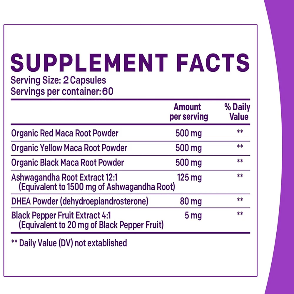 Effects: Energy & Endurance, Testosterone Booster Ingredients: Maca,Ashwagandha Directions: Take 2 capsules once daily after a meal. Shipping: Ships within 48 hours on working days. Shelf life: 2 years Description: Hormone Balance: Red, Black, and Yellow Maca Roots, and Ashwagandha all help balance and regulate hormone levels, including reproductive health, and improve symptoms of imbalances. Energy Boost: These blends have a natural energizing effect, helping to improve endurance, physical performance, and overall vitality. Helps improve the body's resilience and ability to cope with stress. Document