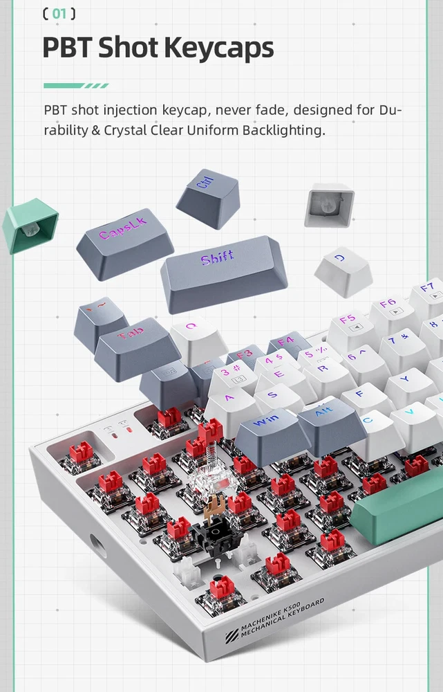 1. About packaging When the package arrives, please check whether the opposite side of the package is in good condition before signing for it. Record the unboxing video to protect your rights. 2. About review We look forward to your 5-star review. If there is a problem with the product, please contact customer service instead of low-star review. 3. About keyboard languages ·Select keyboards shipped from China, which are keycaps for US English. ·Select keyboards shipped from Russia, which are US English mixed with Russian keycaps. Features Of K500 1, 94 Keys 90% layout 2, PBT shot keycaps 3, Allow Hot-swappable 4, 20 kinds of RGB Backlit 5, All keys Anti-ghosting 6, 18 Multimedia Keys PBT Shot Keycaps PBT shot injection keycap , design for durability and crystal clear uniform backlighting Two Color To Choose 90% LAYOUT---94 Keys Design Crafted for productivity, the K500's 90% layout is a version to allows users access to all the essential multimedia and function keys, but with a smaller footprint. EXCELLENT TYPING EXPERIENCE The K500 is designed to fit your dedicated typing experience. No matter what you like, linear, clicky or a little in between, we've got you covered with three Huano switches options (Blue, Brown, Red). We want to make sure that you experience the same feedback for every keystroke. HOT-SWAPPABLE You can easily hot-swap every switch in a few seconds to customize your typing experience on the K500 without soldering. Wonderful RGB Backlight Effects The K500 features RGB lighting with 16.8 million LED colors , you can download additional lighting effects to the library and easily use them through the lighting effects driver Detachable Type-C Cable Type-C is powerful than older usd types and transfer data faster than any other USD type .