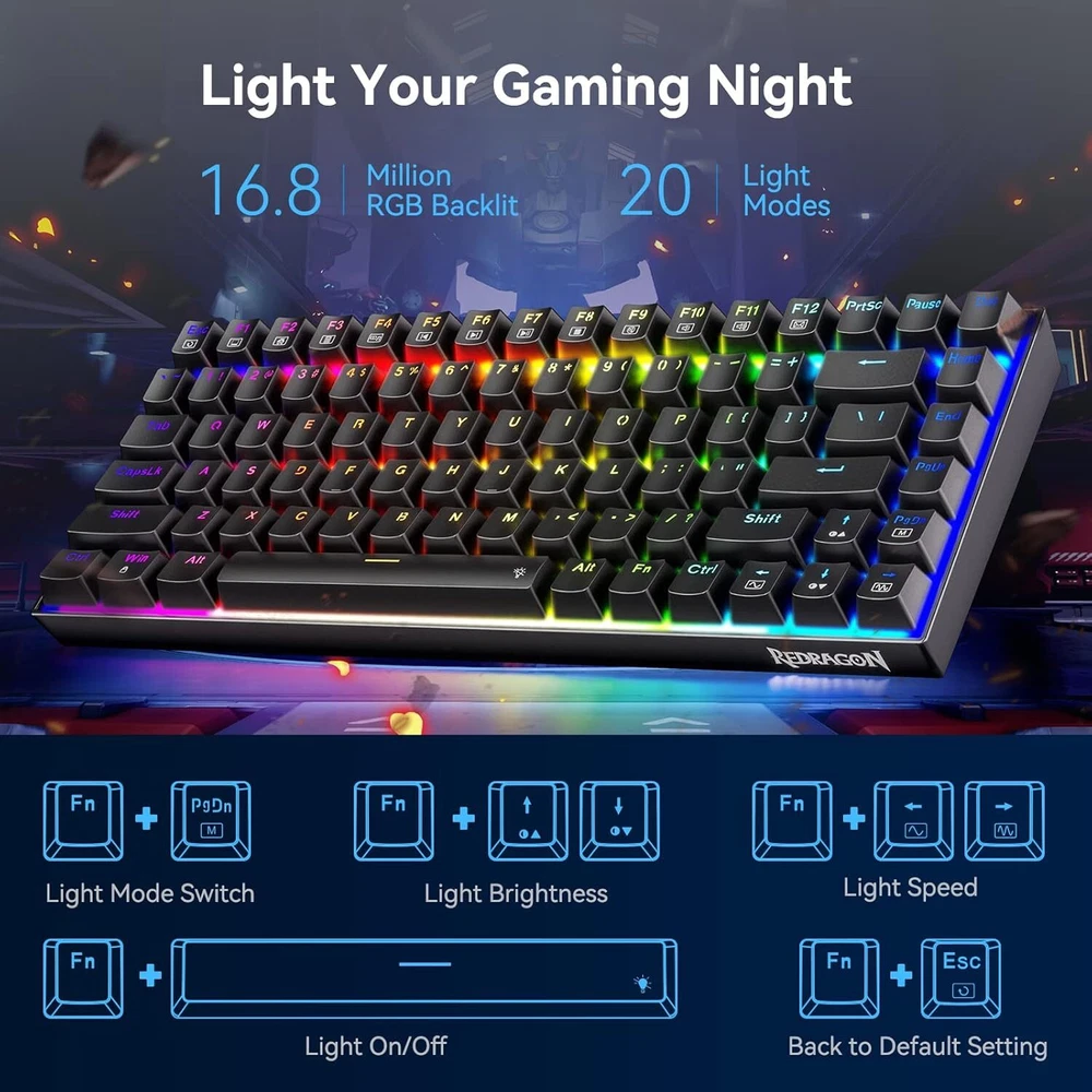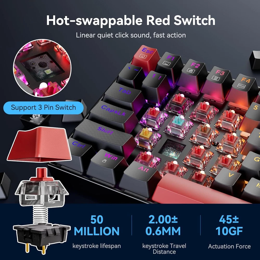 Product Description Mechanical Keyboard, Full RGB 75% Gaming Keyboard with Red Switches, Macro Editor Wired Keyboard 84 Keys for Windows Mac PC Laptop Tablet, K629-RGB đă84 KEY GAMING KEYBOARDăRedefine TKL, The innovative 75 percent keyboard unique layout, cuts more clumsy space off, support practical arrow, multimedia, and control keys.Classic red Switch offering linear feedback, quiet click sound fast action, require less force to press down and the keys feel smoother. It's best choose for gaming and typing đăFULL RGB KEYBOARDăPC gaming keyboards has 20 different RGB lighting effects, 5 self-define backlight group, 4 backlight brightness levels, breathing speed, and 16.8 million colors to light up your gaming world. You can also turn off the lights. âĄăFULLY PROGRAMMABLEă This Hot-swappable mechanical keyboard supports DIY Software, macro editing, Customizable key assignment, keybinding and backlight setting, Hot-swappable allows you to replace 3 pins switches freely without soldering issue. Enjoy the fun of making your own unique keyboard. â¨ăTECLADO MECANICO K629-RGB ă 75% Compact Ergonomic Designed Computer Keyboard for ultimate Gaming performance. 12 Multimedia keys, arrow keys, Double-shot keycaps are able to retain their texture even after heavy use. The upper cover adopts a metal panel that is splashproof, anti-rust and anti-corrosion. đăCOMPATABILITYăThe Keyboard is compatible with Windows 2000/ME/XP/03/XP/VISTA/7/8/10/11 and Mac OS system, the software for Windows systems only. Works well with all major computers brandsătablets and gaming pc . will spare no effort to provide the best service to every customer within 24 hours to help you. About Us We are a reputable seller with many years of experience selling on eBay. Our goal is to provide high-quality products and excellent customer service. Shipping Items will be shipped within 1-3 business days when we received payment. (Orders are not processed on weekends & holidays) Tracking information will be sent once item is shipped. Delivery time depends on destination and other factors Item is shipped to ebay address. Leaving correct address can minimize delay. For international shipping and shipping to Guam, Hawaii and Alaska, Please contact us before placing the order. International buyers please note: Import duties, taxes and charges are not included in the item price or shipping charges. These charges are buyerâs responsibility. We will try our best to reduce the risk of the custom duties. Local pick-up is unavailable at the moment. Contact Us We reply any email messages within 1 business / working days(off-duty at weekend). If you do not get a response from us, then please check your junk or spam mailbox. Our Business hours: Mon-Fri 9:00-18:00, UTC/GMT +8 hours. Please contact us either by clicking "contact seller" in the "purchase history" section or simply click "ask a question" at the bottom of this page. If you are unsatisfied with our item or service, please contact us before leaving any feedback. We are committed to resolve all issues in a friendly and satisfactory manner.