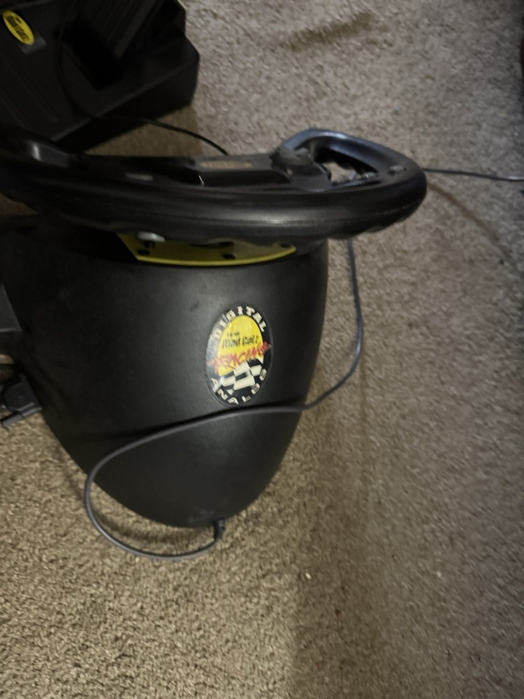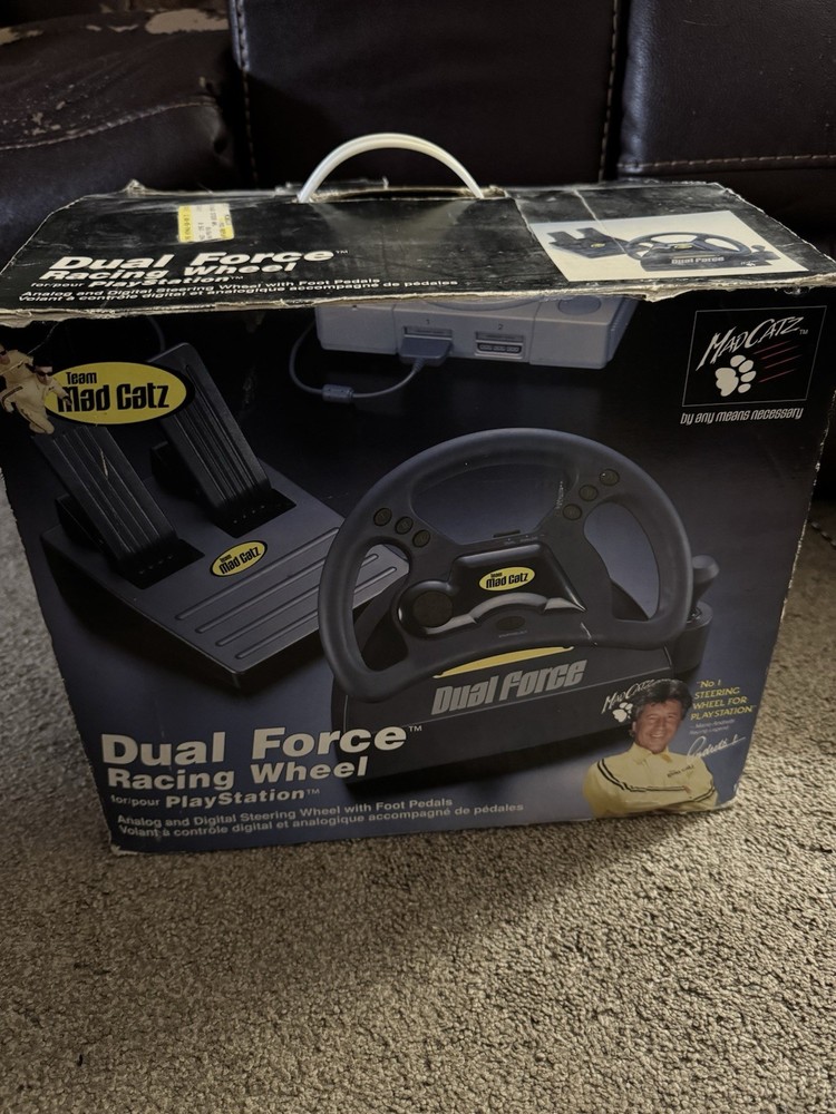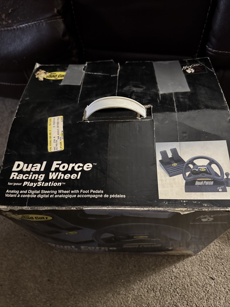 Get ready to take your racing game to the next level with the Mad Catz Dual Force Racing Wheel & Pedal for PlayStation PS1. This black and yellow racing wheel is compatible with Sony PlayStation 1 and comes with a 5ft. cable for easy connectivity. Made of rigid plastic, this wired controller is perfect for solo play and features a wheel for a realistic racing experience. The Mad Catz Dual Force Racing Wheel & Pedal is a vintage game accessory that was manufactured in the United States in 1998. This racing wheel is perfect for gamers who want to add a classic touch to their gaming setup. It comes in its original box and is compatible with consoles, games, and accessories. Add this unique piece to your collection today! Not tested