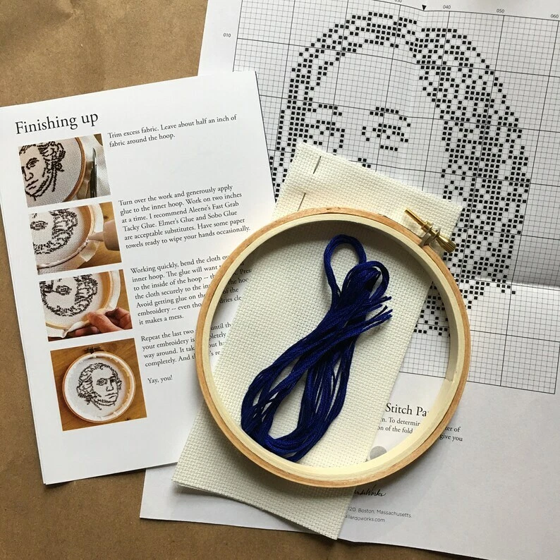 Handmade Materials: zweigart fabric, basketweave fabric, tapestry needle, finishing instructions, embroidery hoop, grid pattern Create your own counted cross-stitch portrait of Kamala Harris. Each kit includes Zweigart cross-stitch fabric, a 5-inch wooden embroidery hoop, one tapestry needle, a grid pattern, 6-strand embroidery floss, and instructions for cross-stitching and finishing the project. The embroidery floss is blue. It takes about 3-6 hours to complete this project, depending on your experience with counted cross-stitch. Please note that this is a COUNTED CROSS-STITCH project. The fabric included in the kit is blank.