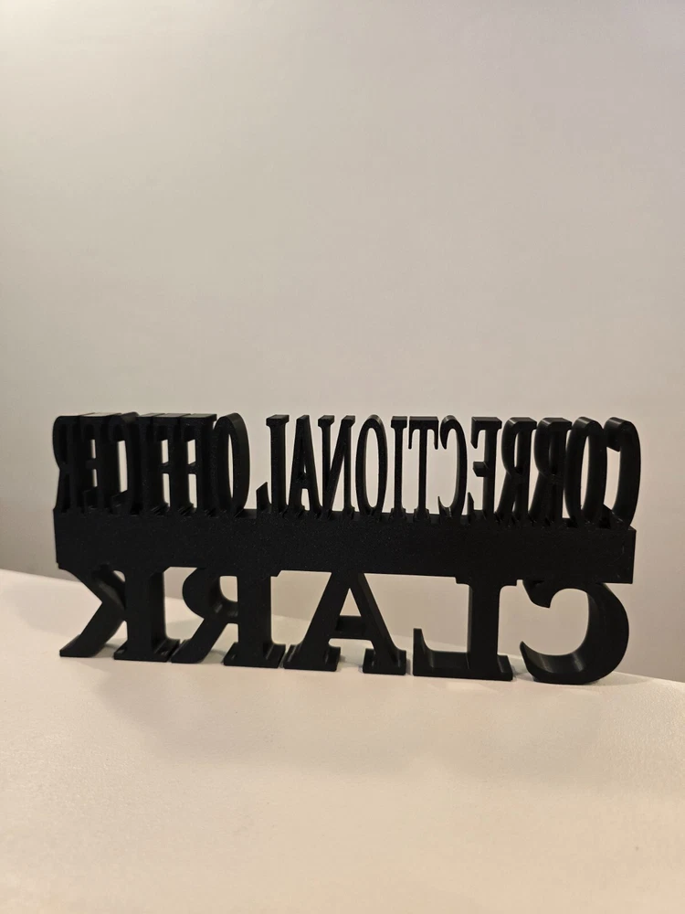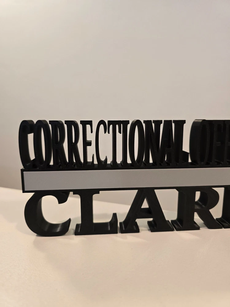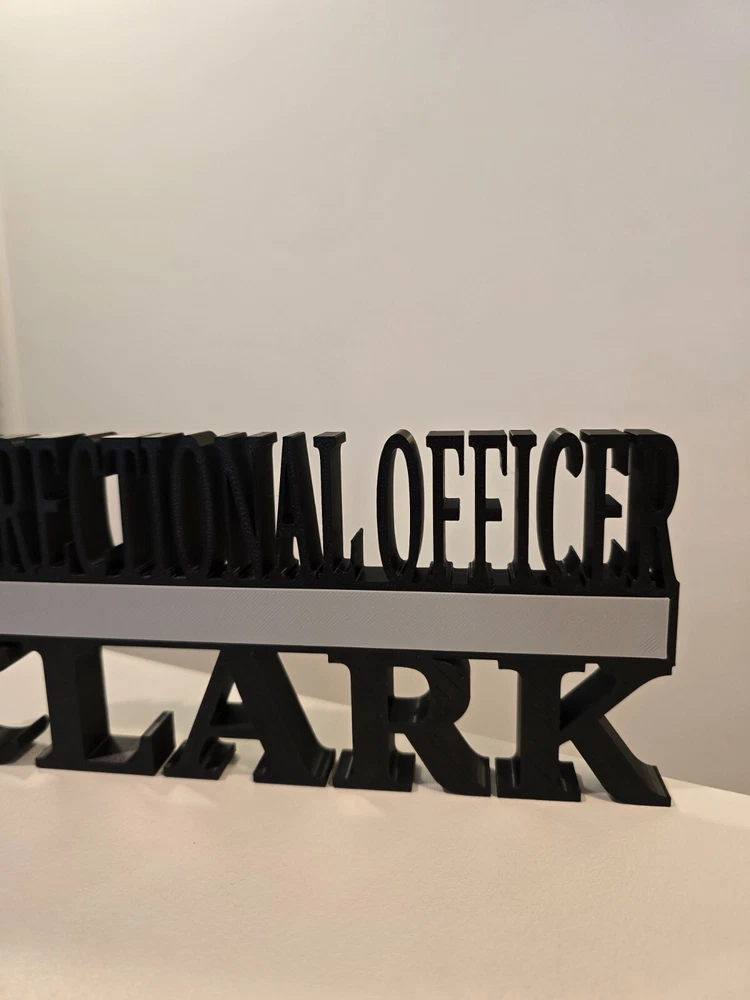Thin Gray Line Corrections / Correctional Officer Desk Name Plate Custom Rank and Name This is a cool 3D printed name plate made for desks at the office or at home. This is made out of strong PETG HF filament to ensure it does not deform or melt, staying strong and sturdy for years to come. I am able to do any custom rank or name you would like. I will customize the text, create it, permanently secure everything together (name plate and thin gray line insert), and ship it out. These are a great way to show your support for any law enforcement, corrections, friends or family, you may have, or an excellent gift for promotions. If you have any questions or would like a quote on something else 3D printed, please message me. When you purchase, you will have the option to personalize the rank and name you would like on your item! MADE IN THE USA Dimensions: 8.5"L x .5"W x 4"H