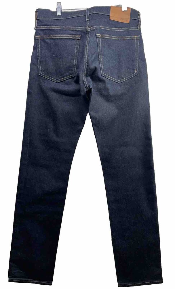 Elevate your denim game with these Madewell by J. Crew Men's Slim Denim Jeans. The dark wash cotton blend fabric exudes a classic American style that never goes out of fashion. The selvage fabric type adds a touch of sophistication to the jeans, making it a perfect fit for any occasion. Featuring a mid-rise waist and straight leg style, these jeans are slimming and comfortable. The zip closure provides a secure fit, and the 32-inch inseam ensures it fits perfectly on a size 30 waist. These jeans are perfect for any fashion-forward man who wants to make a statement with his style.