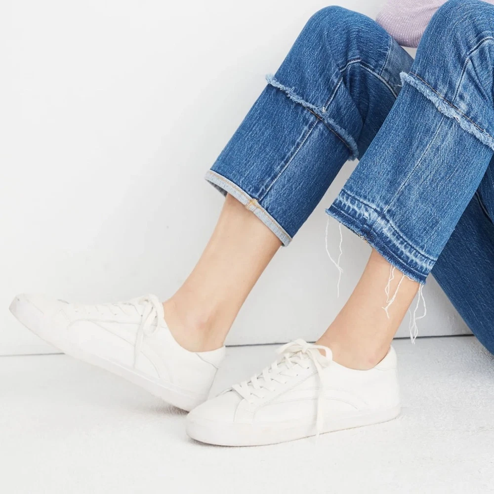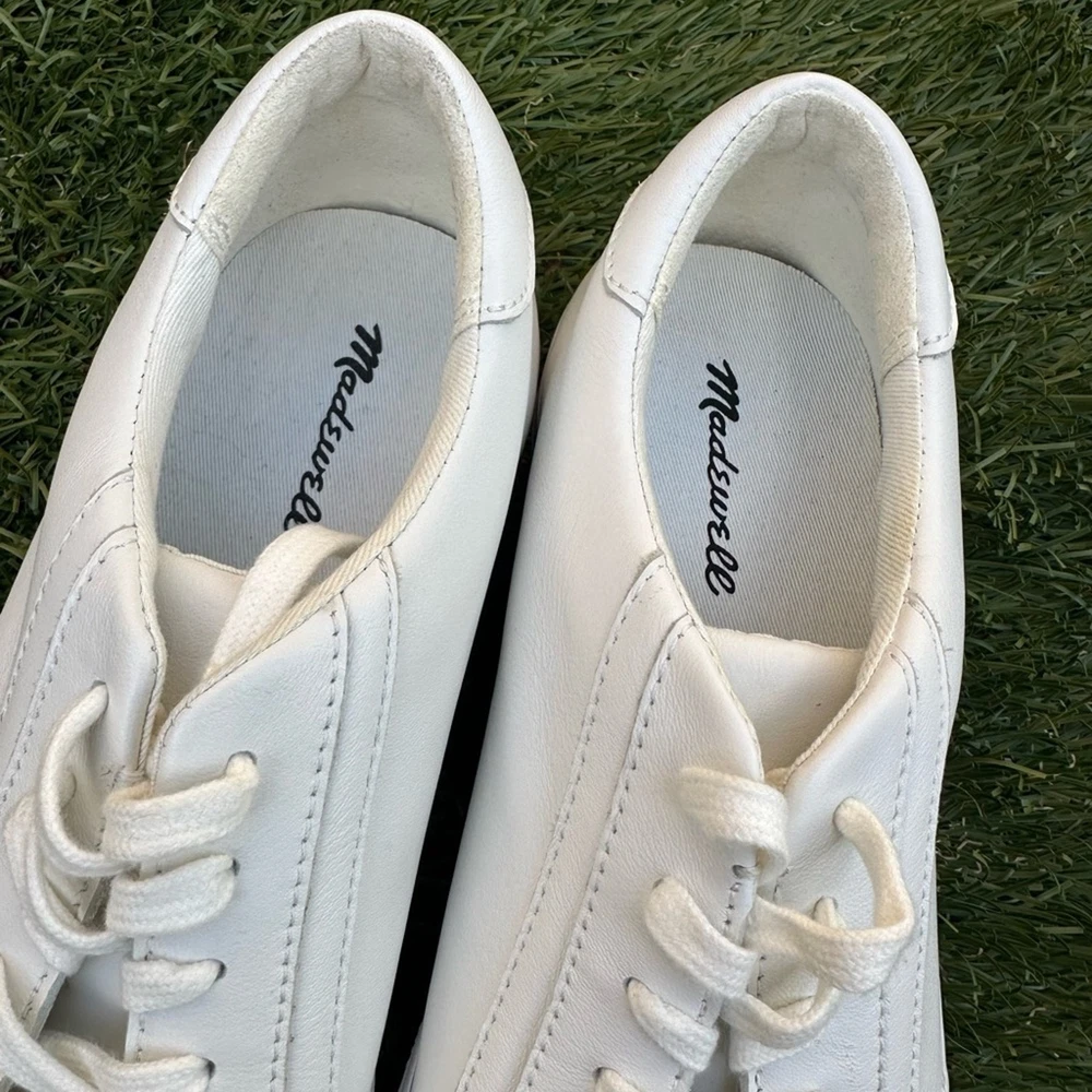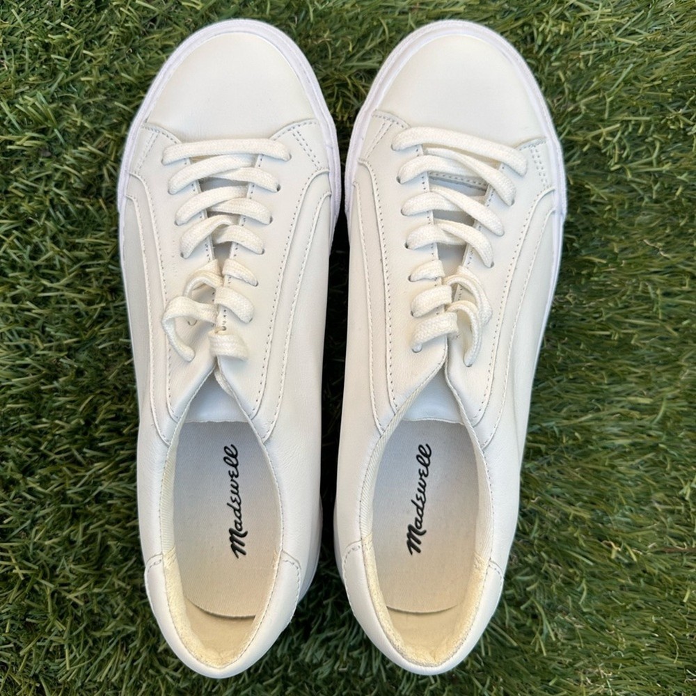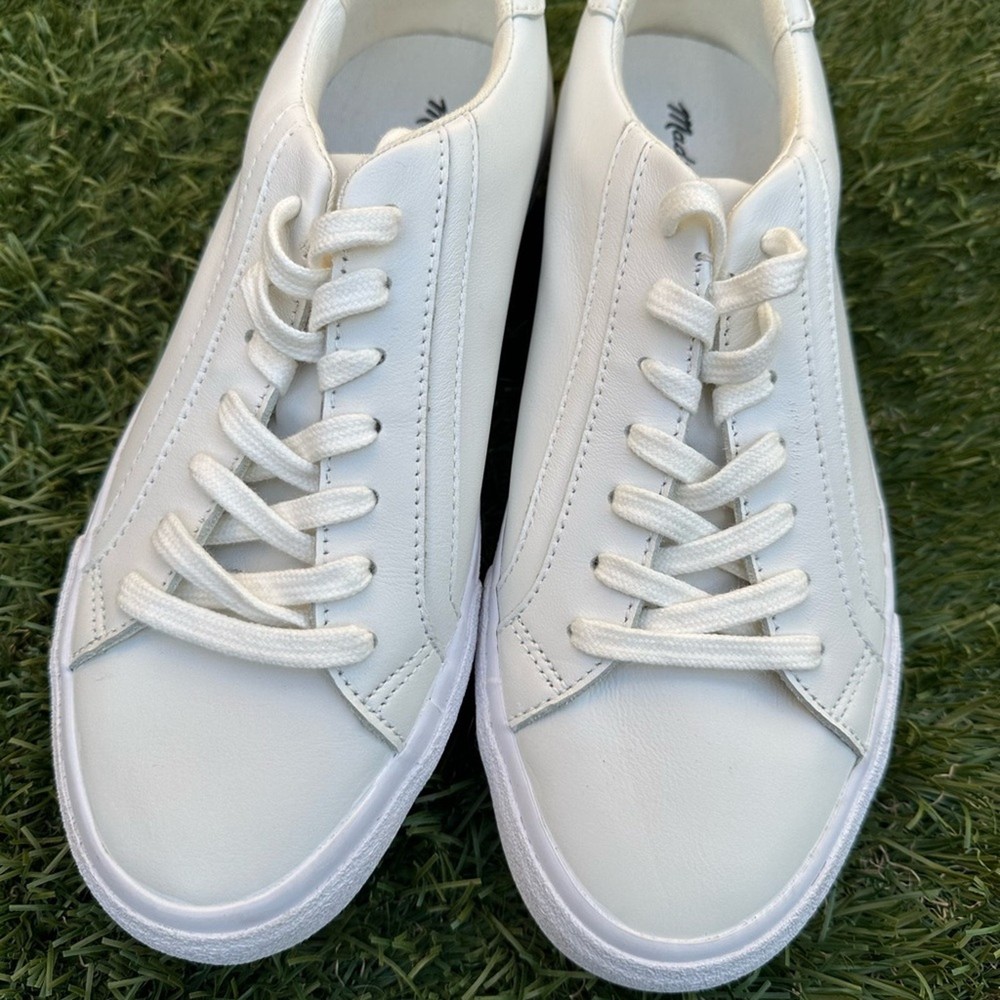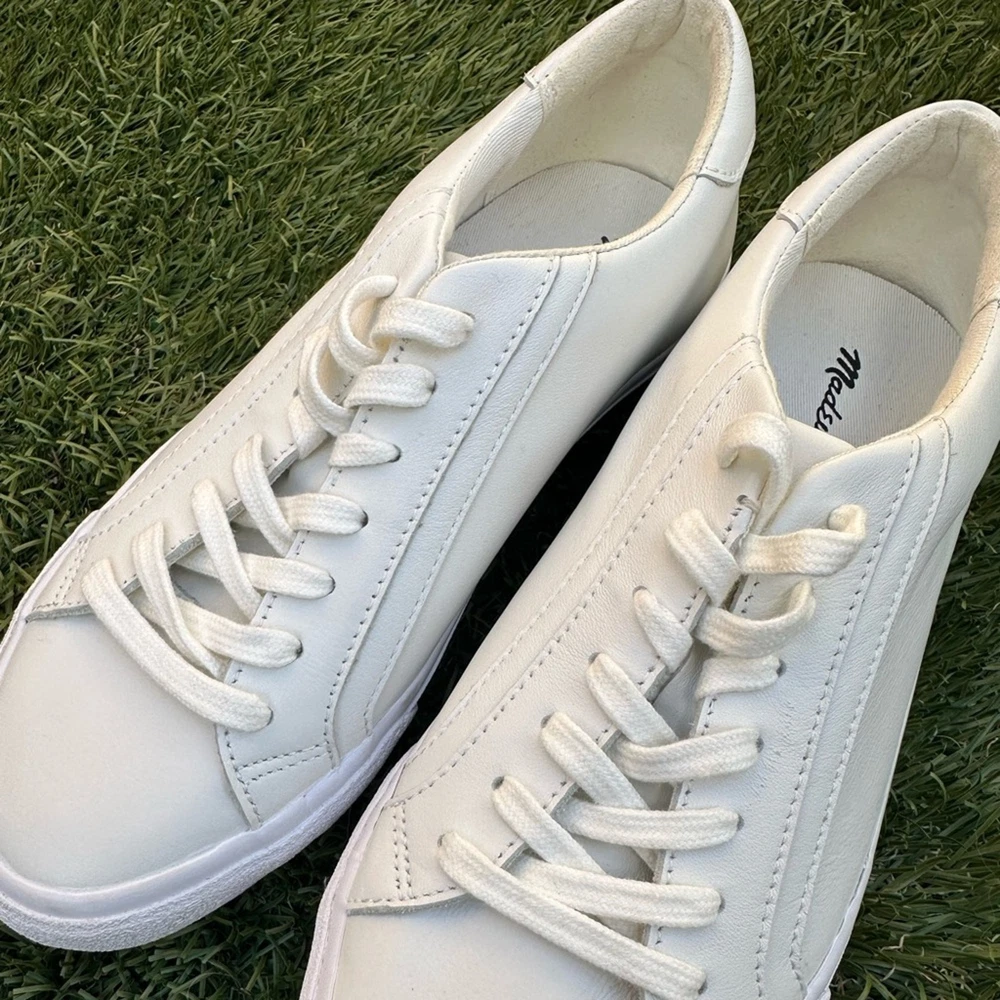 NWT pair of Low Top Lace Up Sneakers by Madewell Style is the Sidewalk Low Color is Pale Parchment (white) Color 8.5 in women Brand new, never worn. Tags still attached to the bottom of the shoes. From the website: “We designed our sneakers with the idea that shoes should be comfortable from the get-go. Made of rich leather, these low-tops have MWL Cloudlift insoles for a supercushy, ultrasupportive fit that feels like walking on a... well, you know… Give a classy look to your every step, made of genuine leather, neutral colorways, and minimalist design for versatile styling options”