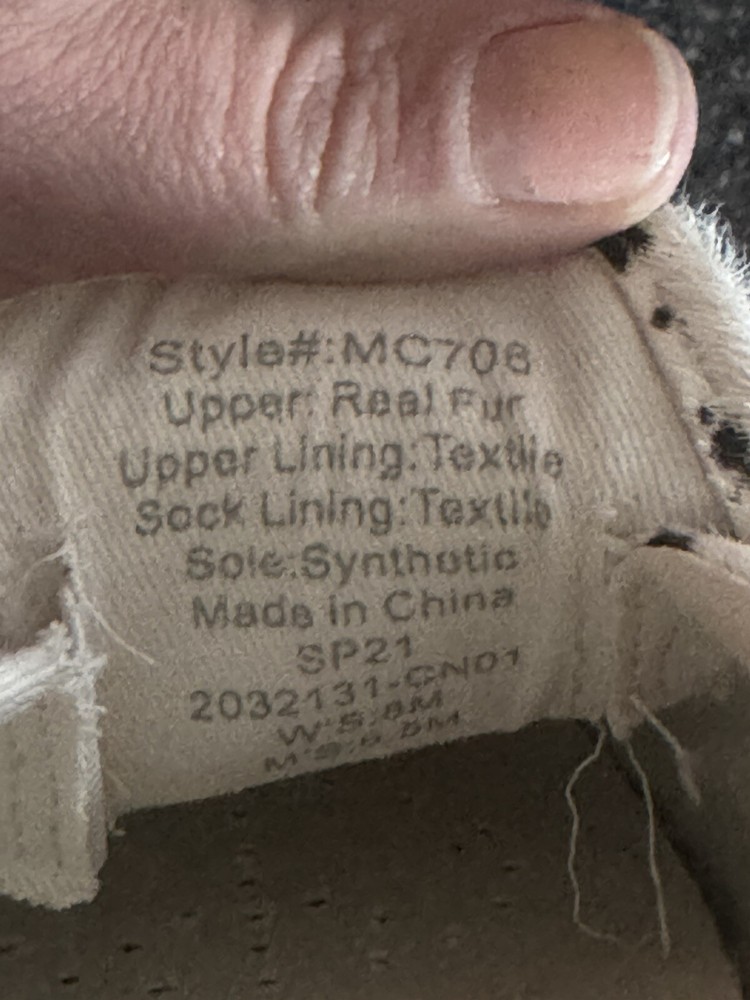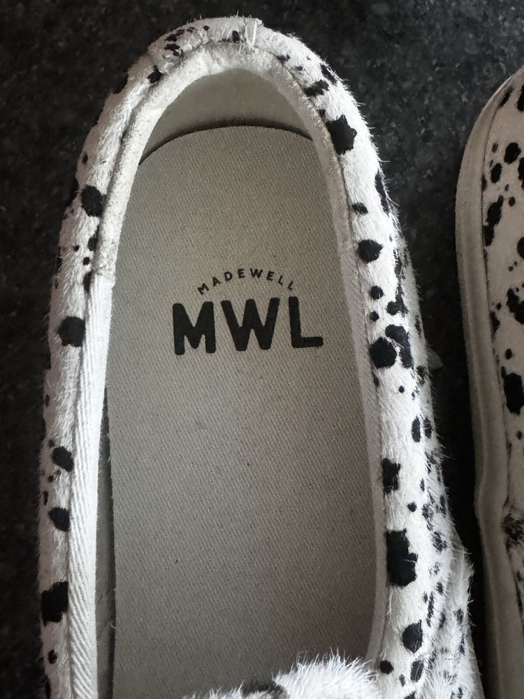 The product is a pair of Madewell slip-on sneakers for women in size 8. They feature a low top style with a white and black animal print design made of real fur. The shoes have a round toe shape, slip-on closure, and a flat heel. The outsole is made of rubber, and the lining material is cotton, making them suitable for casual wear and walking.