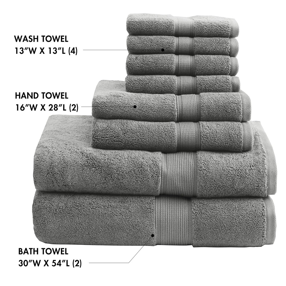 800GSM Bathroom Towel Set of 8 100% Cotton Bath Towel Set for Bathroom Luxurious Highly Absorbent 2 Bath Towels 2 Hand Towels 4 Washcloths Quick Dry Spa Quality Grey Oversized 30x54" Luxury towel 100% cotton Low lint Colorfast 800gsm bath towel 700gsm hand and wash towels Spa inspired density 100% cotton 2 Bath:30x54" (2) 2 Hand:16x28" (2) 4 Wash:13x13" (4) MACHINE WASH COLD, GENTLE CYCLE, AND SEPARATELY. DO NOT BLEACH. TUMBLE DRY LOW, REMOVE PROMPTLY, DO NOT IRON. IF THERE IS NO FREE MOVEMENT IN THE WASHER OR DRYER, USE LARGE CAPACITY COMMERCIAL WASHER/DRYER. Shipping We offer FREE shipping on all orders! We ship within Three business days of payment, usually sooner. We use a selection of shipping services such as UPS, FedEx, USPS etc. We only ship to the lower 48 states, no APO/FPO addresses or PO Boxes allowed. Local pickups and combined shipping options are not provided at this time. Return You can return a product for up to 30 days from the date you purchased it. Any product you return must be in the same condition you received it and in the original packaging. Please keep the receipt. Payment We accept payment by any of the following methods: PayPal Please pay as soon as possible after winning an auction, as that will allow us to post your item to you sooner! Feedback Customer satisfaction is very important to us. If you have any problem with your order, please contact us and we will do our best to make you satisfied. Contact Us If you have any queries, please contact us via ebay. We usually respond within 24 hours on weekdays. Please visit our eBay store to check out other items for sale! Thank you for shopping at our store.