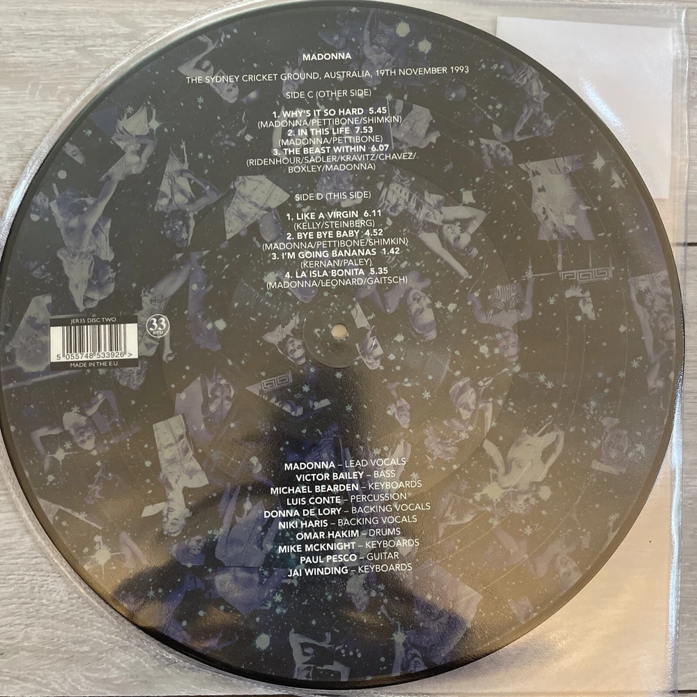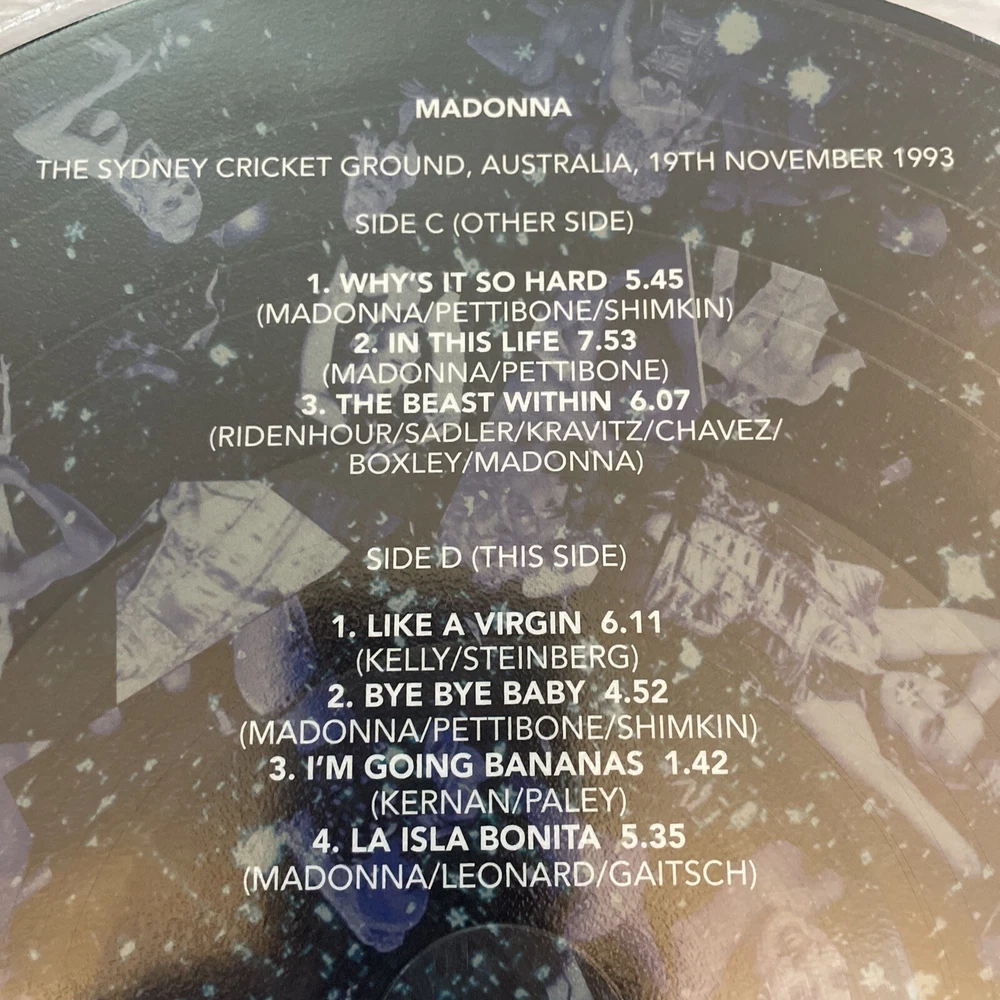 Madonna. The Girlie Show at The Sydney Cricket Ground. 2LP Picture Disc This is a limited edition 2LP vinyl picture disc of Madonna's "The Girlie Show" album. The record features hit singles like "Vogue" and "Venus", and is a must-have for fans of dance pop music from the 1980s and 1990s. The vinyl material is of high quality, with a record grading of Mint (M) and a sleeve grading of Mint (M). The album is a Reel To Reel record label release, with a release year of 2023. The record size is 12 inches, and it comes with a picture disc and coloured vinyl features. This item is perfect for collectors and fans of Madonna's music, and is a great addition to any vinyl record collection. Madonna. The Girlie Show Live in Australia 2 LP Vinyl Picture Disc. Limited Edition. RECORD ONE SIDE A 1. THE GIRLIE SHOW THEME 1.05 2. EROTICA 5.59 3. FEVER 4.54 4. VOGUE 5.31 SIDE B 1. RAIN 9.57 2. EXPRESS YOURSELF 5.15 3. DEEPER AND DEEPER 7.25 RECORD TWO SIDE C 1. WHY’S IT SO HARD 5.45 2. IN THIS LIFE 7.53 3. THE BEAST WITHIN 6.07 SIDE D 1. LIKE A VIRGIN 6.11 2. BYE BYE BABY 4.52 3. I’M GOING BANANAS 1.42 4. LA ISLA BONITA 5.35