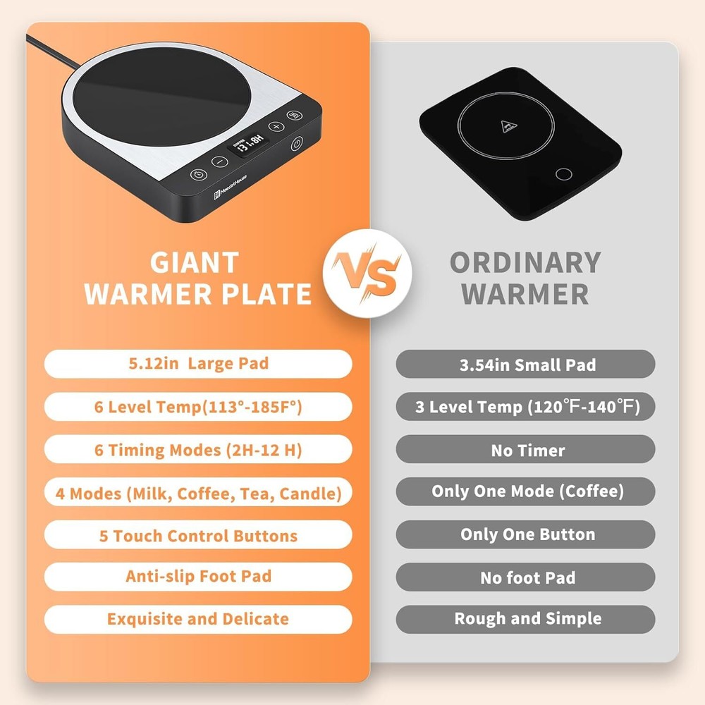 Customizable Temperature Control: Enjoy your favorite beverages at the perfect temperature with our Coffee Warmer featuring multiple temperature settings. Easily switch between temperatures ranging from 104℉ to 185℉ to find your ideal heat level according to 4 different modes. Discover the ideal temperature tailored specifically for different materials. 6-Level Timing & Auto Shutdown: Our coffee cup warmer comes with a convenient 6-level timer function, allowing you to set it for any duration between 2 to 12 hours. By default, it has an automatic shutdown time of 8 hours. You can easily adjust the timer according to your preferences, ensuring the perfect warmth for your coffee. It will automatically turn off when the set time is reached, eliminating any concerns about forgetting to close it. Intelligent Temperature Control: This coffee cup warmer maintains a consistent and precise temperature, preserving the flavor and aroma of your favorite coffee for a delightful experience with every sip. Versatile Compatibility: Our coffee mug warmer is designed to work seamlessly with a wide range of cups, including flat cups and mini coffee pots. Whether you have a glass, ceramic, metal, or other material cup, our beverage warmer is perfect for heating tea, coffee, and even flameless scented candles, providing versatile functionality. Compact Design & Practical Gift Option: With its sleek and compact design, coffee mug warmer seamlessly blends into any environment, adding a touch of elegance to your coffee-drinking experience. Perfect as a gift for coffee lovers, the coffee cup warmer combines functionality and style, making it an ideal choice for home or office use. Product Description Custom Warmth, Anytime, Anywhere 2-12 Hours Keep Warming Precise 5 Tem Control Options Designed for Multiple Usages Your Cups, Our Heat: Universal Warmer Elevated Warmth: Innovative Heat Board How to Use
