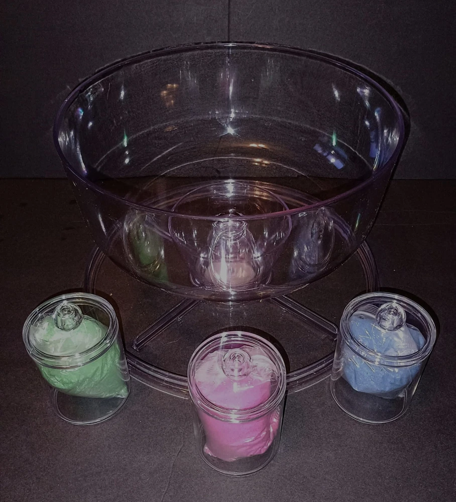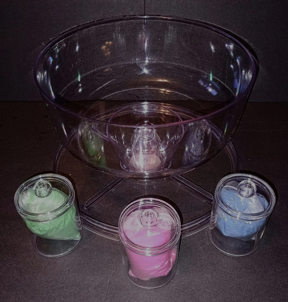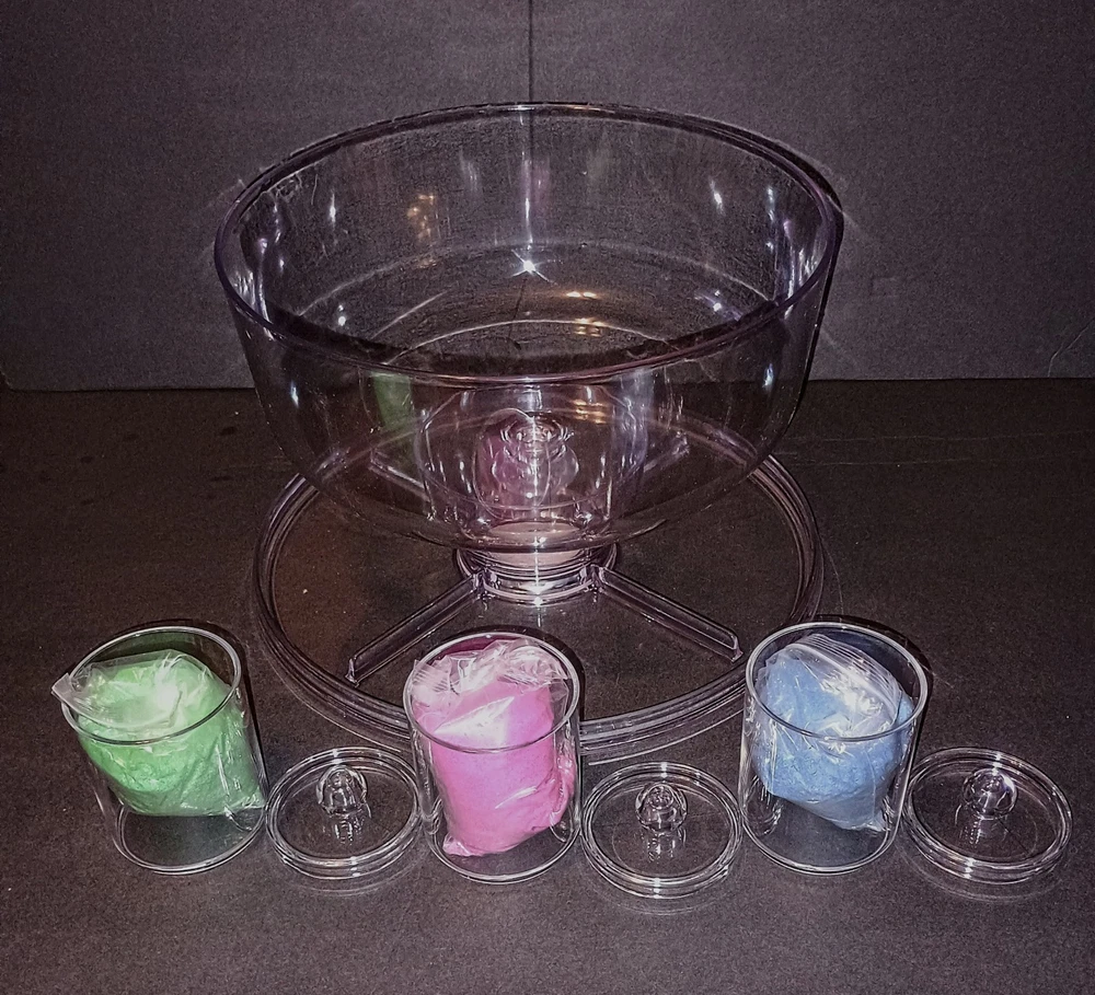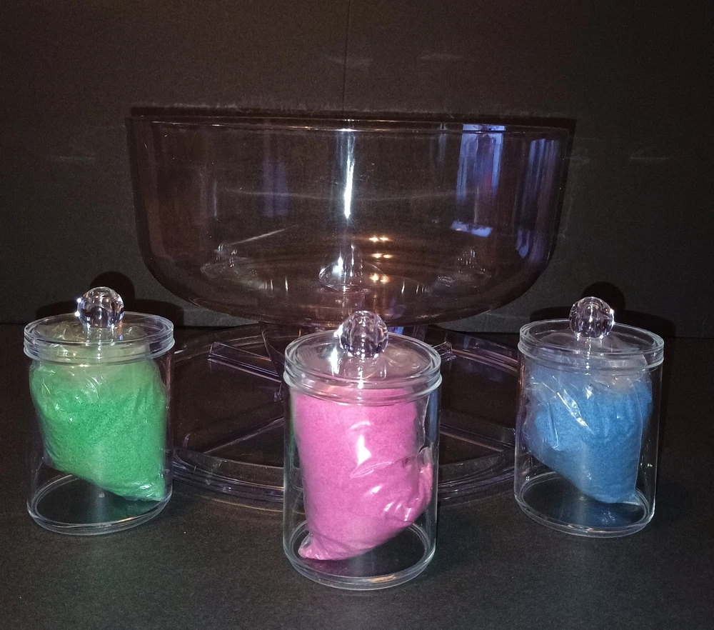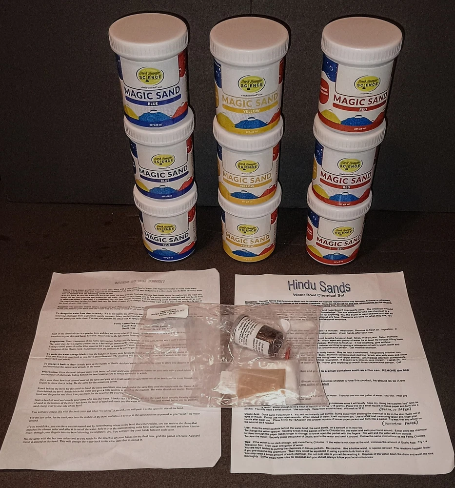 Here is another GREAT FIND that I have come across! This fully complete set of the Magic Trick Sands Of The Desert appears brand new and unused. Dive into the world of magic with this incredible set that will leave your audience in awe. Perfect for collectors and magic enthusiasts alike, this set is a must-have addition to any collection. Ready Use as soon as You Receive it! Everything Looks New and Unused! * Quality Acrylic Water bowl and Pedestal * 4-Quality Acrylic Sand Containers * 3- 8 ounce Practice Magic Sands (Retails $7x3=$21) * 9- 8 ounce (Red, Yellow & Blue) Magic Sands (Steve Spangler Magic Sands Retails $8x9 =$72) * Black Water Clear Water Chemical Set (Retails $15) Shipping is a bit more due to the weight of all the Sand.
