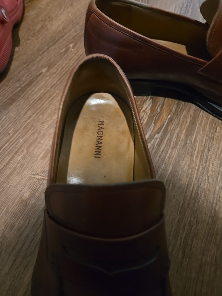 The Magnanni 11333 Men's Brown Leather Apron Toe Italian Loafers are a stylish and sophisticated choice for men looking to elevate their formal footwear. These slip-on loafers feature a classic round toe shape and are crafted from high-quality leather, providing comfort and breathability. The brown leather material with penny accents and a solid pattern make them versatile for various occasions, whether it be a wedding, going out in the city, or a special event. Made in Spain by the renowned brand Magnanni, these dress shoes combine luxury and elegance to make a statement. Bottom rubber is starting to come off a little.
