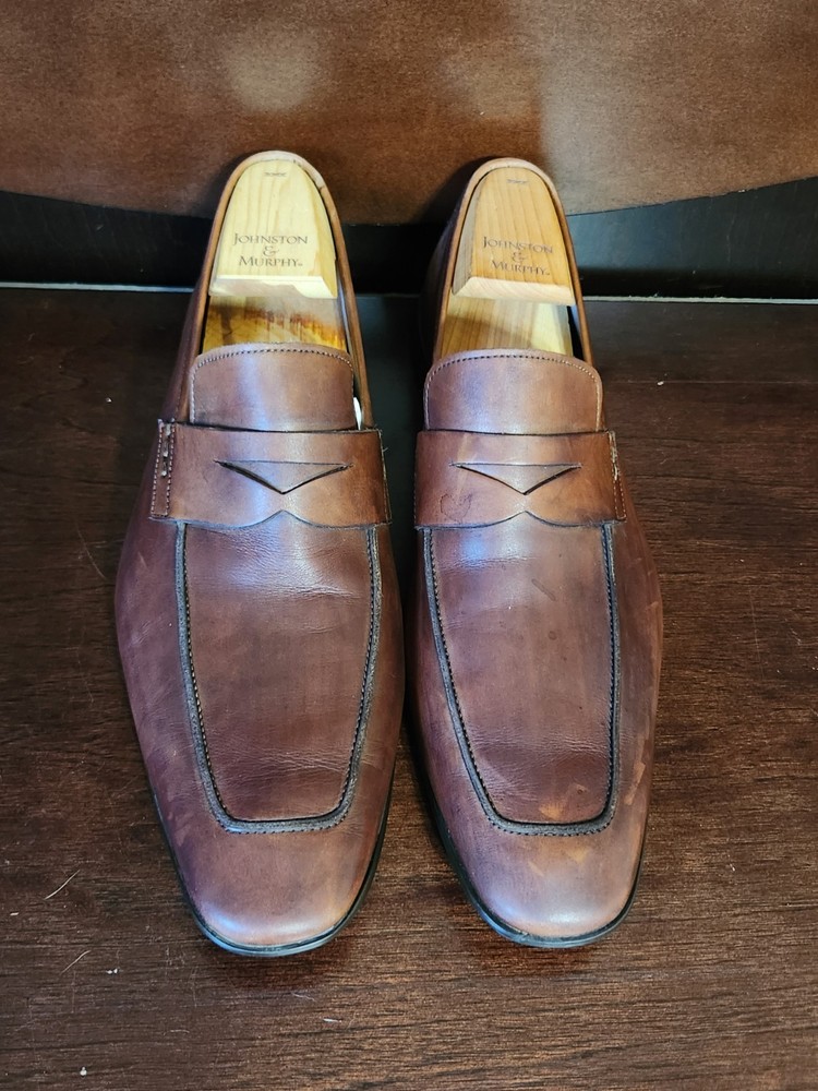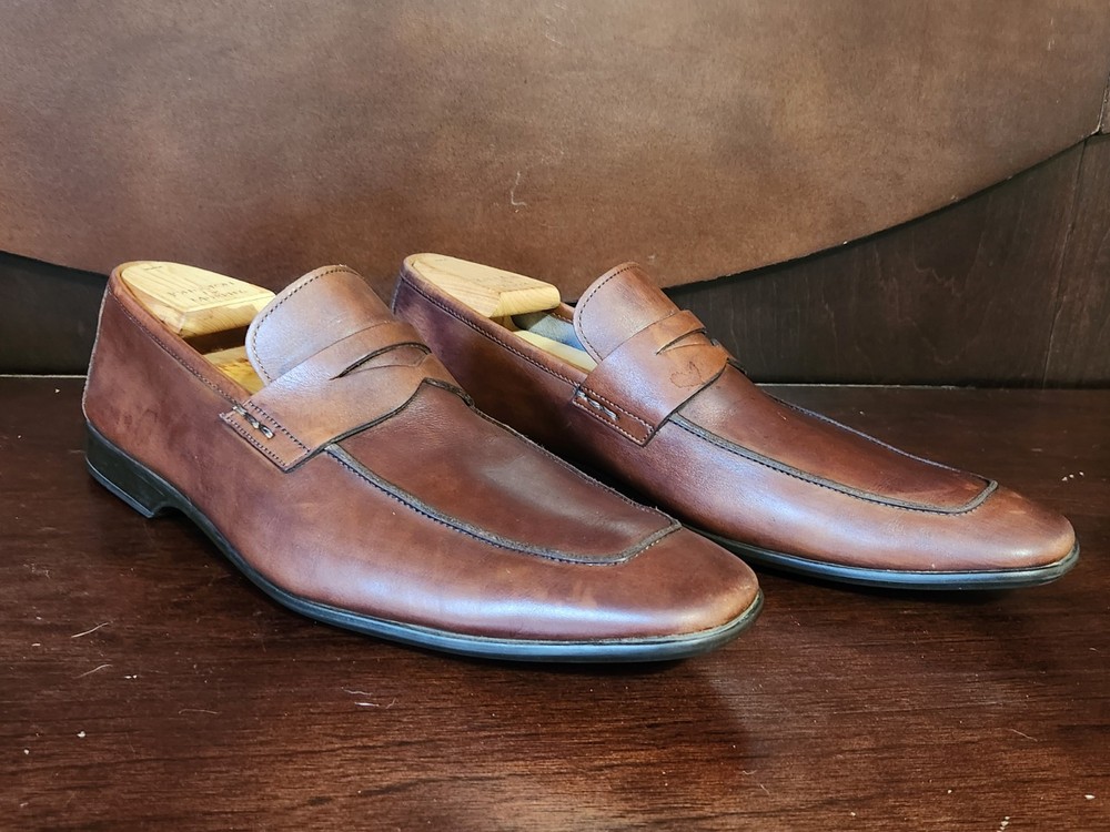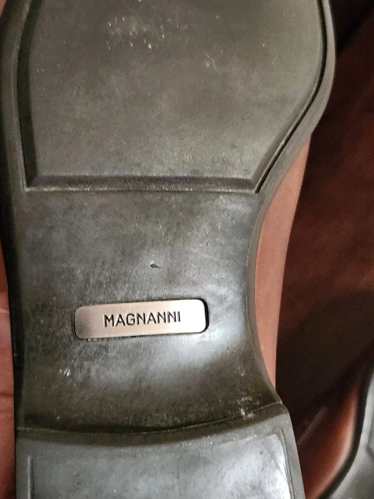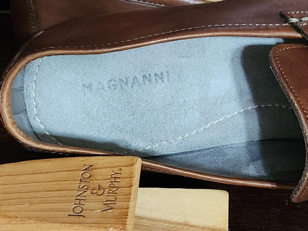 The Magnanni Ramiro II Mens Penny Loafers in size 10M are stylish brown slip-on shoes with a square toe shape. Made of leather with a comfortable leather lining, these loafers feature the signature logo accents and are perfect for the summer, fall, and spring seasons. Crafted in Spain, these luxury shoes are designed for the executive and resort-themed occasions, exuding a sense of elegance and sophistication. The outsole made of rubber ensures durability and stability, making them a versatile and fashionable choice for men's formal dress. Please see pics for condition and details before purchasing. SHOE TREES ARE NOT INCLUDED IN THE SALE.