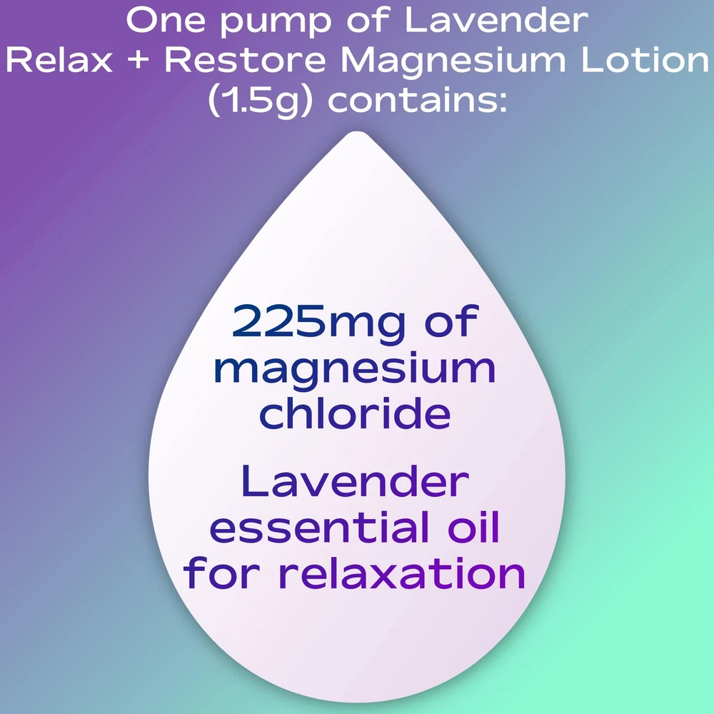 Anti-inflammatory and deeply healing, magnesium lotion is specifically formulated to deliver active nourishment for smooth, glowing skin and optimize magnesium absorption for whole body wellness. You might wonder why magnesium is so important. The essential mineral can help benefit overall wellness, from sleep to energy, and can help positively impact areas like heart, nerve, muscle, and lung . But about half of us miss out on getting enough magnesium in our diets. With , your body gets a daily healthy dose of magnesium to soothe your skin and your spirits. Made in the USA. Women Owned Business. MORE THAN A LOTION: Technology with real results, we are the only magnesium lotion with innovative permeation technology that optimizes magnesium delivery to the skin. THERAPEUTIC SKIN REPAIR WITH ADDED BENEFITS: Magnesium infused lotion with shea butter and cocoa butter absorbs quickly and is non-greasy. This ultra nourishing lotion soothes, softens and heals dry skin and supports overall skin . Pure 100% U.S.P. Magnesium Chloride. Delivers 225 mg per pump. PREMIUM NATURALLY DERIVED INGREDIENTS: Naturally Derived. Free of mineral oil, parabens, phthalates, silicone, sulfates and artificial fragrance. Gluten-free, vegan and cruelty-free. Women Owned and made in the USA. REST + RESTORE: Calming and soothing effects of magnesium and fragrant lavender essential oils team up to promote deep relaxation and sleep. HOW TO APPLY: Apply to skin morning and night as needed. Cover any areas needing special attention. Use after a warm shower or bath when pores are open to increase absorption. GIVE THE GIFT OF : skincare products make the perfect Stocker Stuffer, Christmas gift, Mother's Day gift, or "just because" gift for mom.