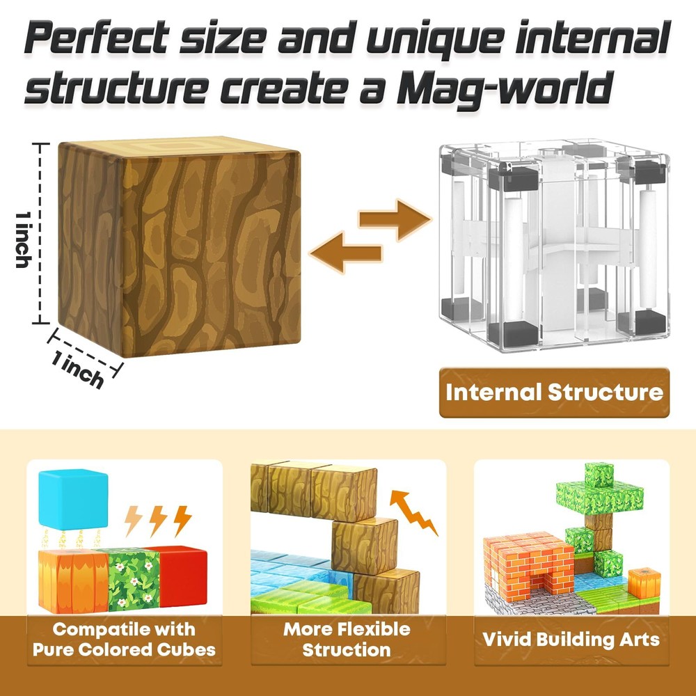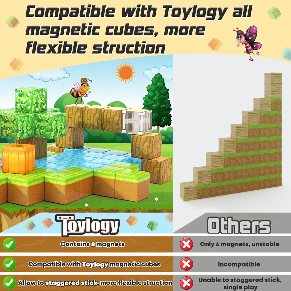 【BRING PUMPKIN MINE MAGNET WORLD TO LIFE】 Step into the thrilling pumpkin themed blocks of magnets! Construct a pumpkin fortress to protect kingdoms and battle monsters with role-play fun. Experience the endless construction possibilities of the pumpkin house, unleash a dream world of creativity. Toylogy blocks with 8 magnets, more stable, and flexible compared to other 6 magnets inferior blocks, and compatible with other 1IN blocks , also an expansion set that kids can add to expand your existing mine magnet world. 【KIDS GAMES MADE REAL】Combining the science of UV technology and magnetism which make your building arts more vivid and realistic than those of simple pure colored cubes, this magnetic blocks set offers a wealth of patterns. Pretend to grow pumpkins or harvest them or build your own pumpkin castle fortress, and add spooky decorations, defend kids’ castle from the witch dolls attacks. Ignite your kids' creative passion and enjoy hours of role-play fun! 【TODDLER LEARING GIRL BOY TOYS】Allow toddlers to successfully stick together, kids will not get frustrated by failed to build, and help kids gain a deeper understanding of the structure world and learn about magnetic properties. This magnetic blocks are sealed to keep the cubes from breaking. From building, destroying, to rebuilding, it allowing them to last for years. Recommended for toddlers and 3-8 years old children toy gift. 【STEM SENSORY & EDUCATIOANL TOYS】Creativity explodes when kids begin to play with well-designed building toys. Magnetic blocks are a must for your toy list. Encourage kid’s creativity, spatial awareness, and problem-solving skills. With vibrant colors and diverse design, magnetic blocks provides endless opportunities for young kids to explore and construct various structures. 【UNIQUE GIFTS FOR KIDS OF ALL AGES】Spark joy and imagination with our magnetic toys that bring endless fun and excitement. Whether it's for trick-or-treating, a Halloween party, or just everyday play and school activities, this magnetic toys is the ultimate building toys.Ideal for classroom,toddlers, preschoolers, teenagers, 3 4 5 6+ years old boys and girls. It is an eye-catching and festive gift to any Halloween-themed or Easter, birthdays, Christmas event.